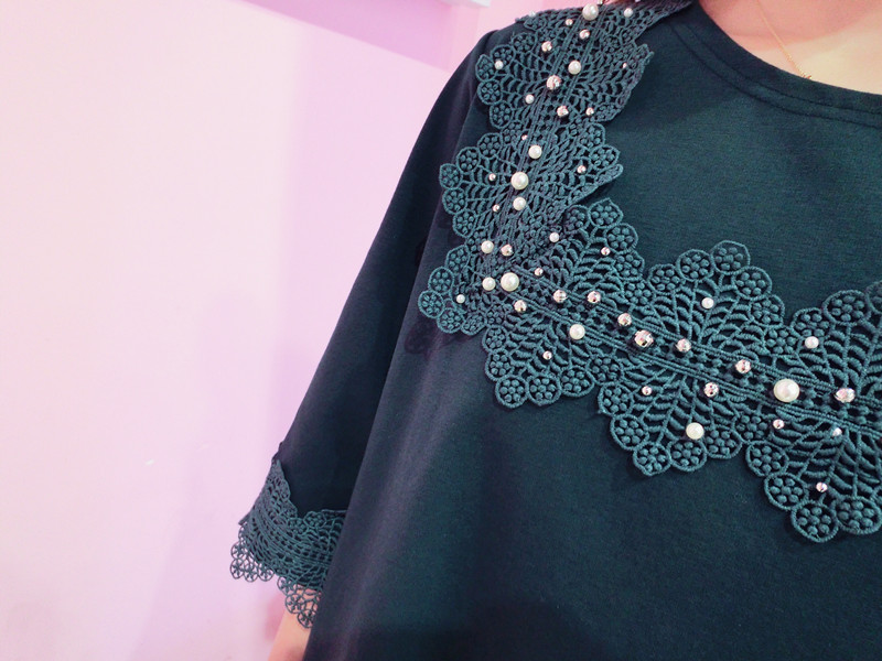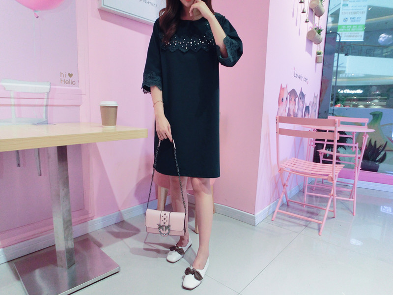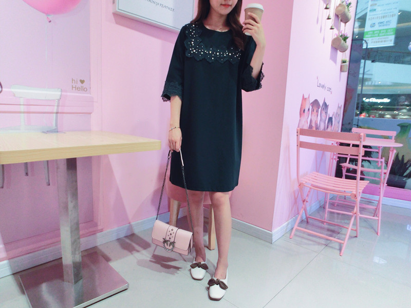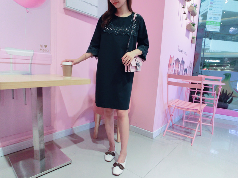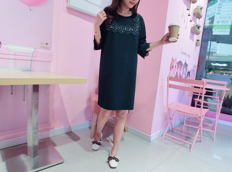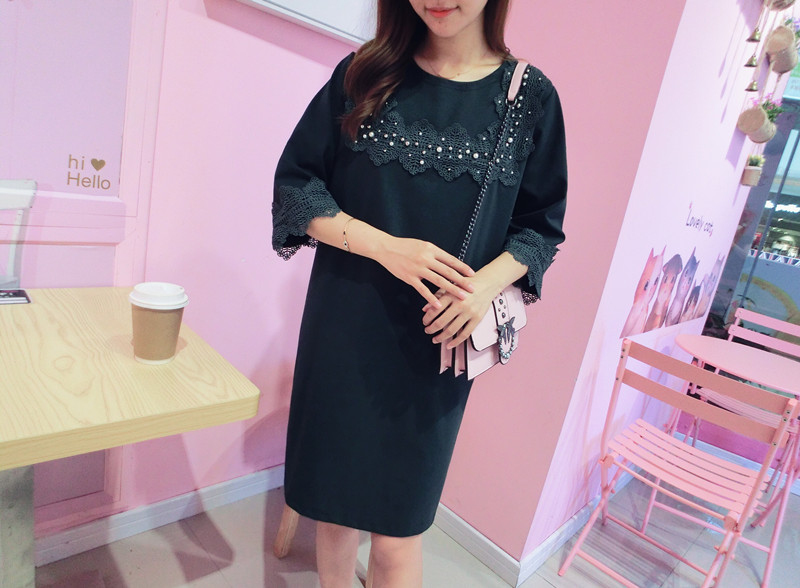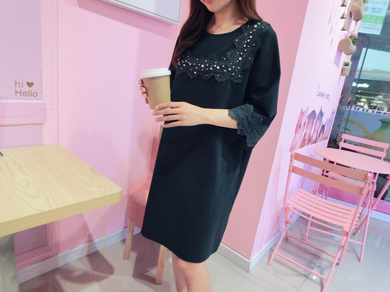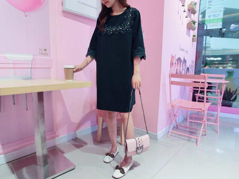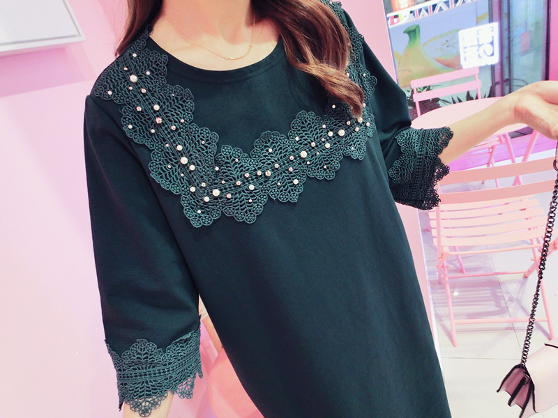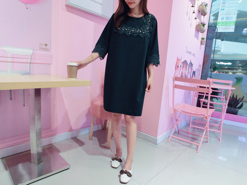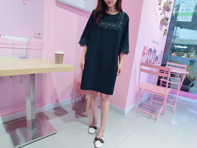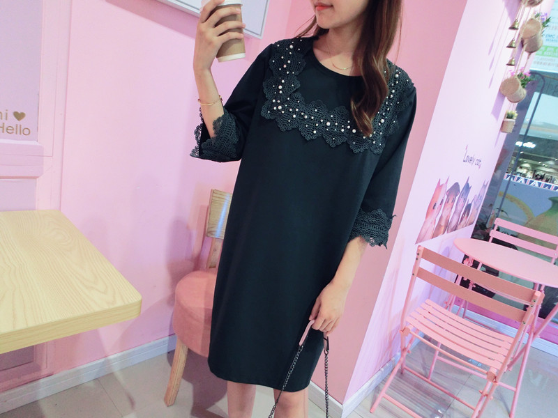 2019春夏新款韓版寬松中長款短袖蕾絲花邊拼接連衣裙女1入