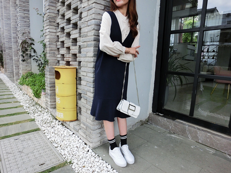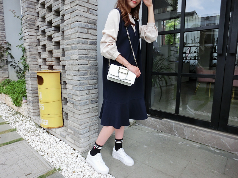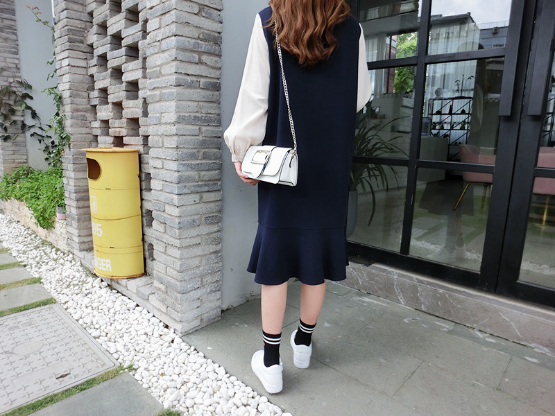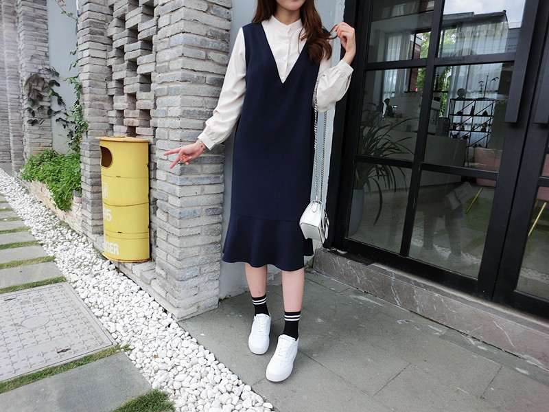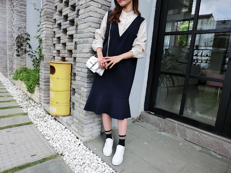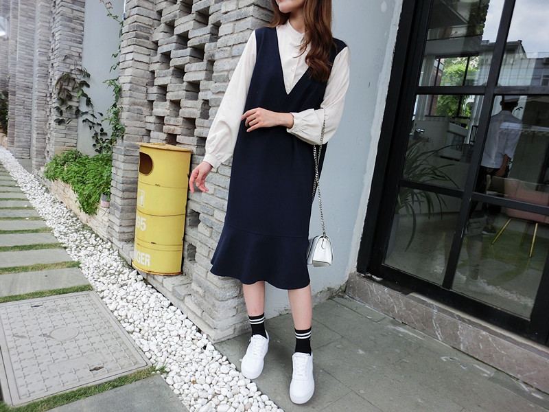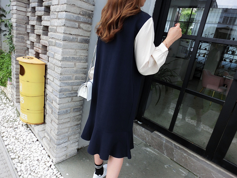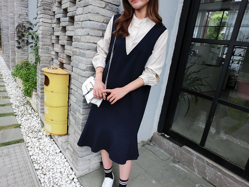 2019春季新款拼接襯衣假兩件荷葉邊裙中長春秋韓版時尚連衣裙1入