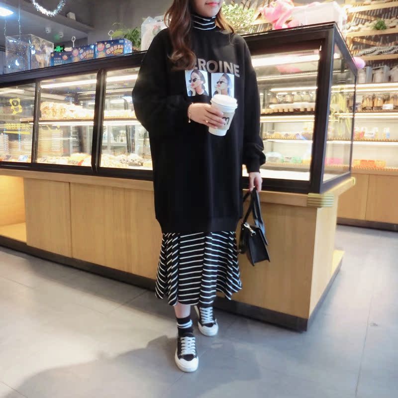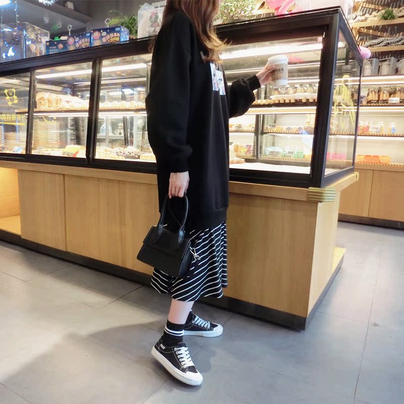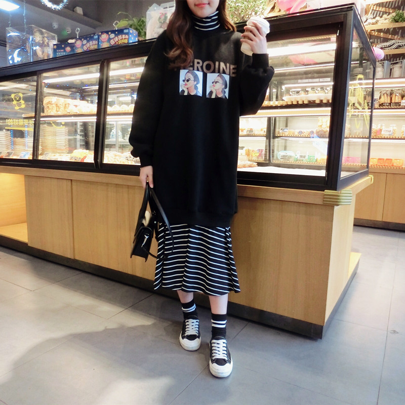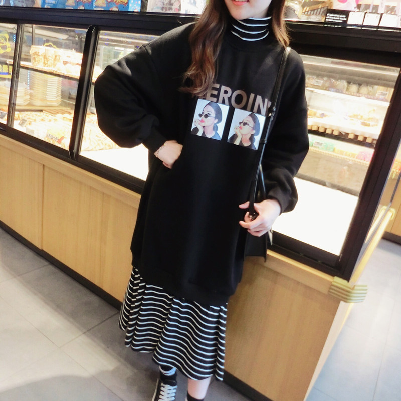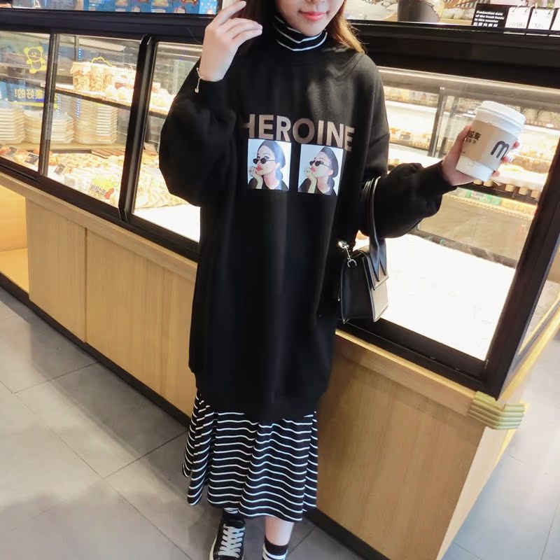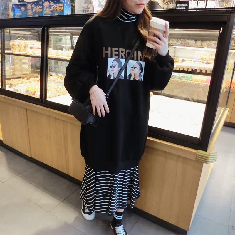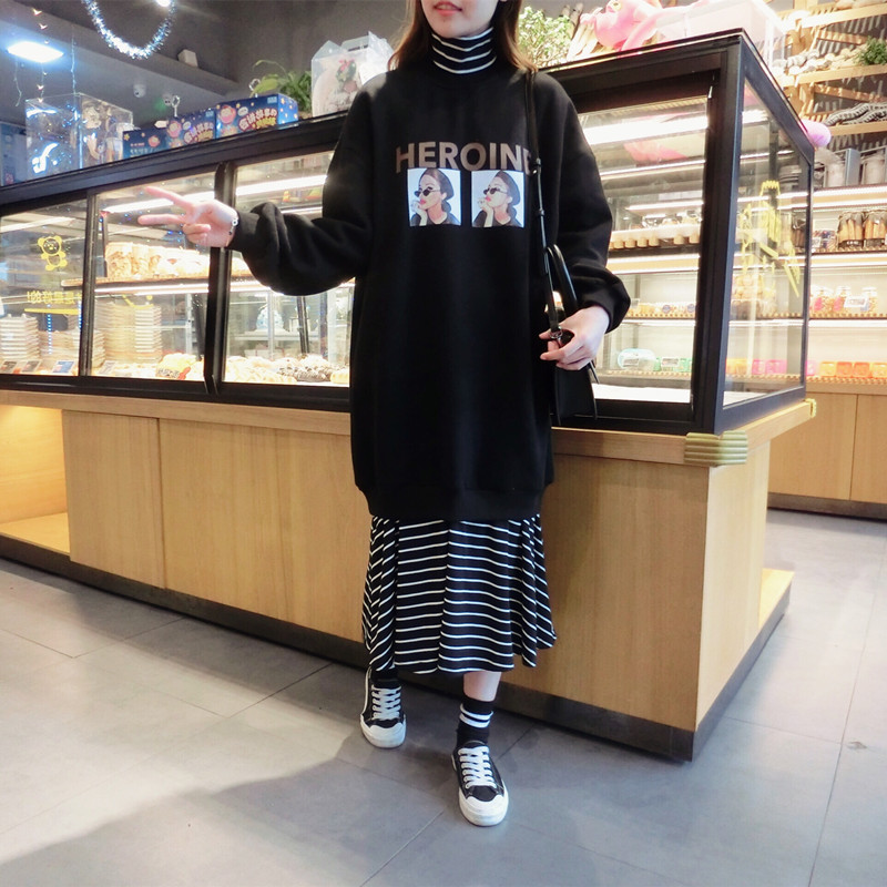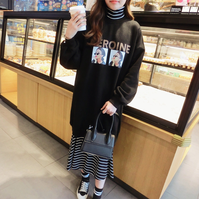 2018冬季新款女裝高領拼接印花條紋衛衣中長裙假兩件連衣裙女1入