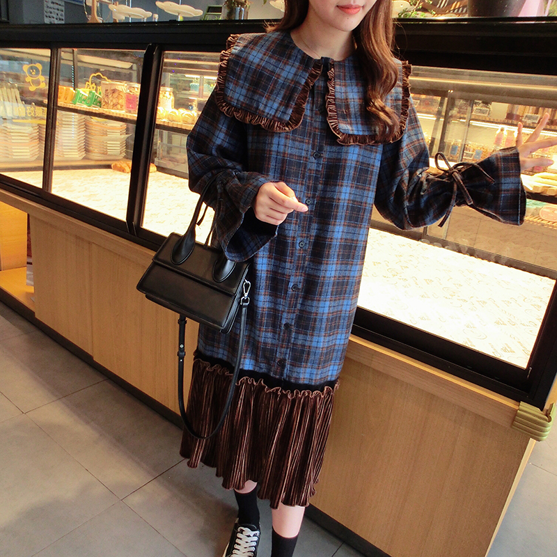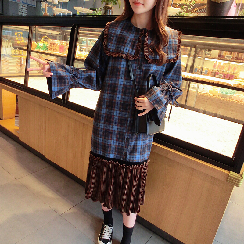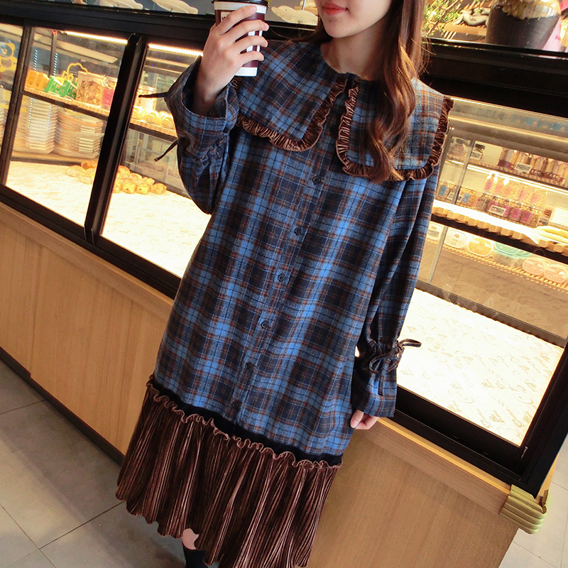 2018韓版秋冬季新款復古學院風大翻領前排扣寬松百搭打底連衣裙女1入