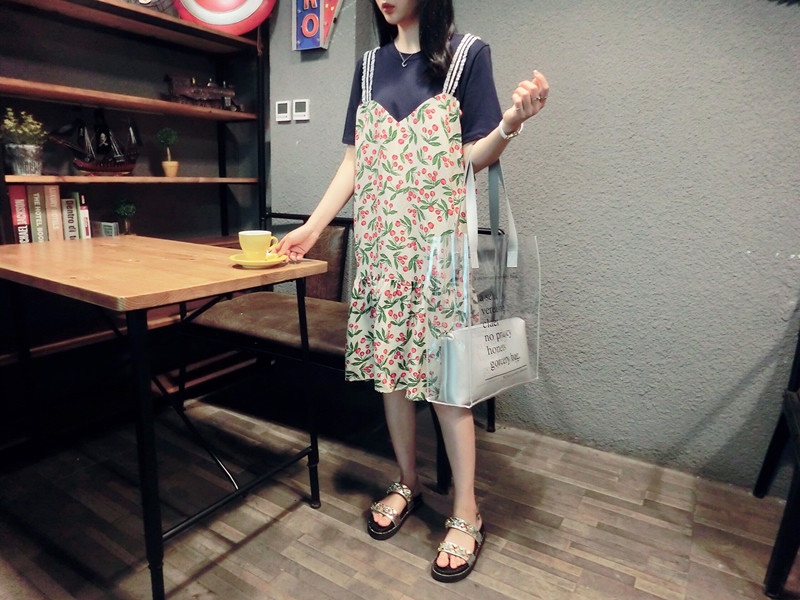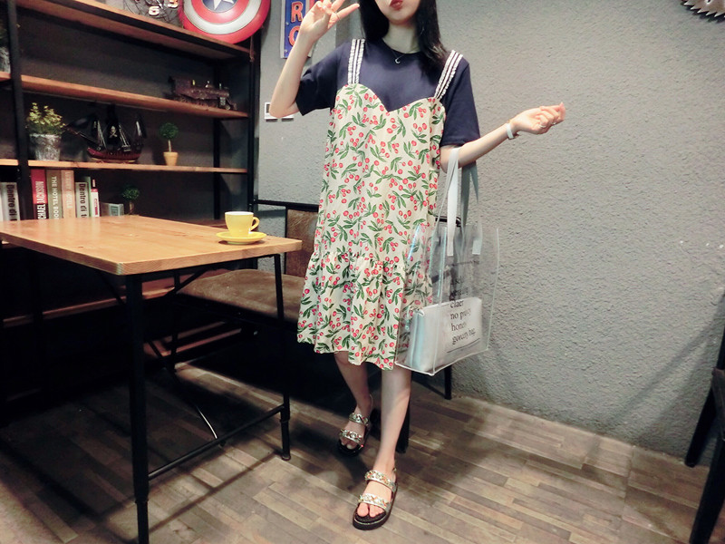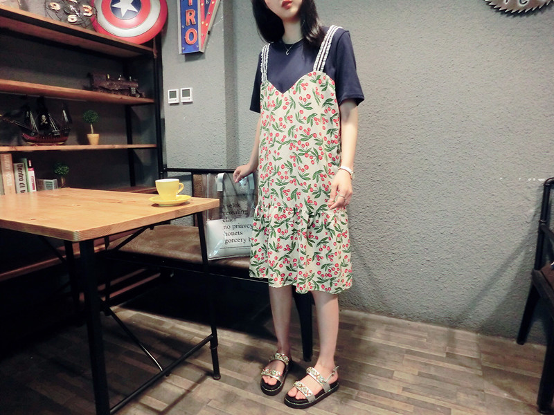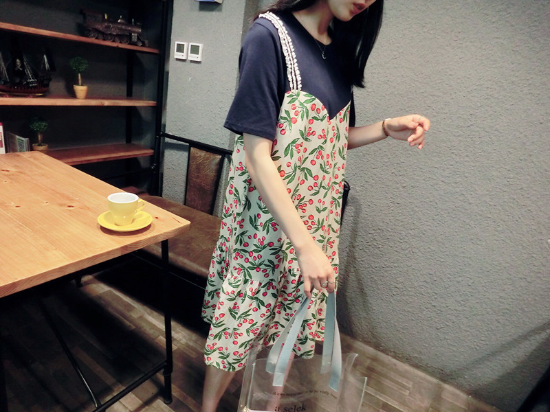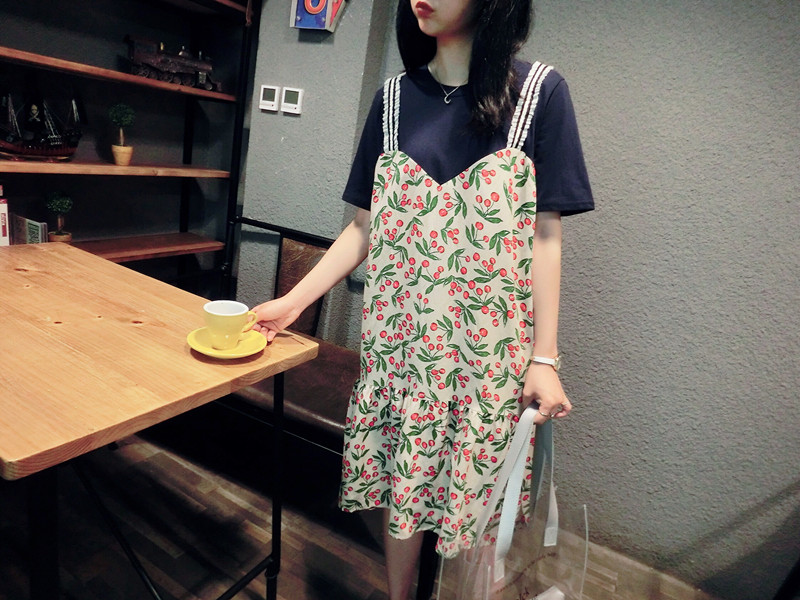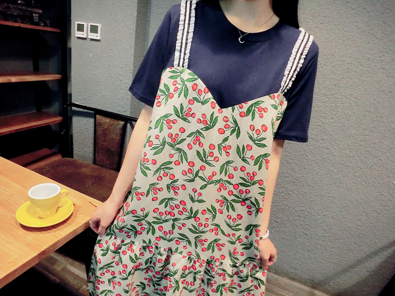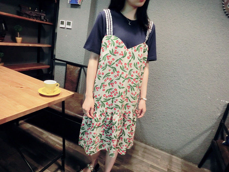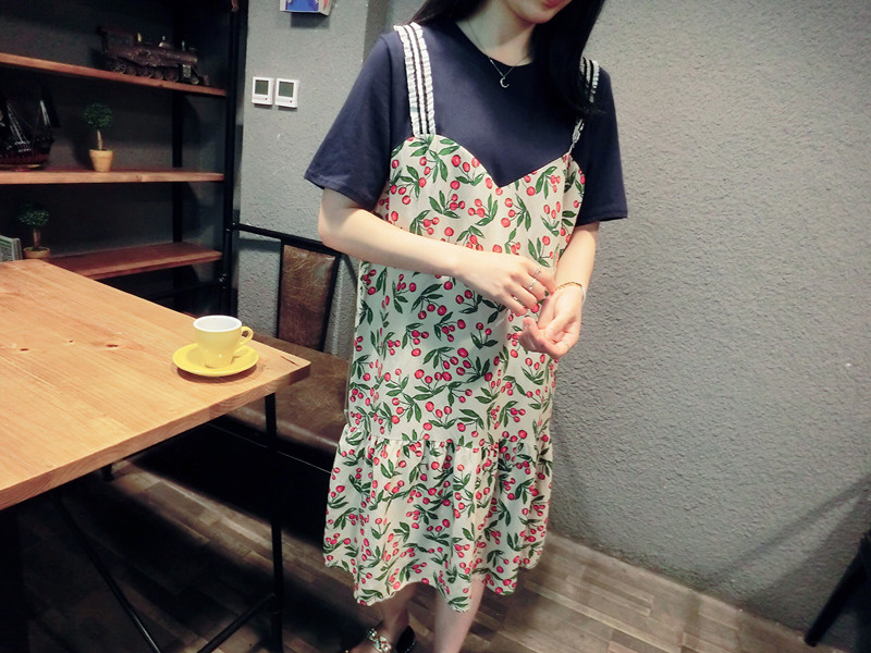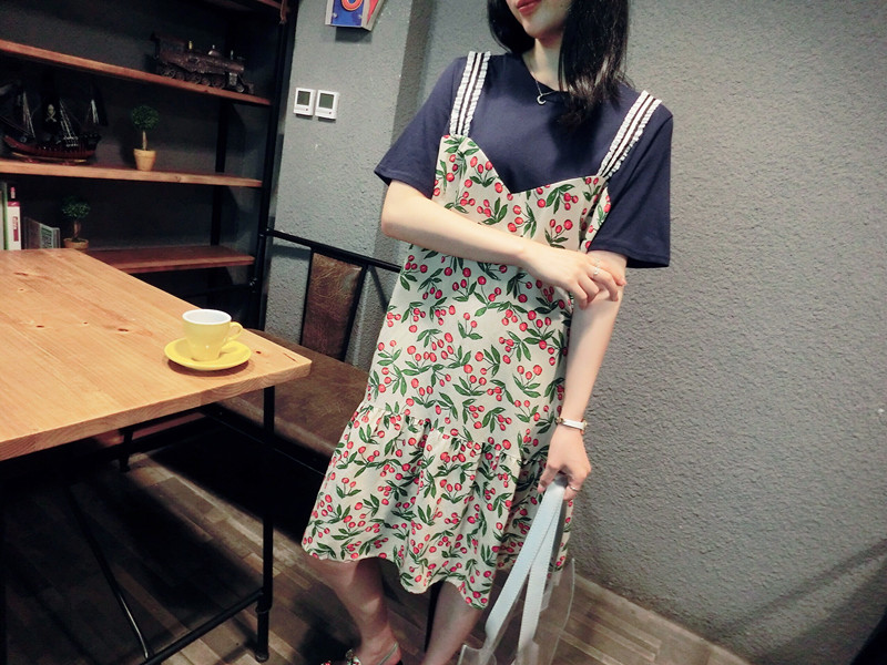 2018夏季新款女裝中長款韓版甜美假兩件櫻桃碎花連衣裙 特1入