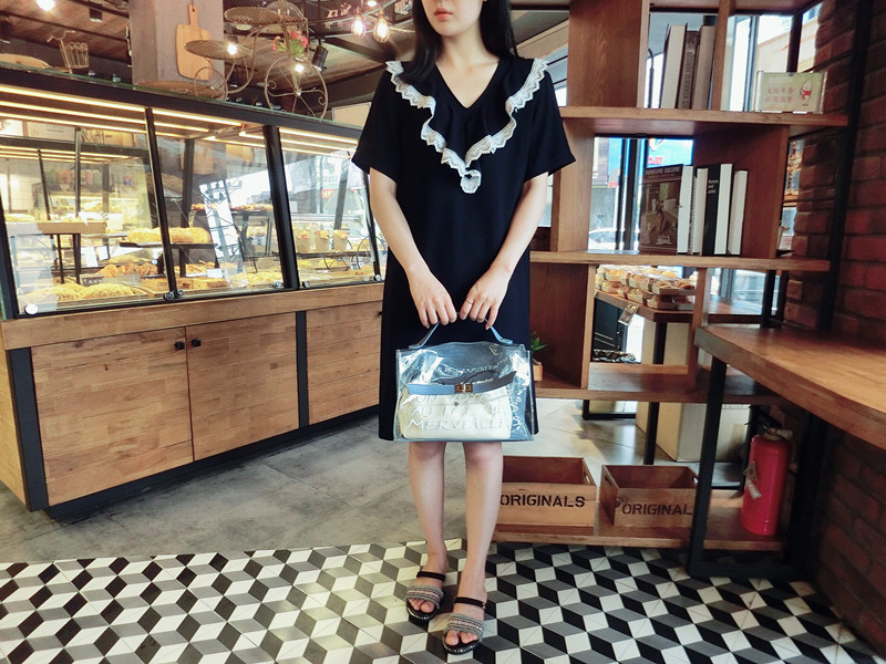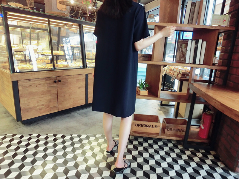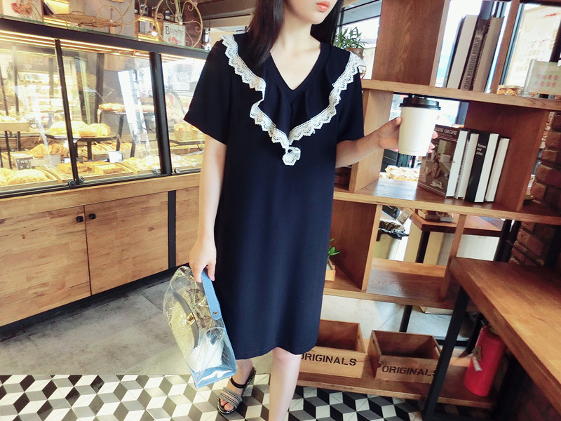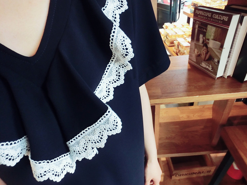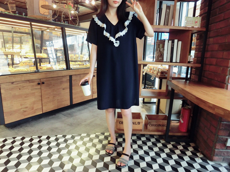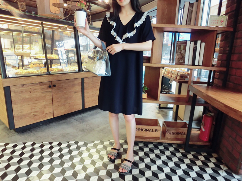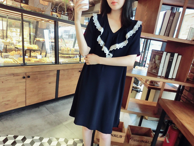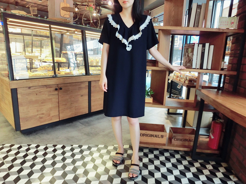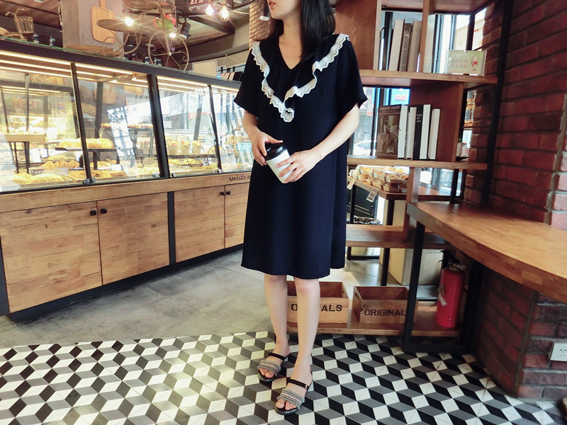 2018夏 歐韓精品女裝中長款簡約百搭學院風木耳邊藏青色連衣裙1入