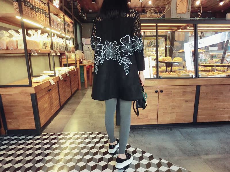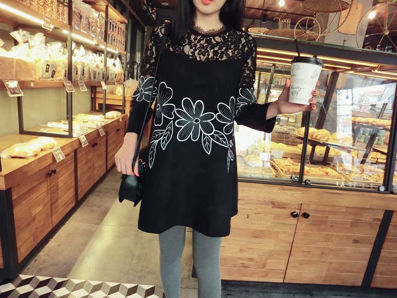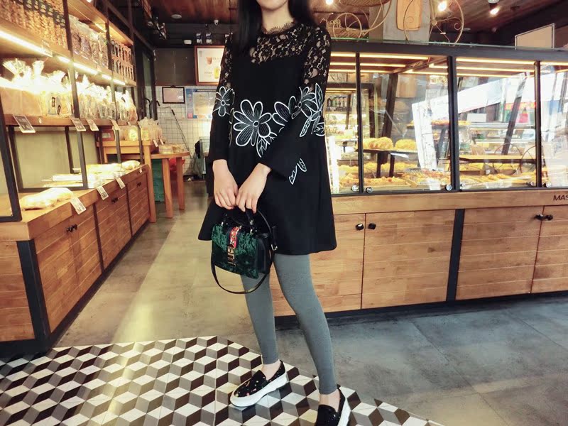 2018早春新款蕾絲拼接刺繡連衣裙中長款韓版寬松顯瘦氣質裙子女1入