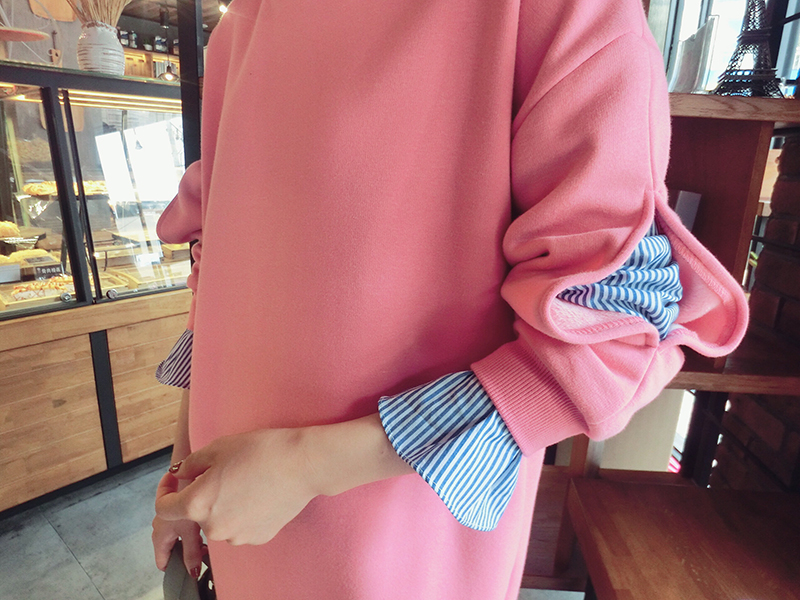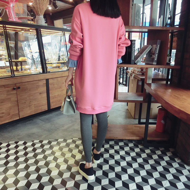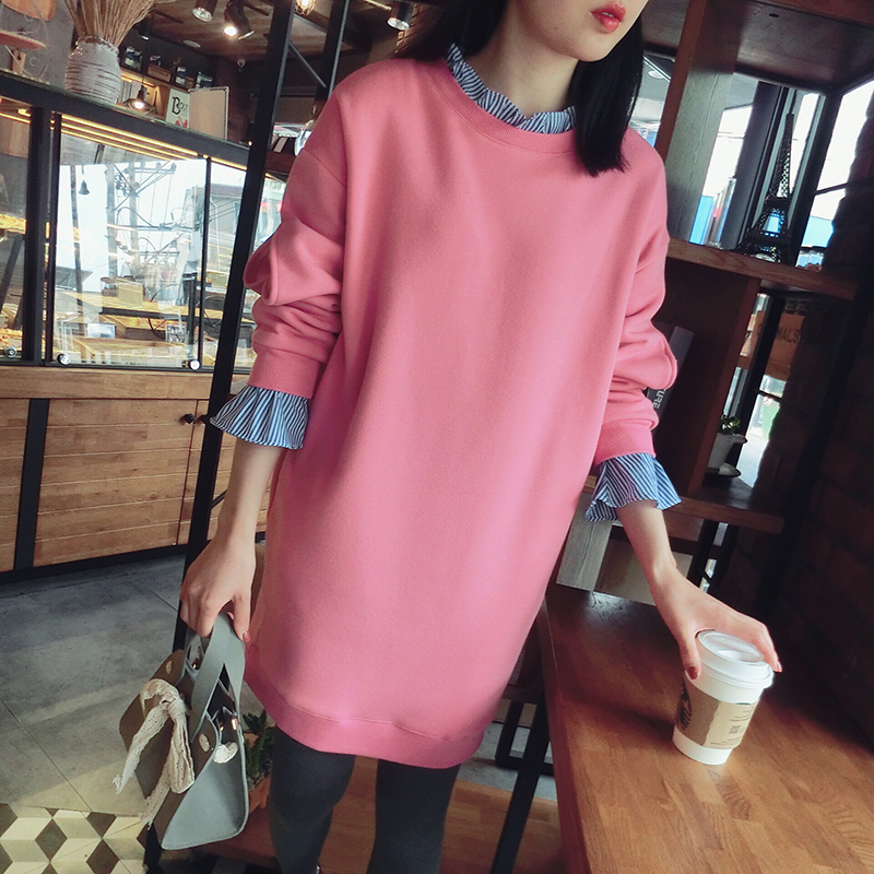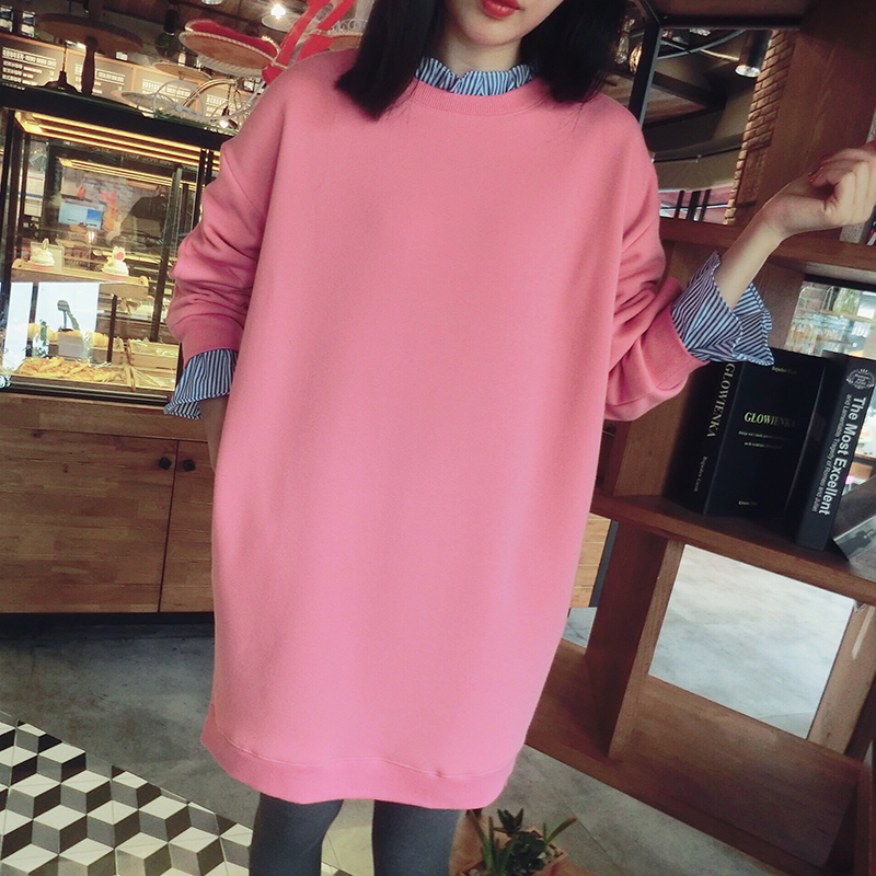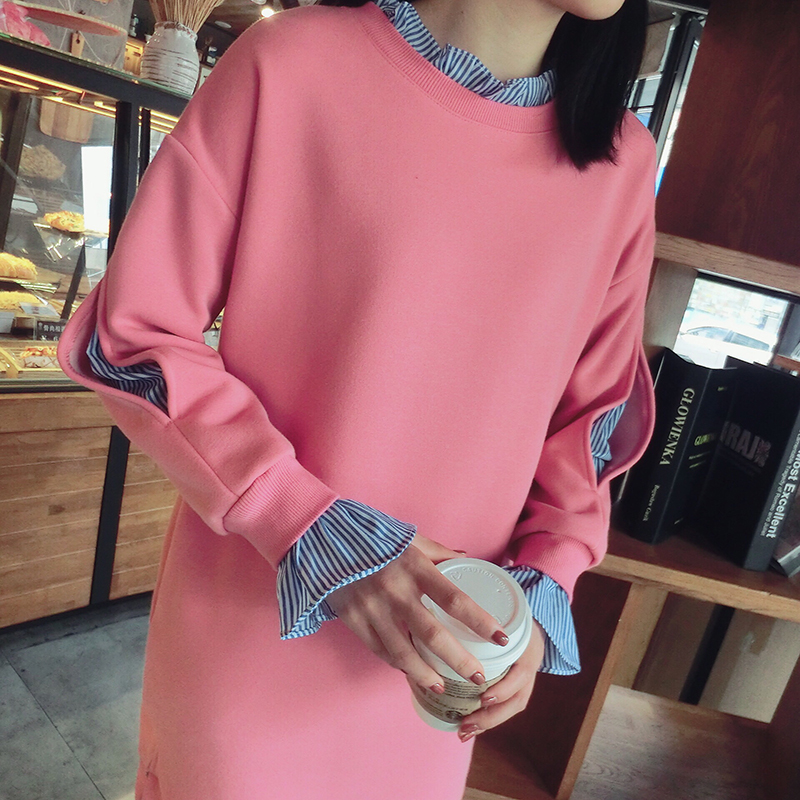 17冬季新款拼接假兩件連衣裙中長款韓版寬松顯瘦加絨衛衣打底裙女1入