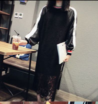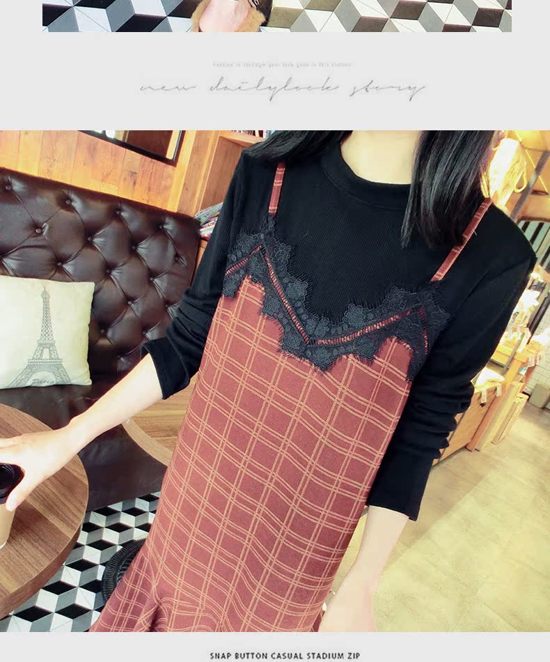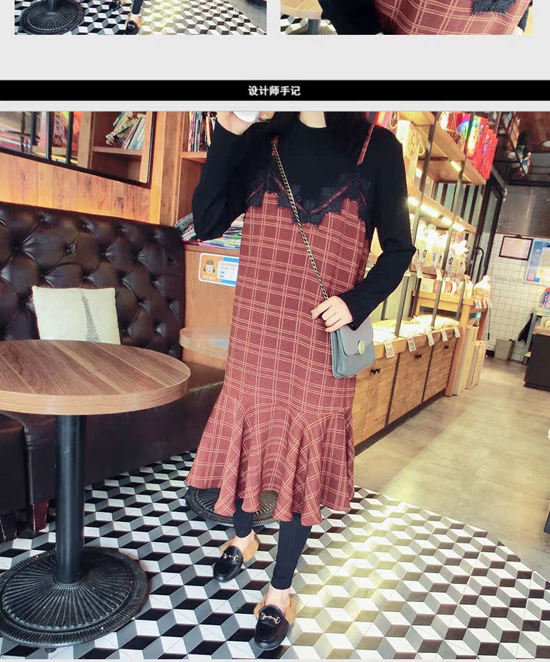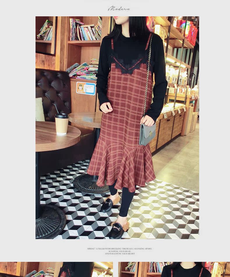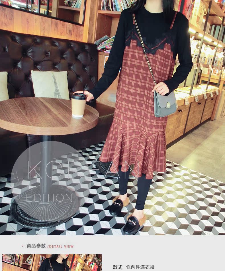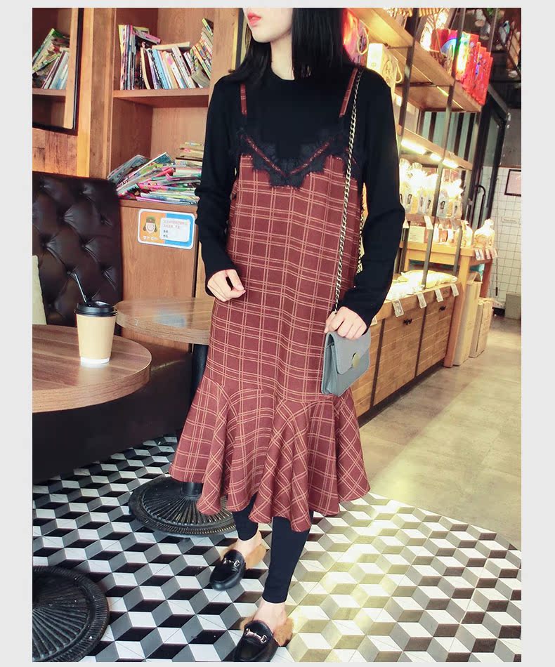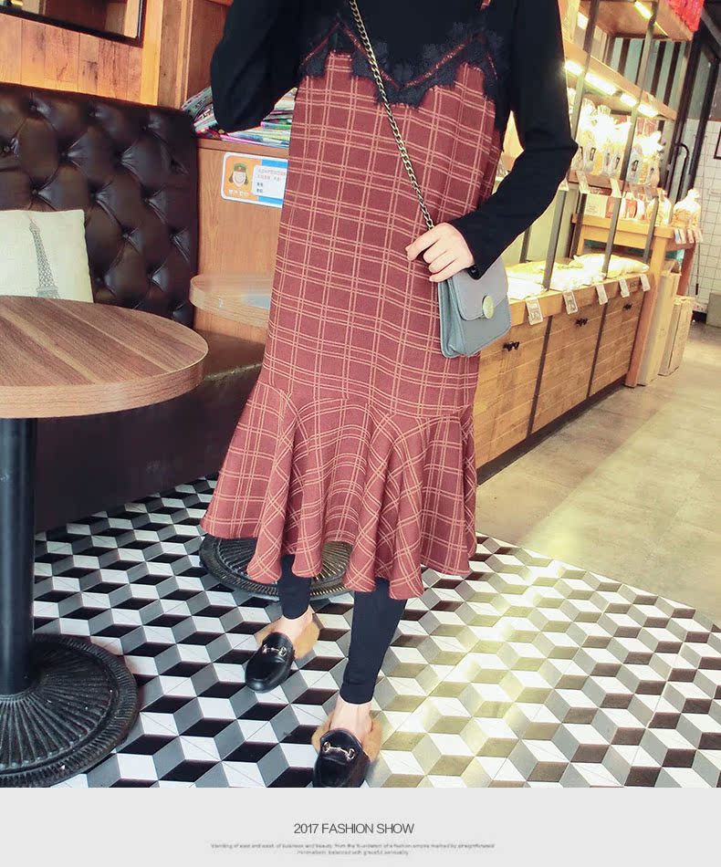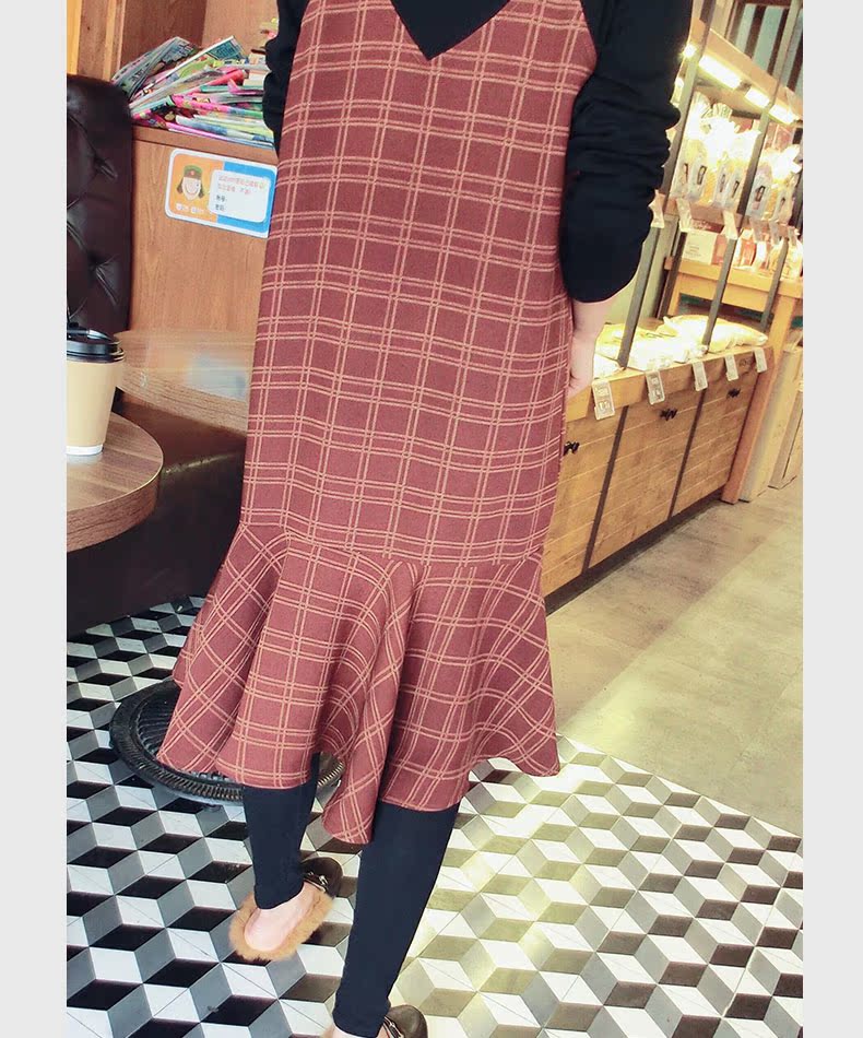 18秋冬打底裙格子魚尾裙荷葉邊裙擺中長款韓版假2件連衣裙女1入