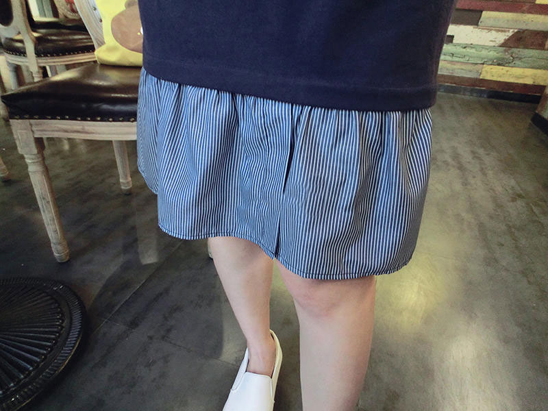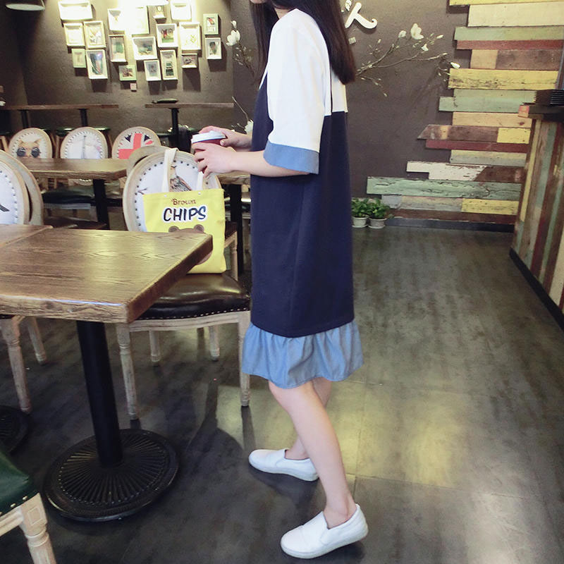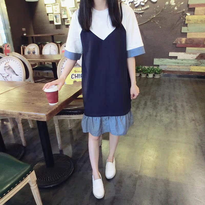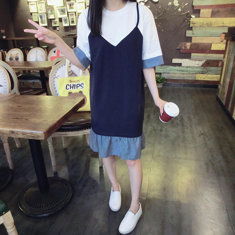 2017夏季新款韓版假兩件中長款短袖圓領T恤連衣裙 拼接吊帶裙女1入
