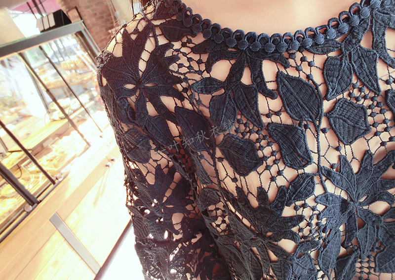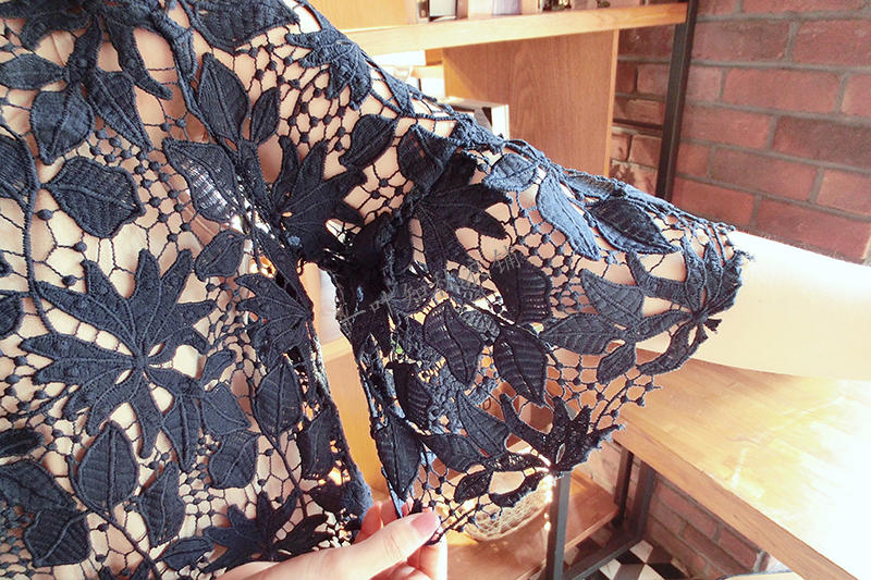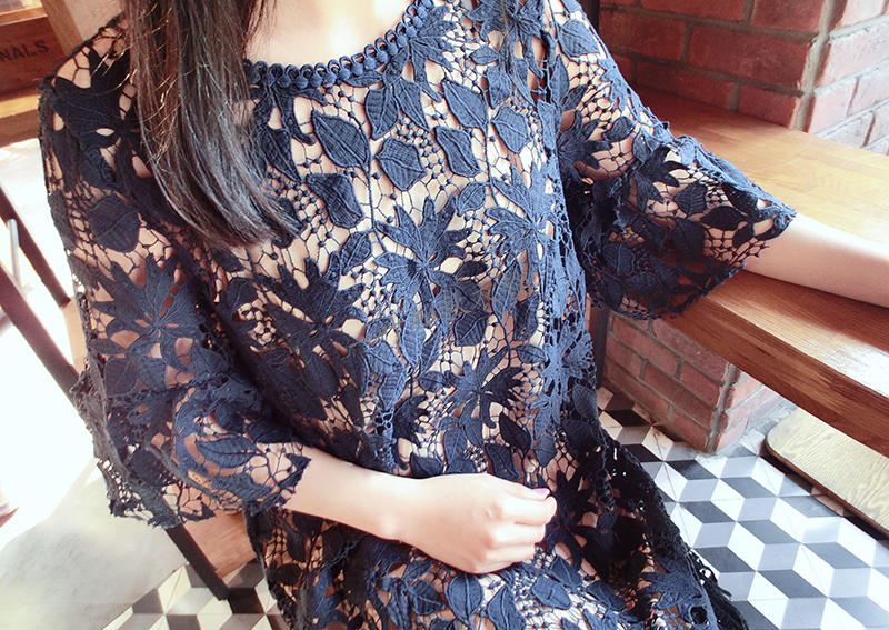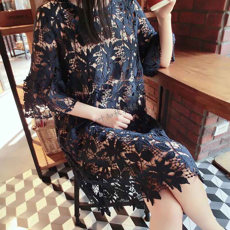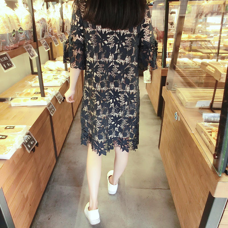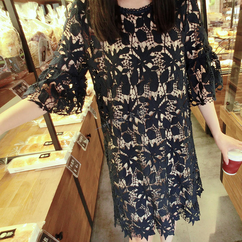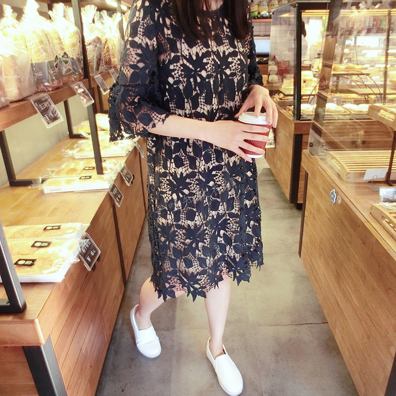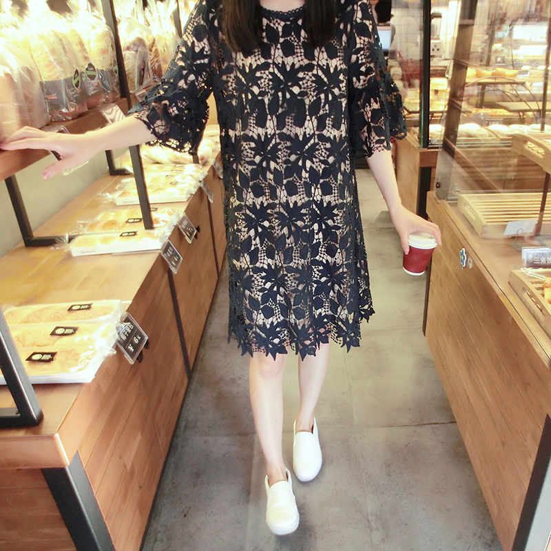 2017夏季新款韓版寬松復古中長款圓領七分袖氣質蕾絲鏤空連衣裙1入