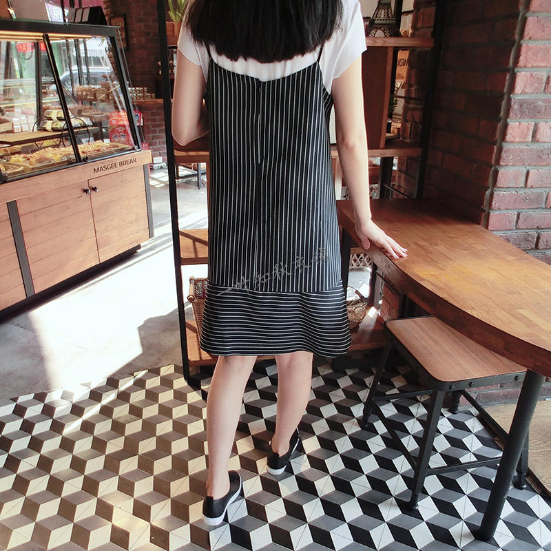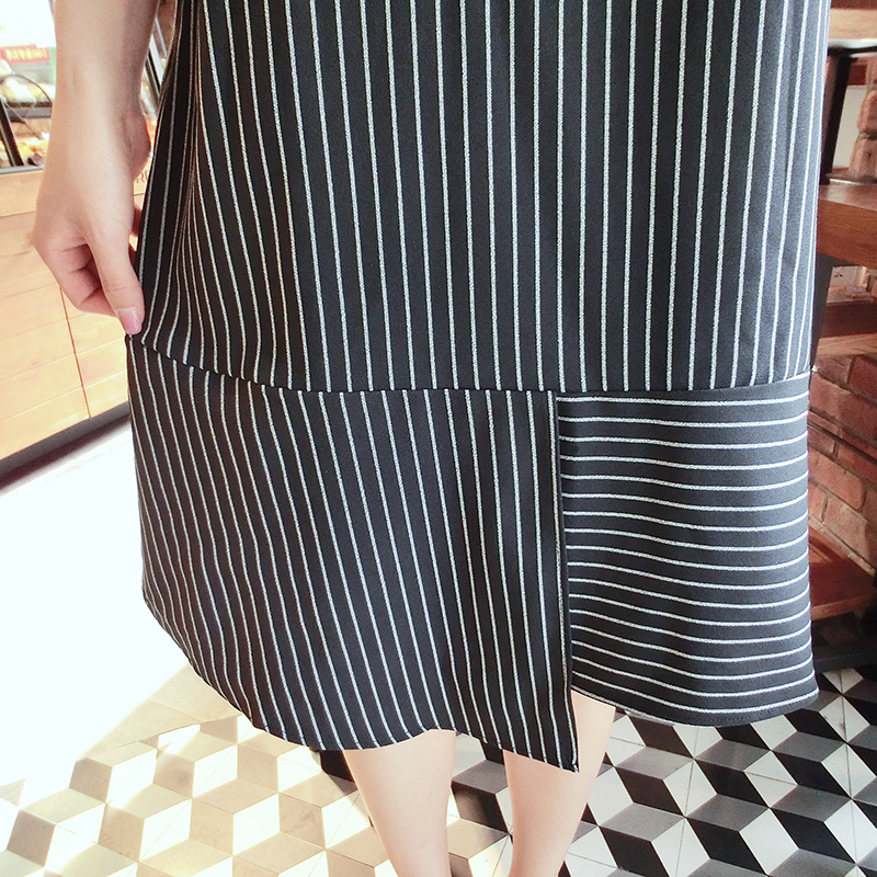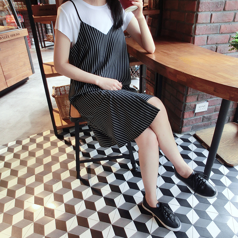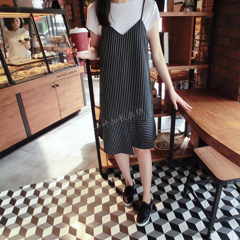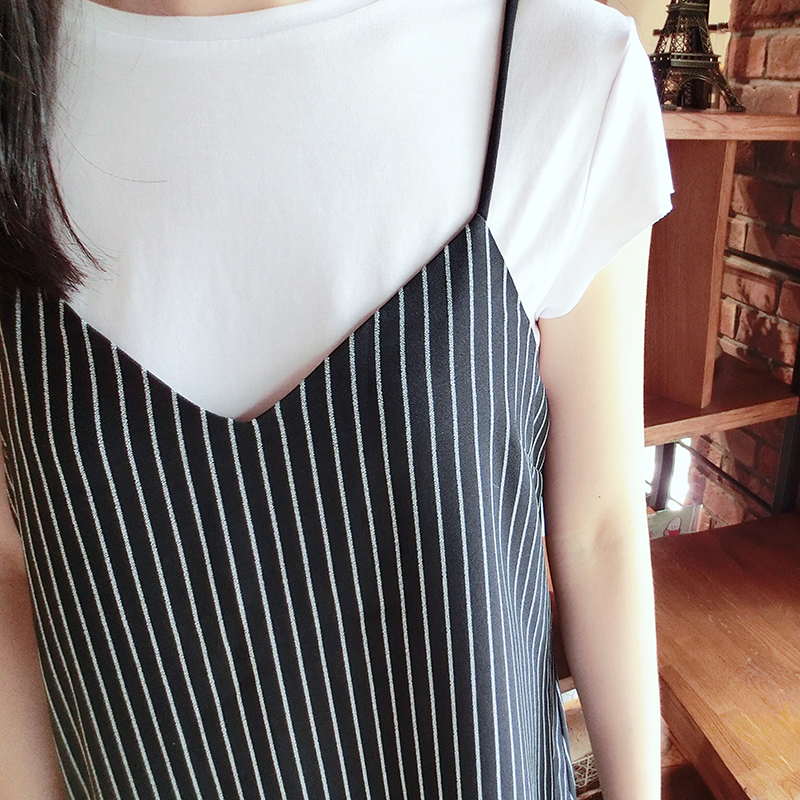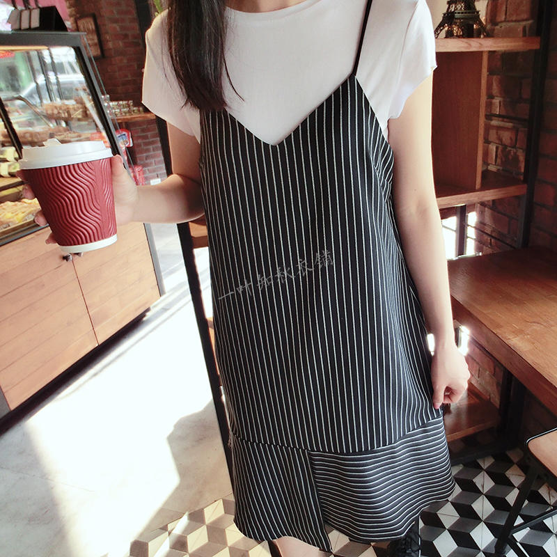 2017夏季吊帶連衣裙條紋不規則裙中長款韓版氣質寬松顯瘦顯瘦套頭1入
