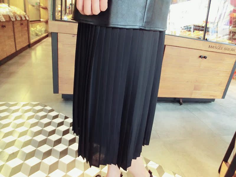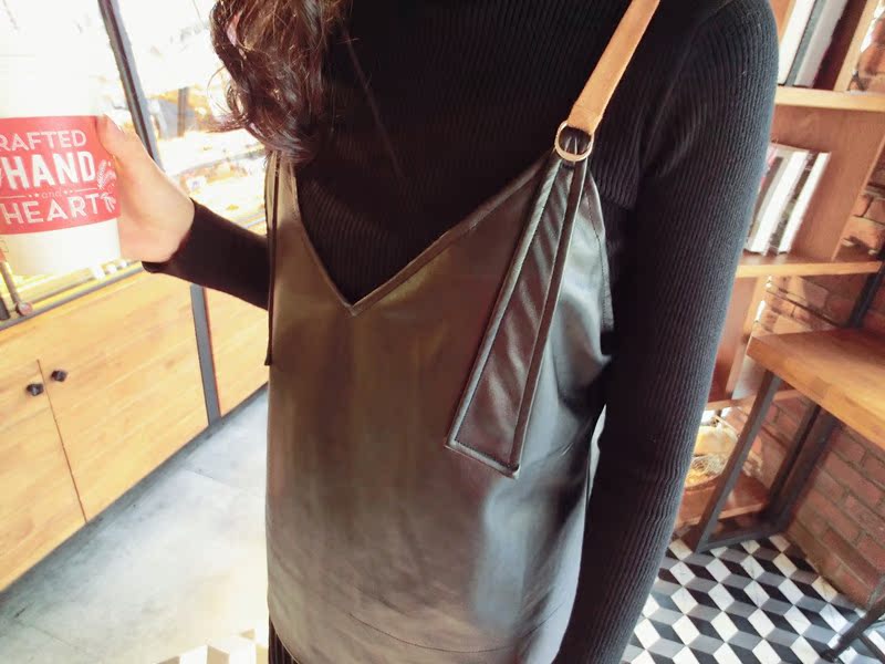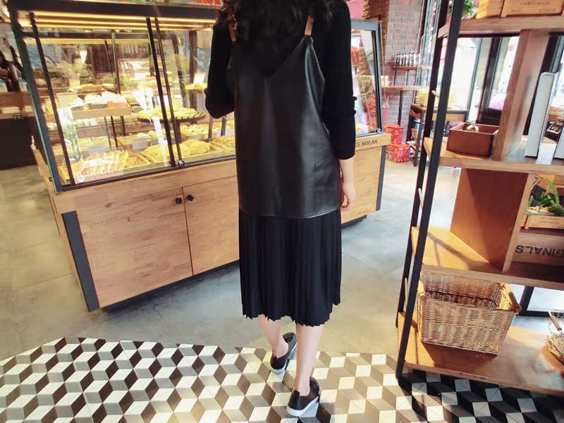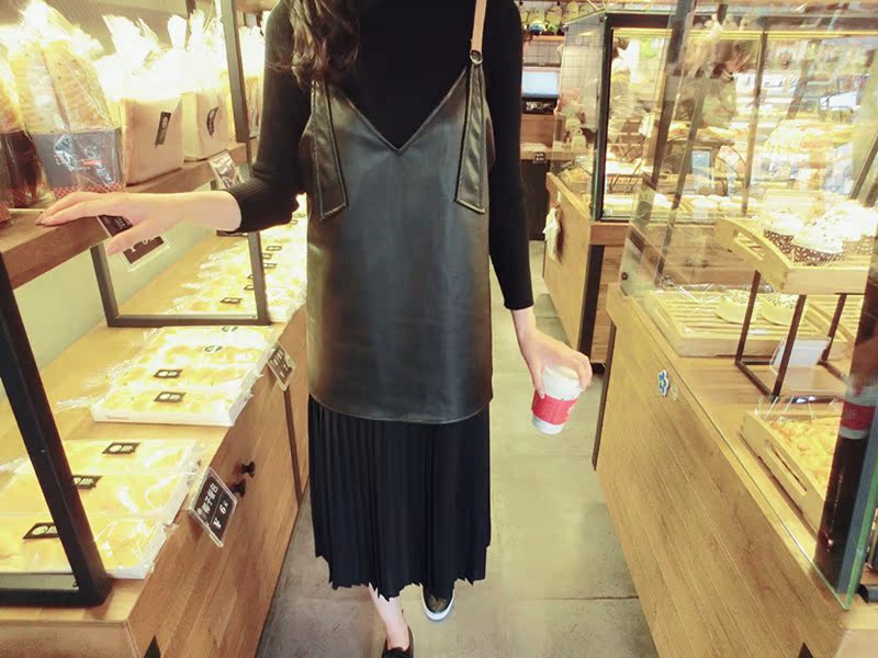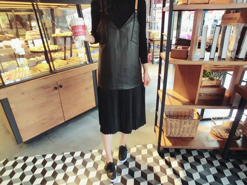 2018早春新款女裝韓版寬松中長款吊帶皮裙大碼拼接百褶雪紡連衣裙1入
