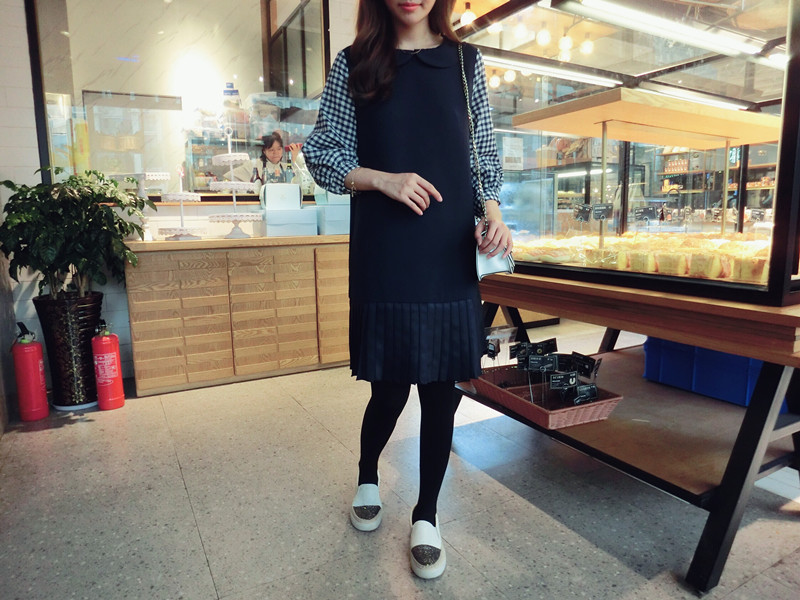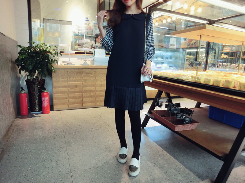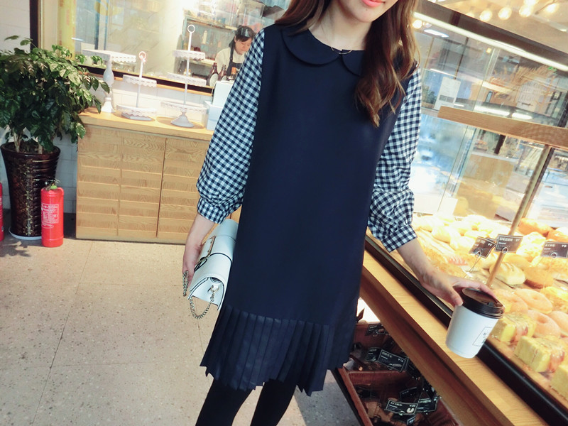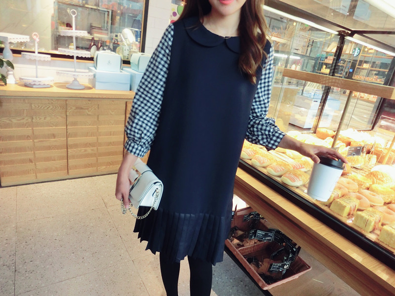 19春季新款中長款學院風娃娃領拼接格子寬松百褶連衣裙女912-71入