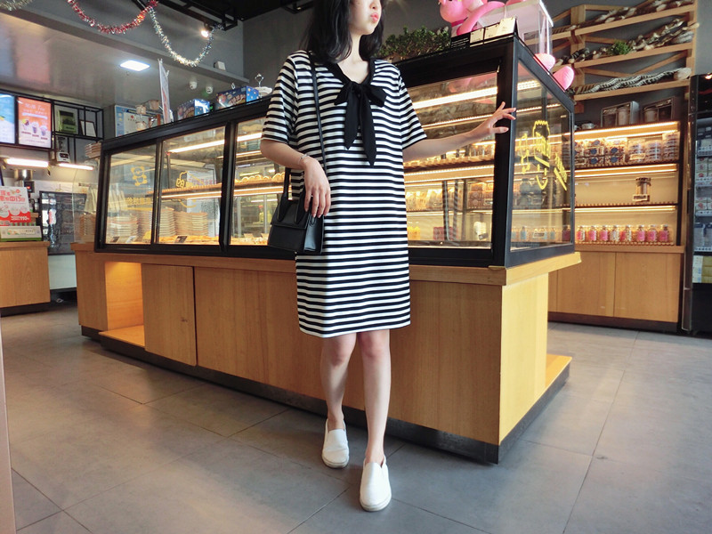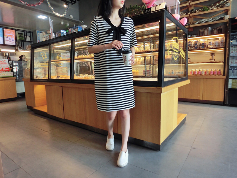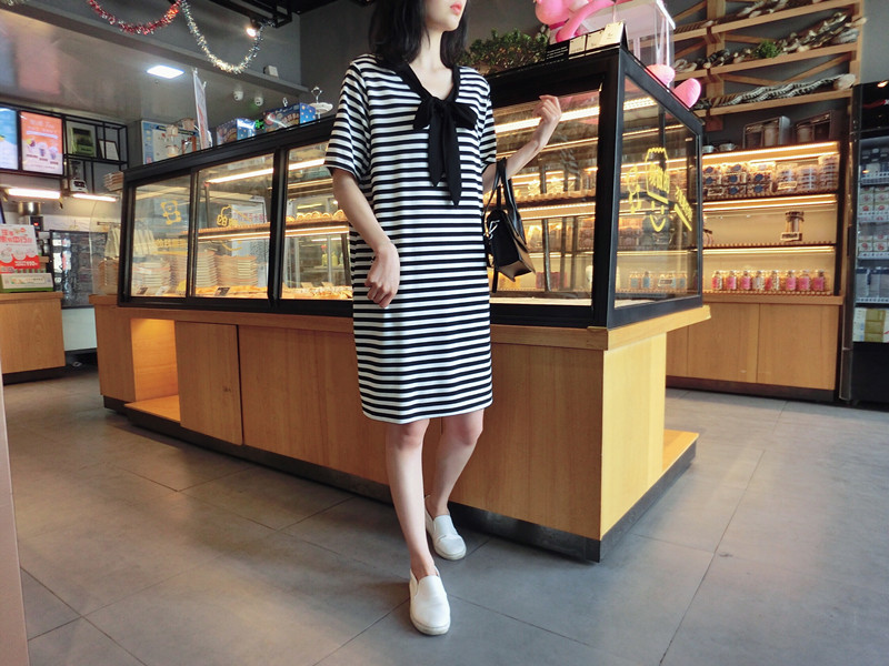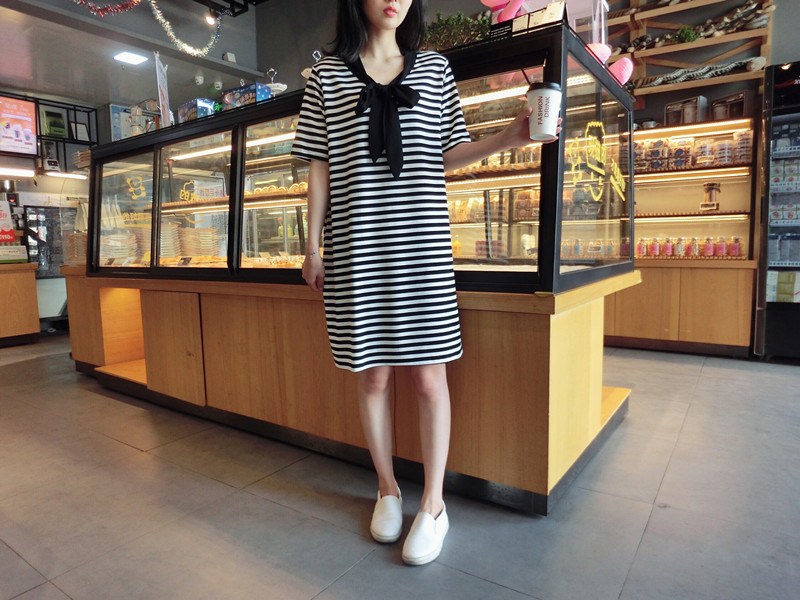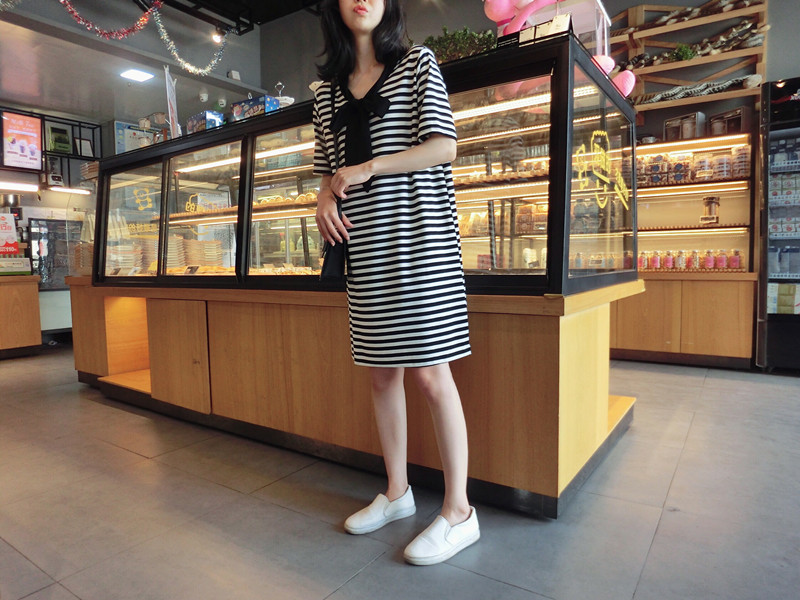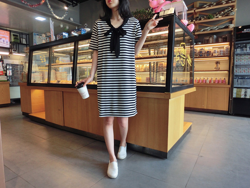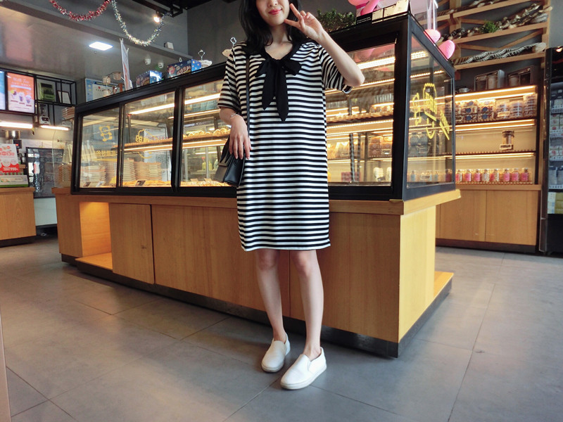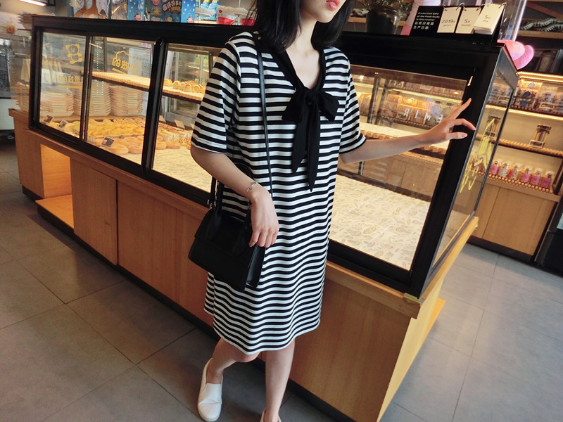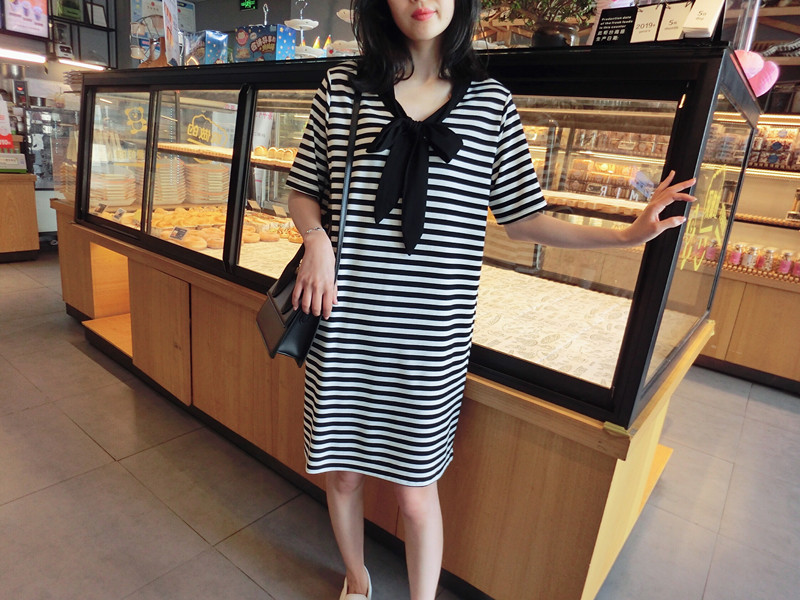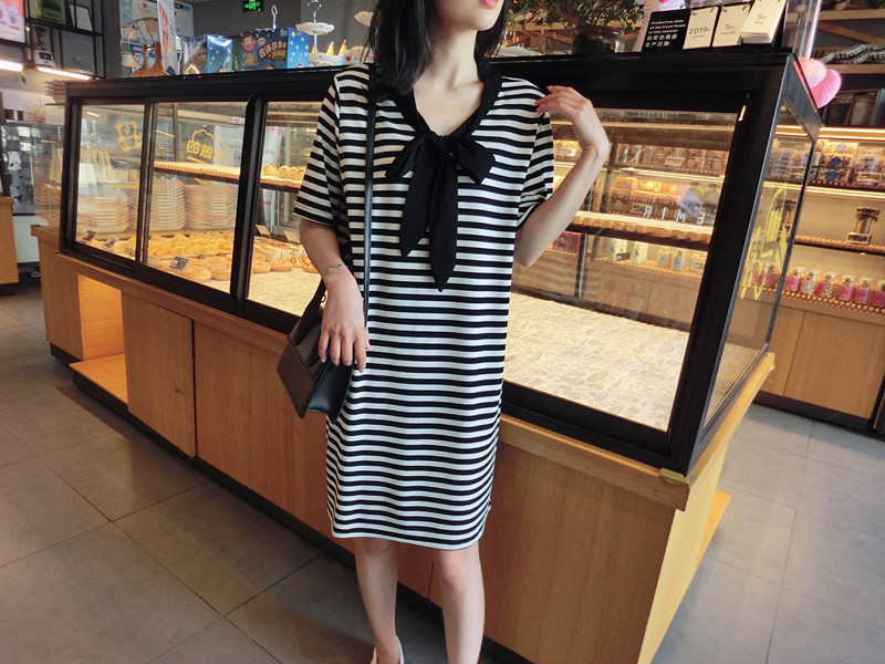 2019寬松大碼遮肚連衣裙減齡寬松休閑條紋系帶V領裙子胖mm顯瘦潮1入
