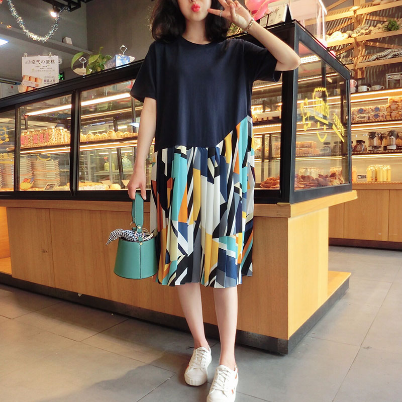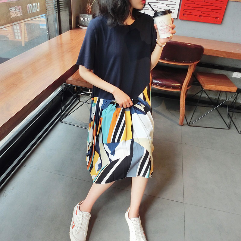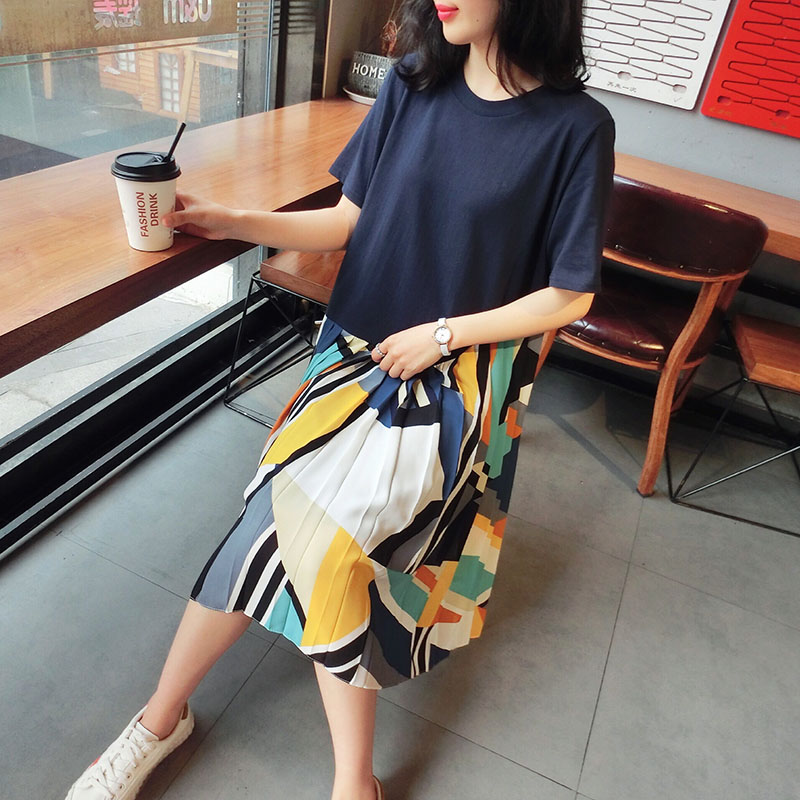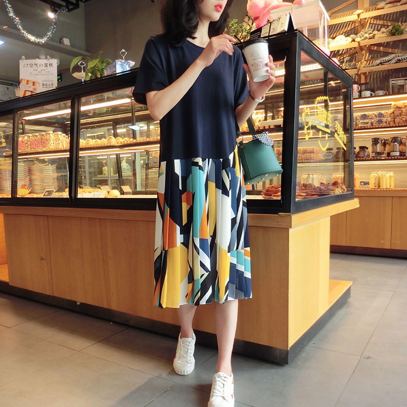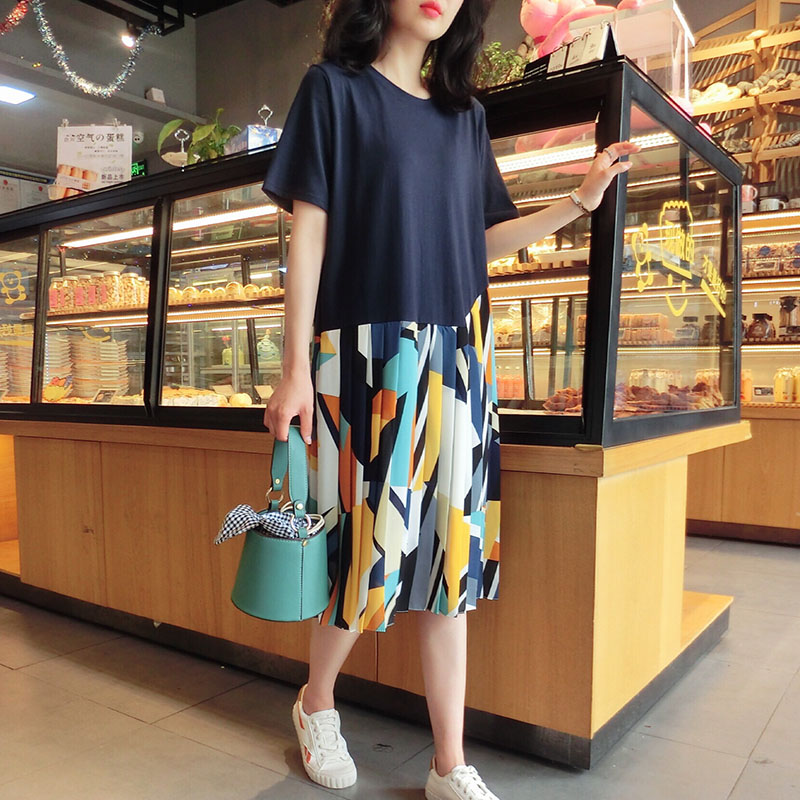 韓版2019夏季新品圓領拼接不規則碎花裙擺寬松顯瘦中長款連衣裙女1入