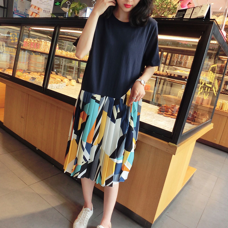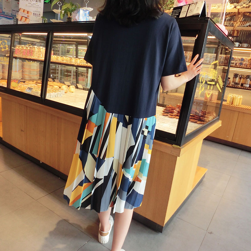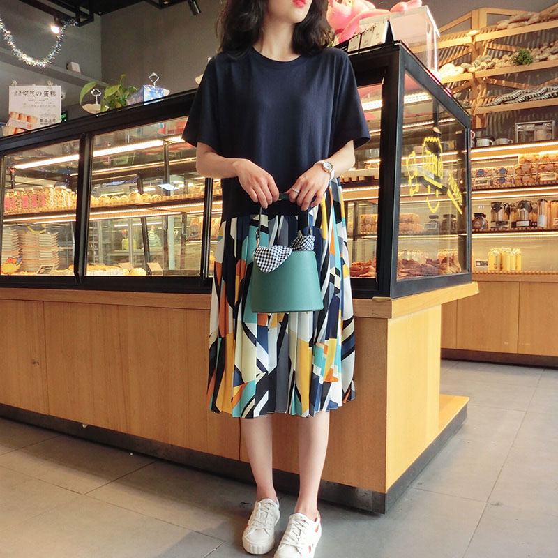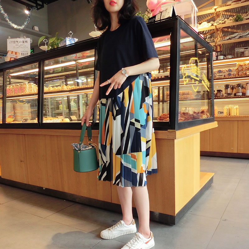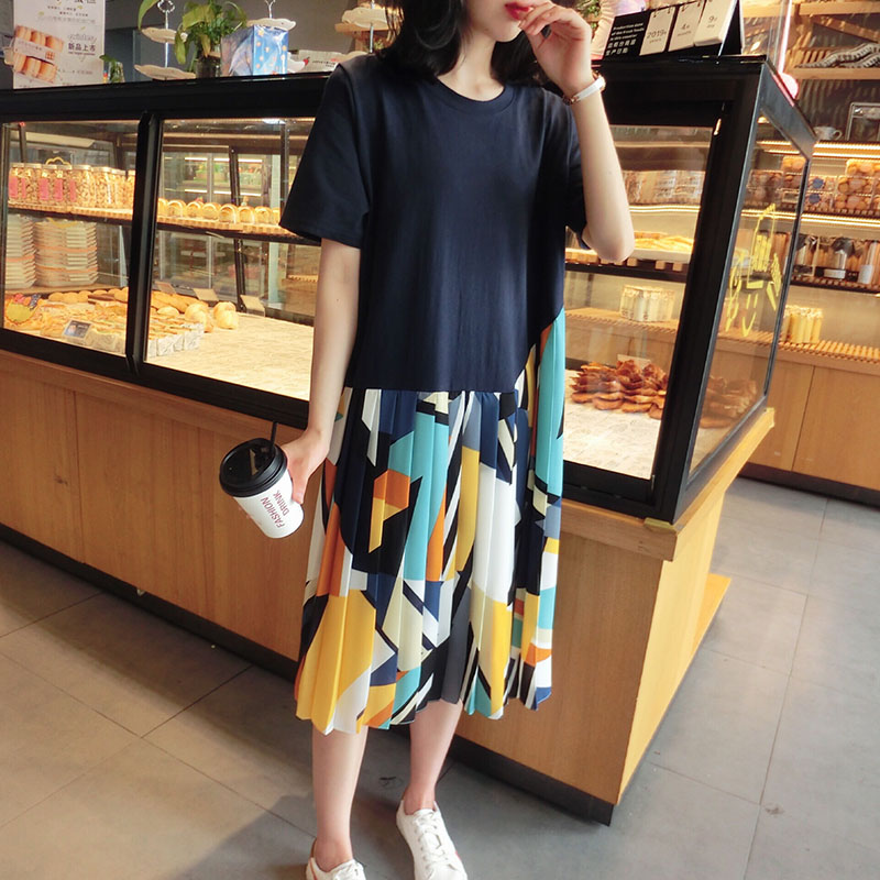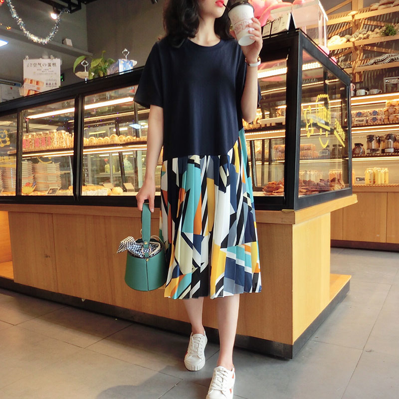 韓版2019夏季新品圓領拼接不規則碎花裙擺寬松顯瘦中長款連衣裙女1入