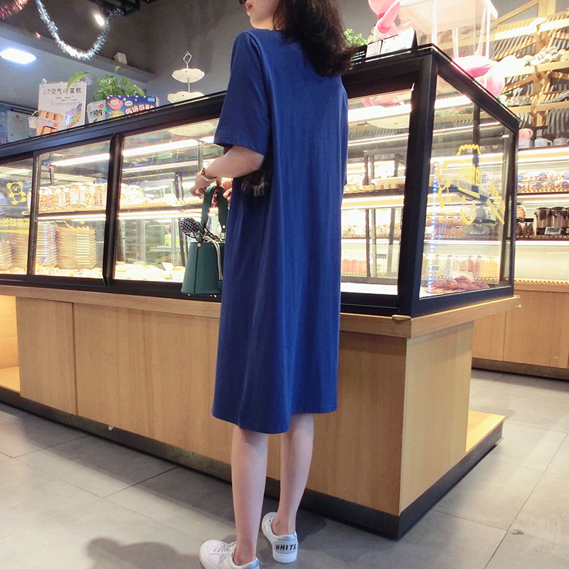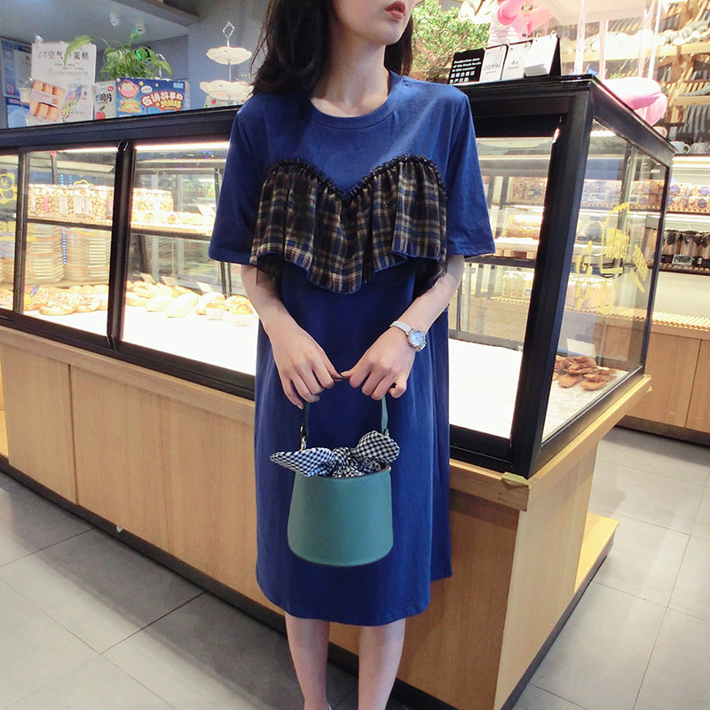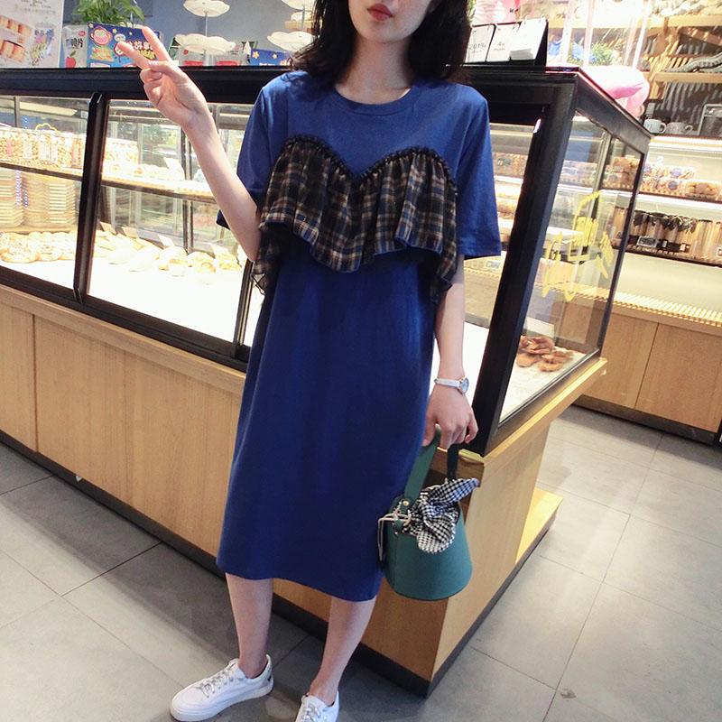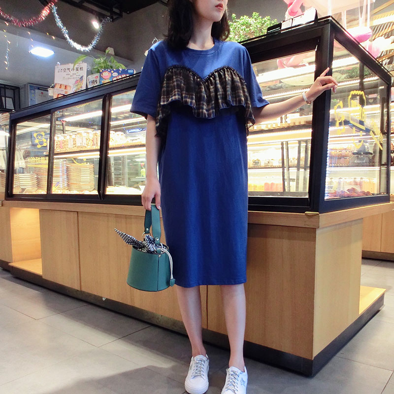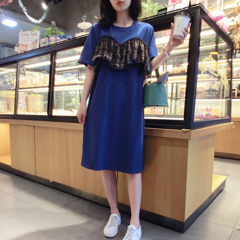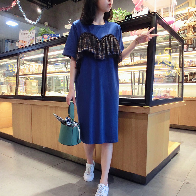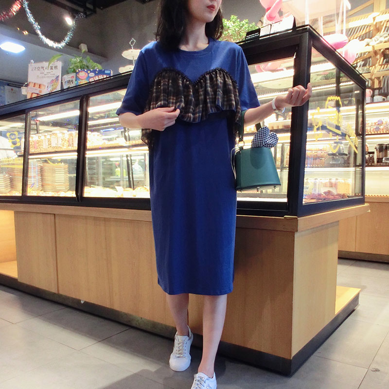 2019夏季新款網紗拼接連衣裙中長款短袖圓領T恤裙學院風女中長款1入