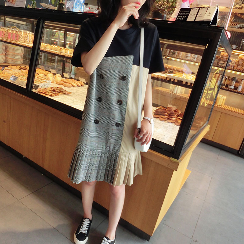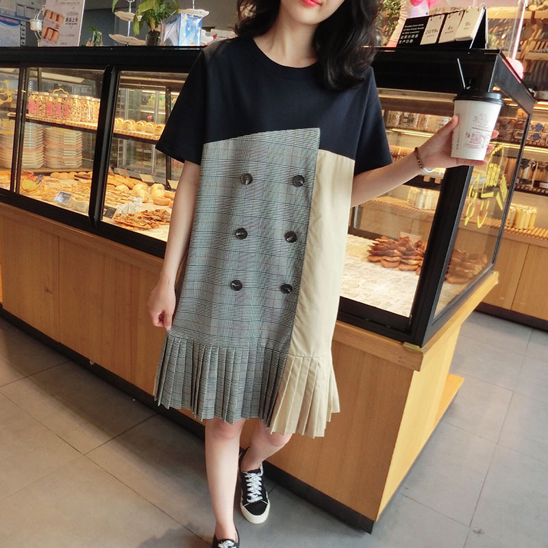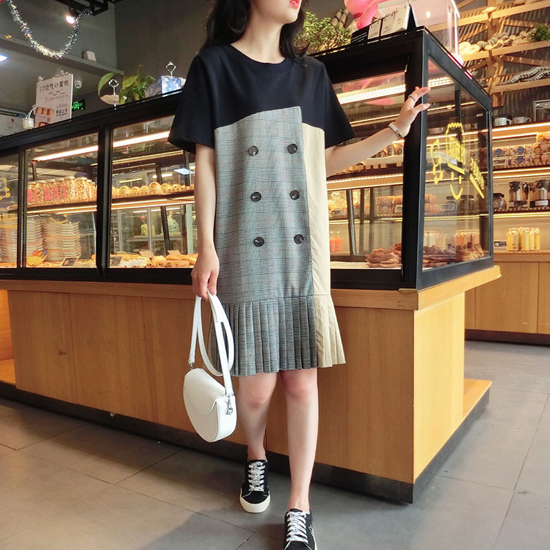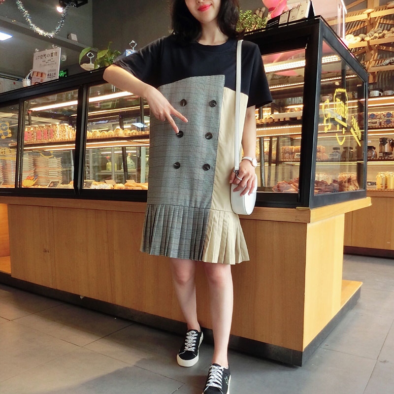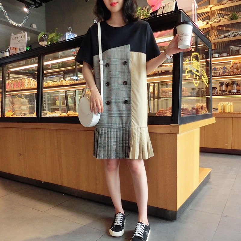 韓2019夏新款東大門寬松學院風假兩件短袖不規則拼接百褶連衣裙女1入