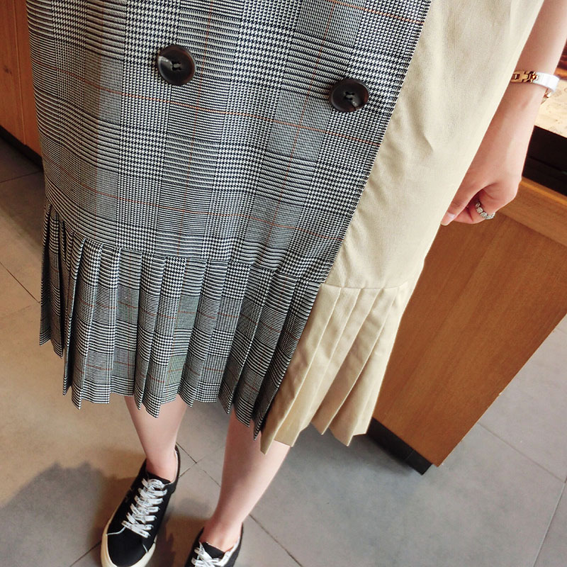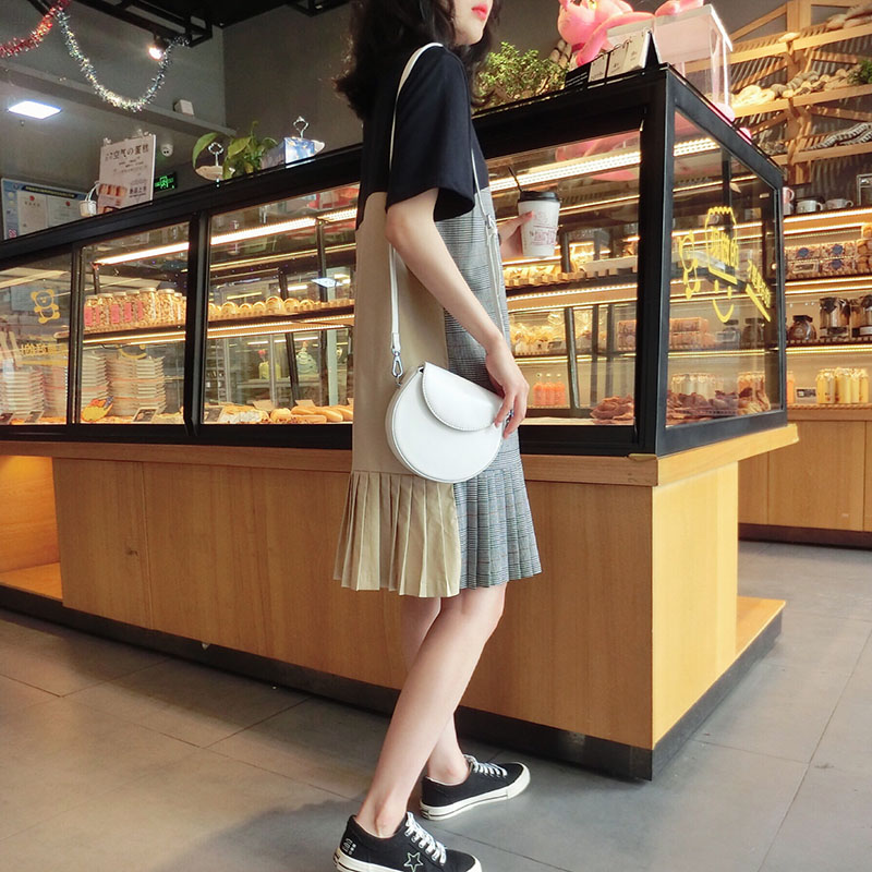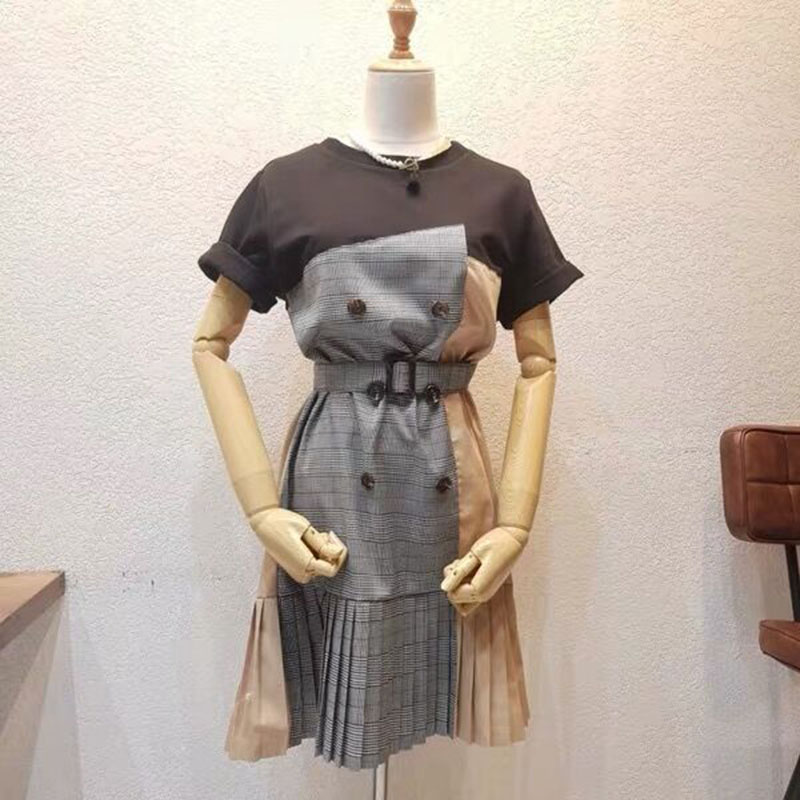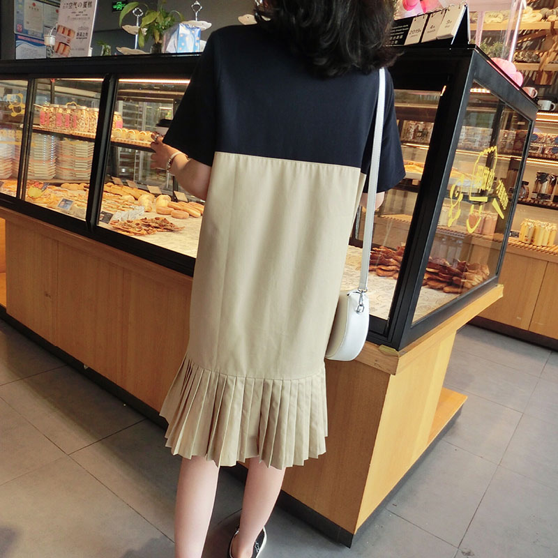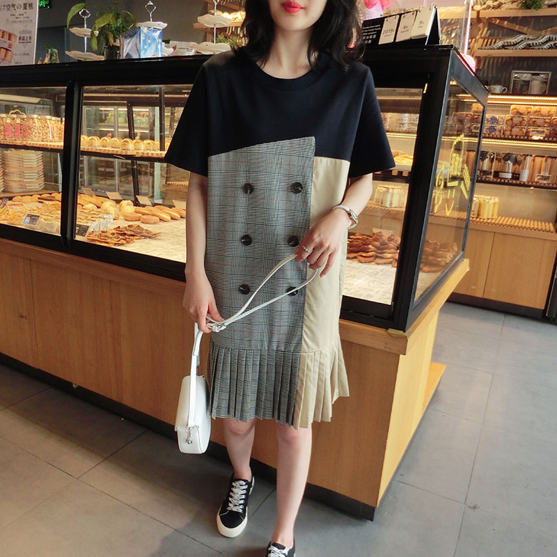 韓2019夏新款東大門寬松學院風假兩件短袖不規則拼接百褶連衣裙女1入
