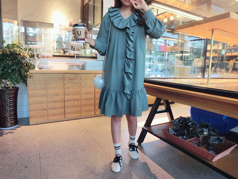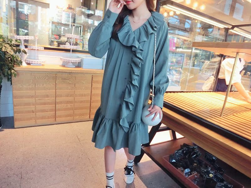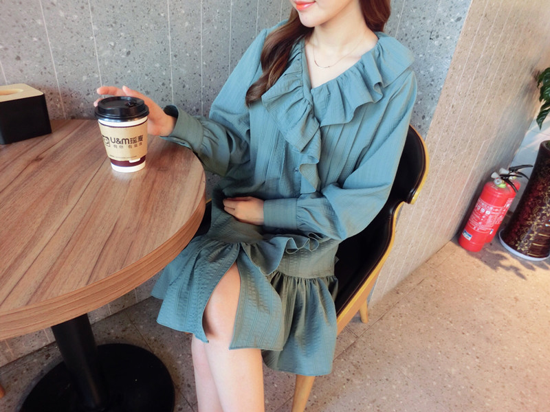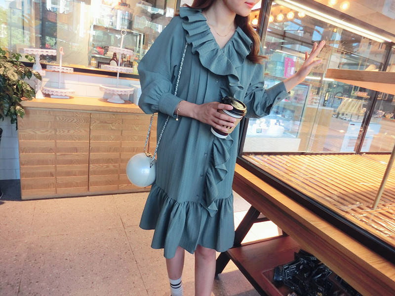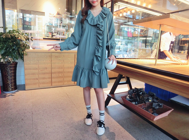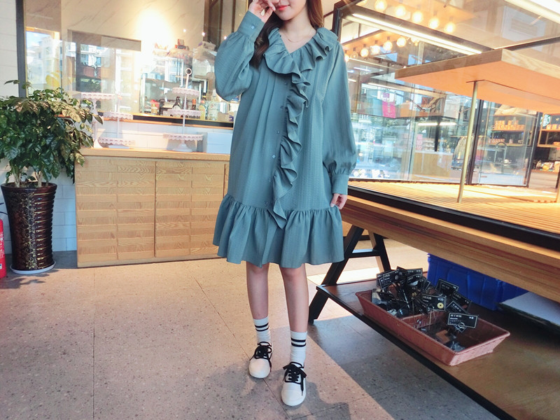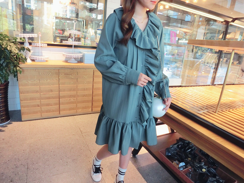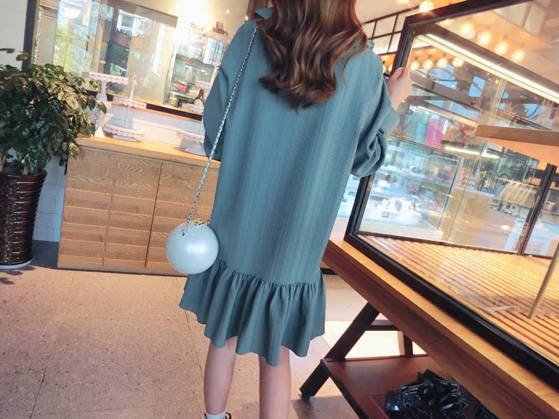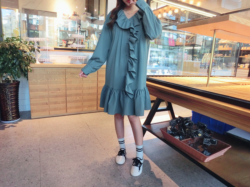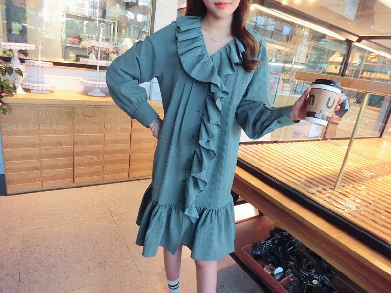 2019春裝新款韓版中長款荷葉邊魚尾裙女純色氣質百搭連衣裙潮1入