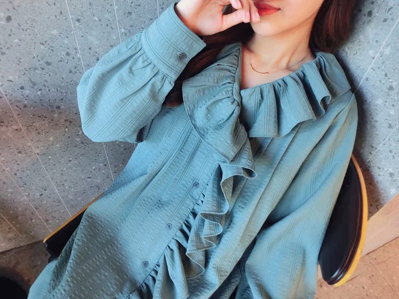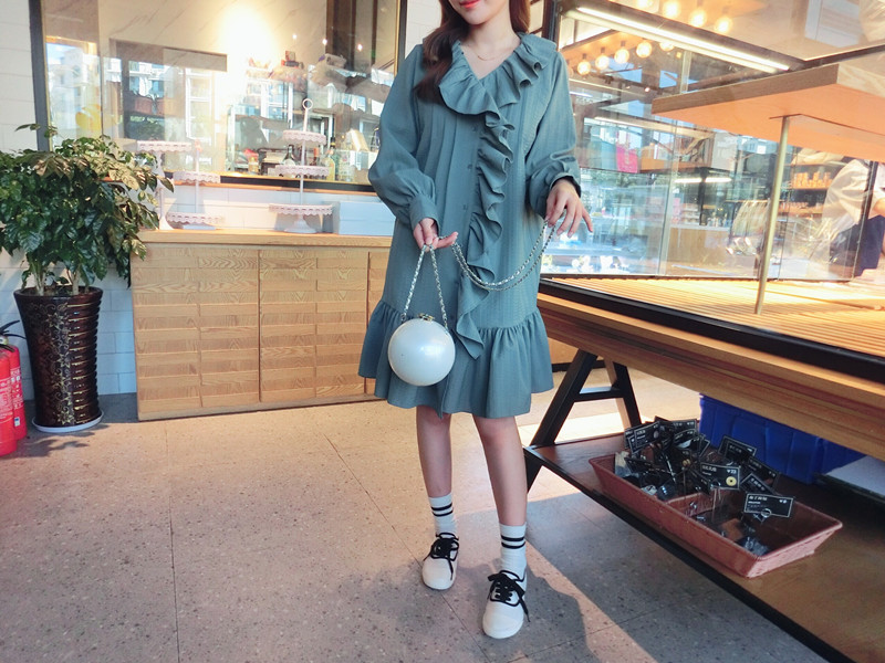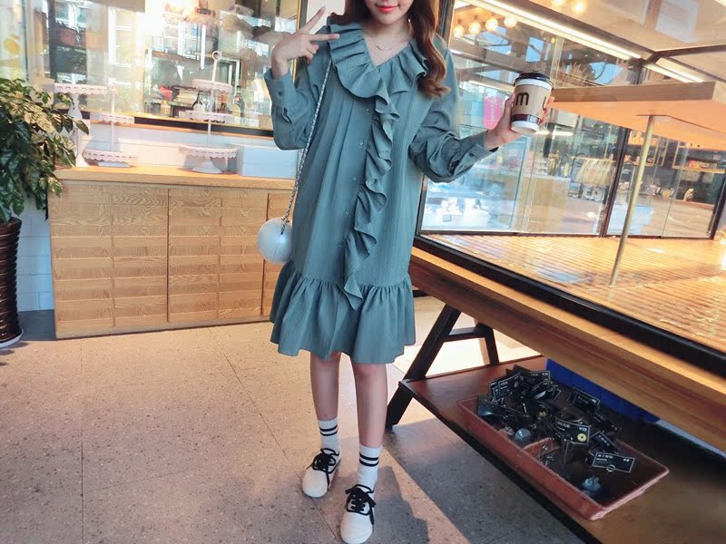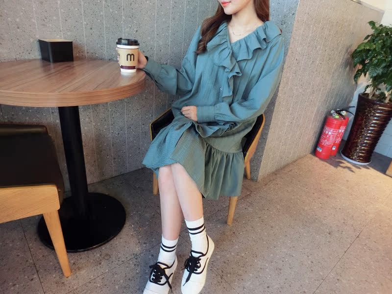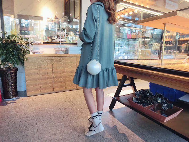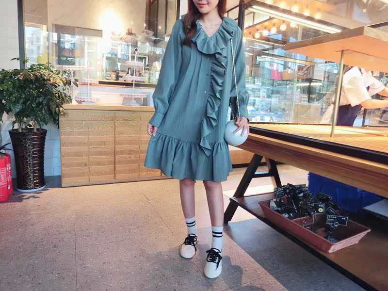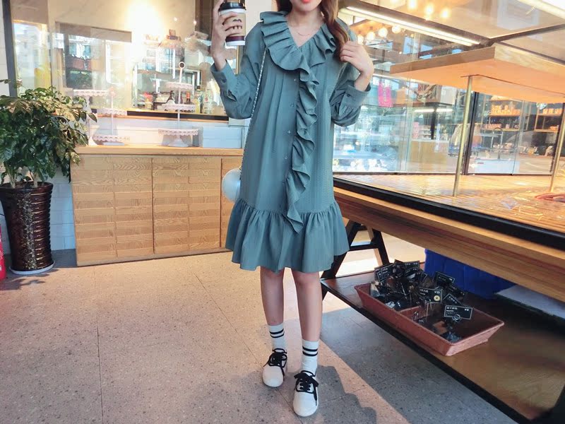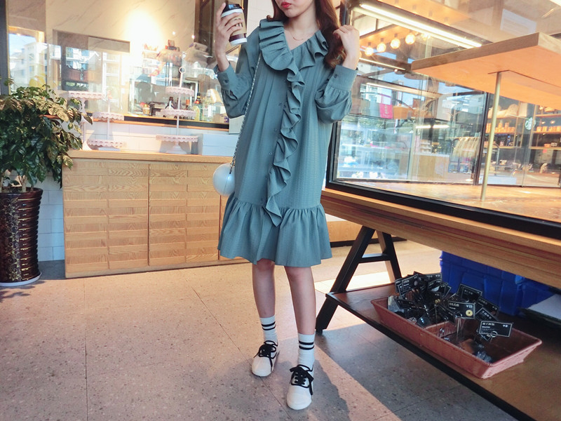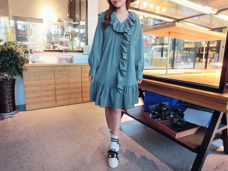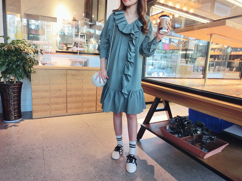 2019春裝新款韓版中長款荷葉邊魚尾裙女純色氣質百搭連衣裙潮1入