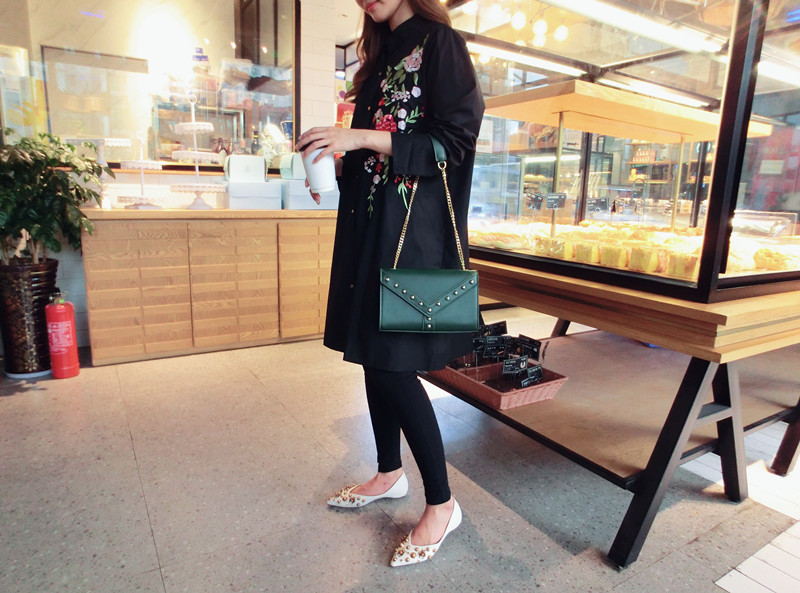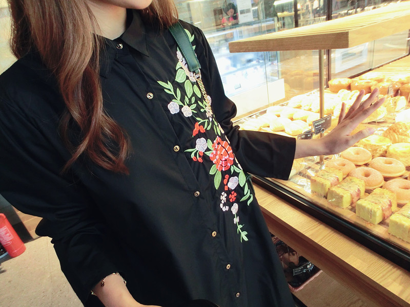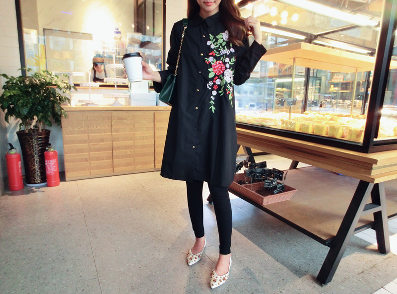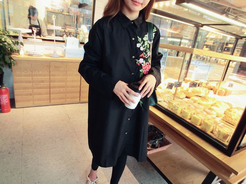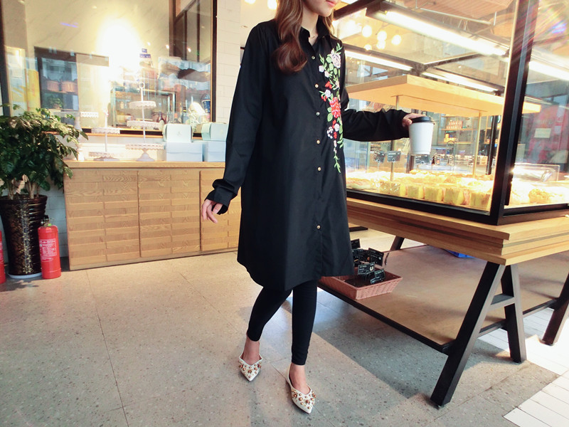 2019春季新款花朵刺繡長袖中長款黑色韓版寬松襯衫連衣裙女912-81入