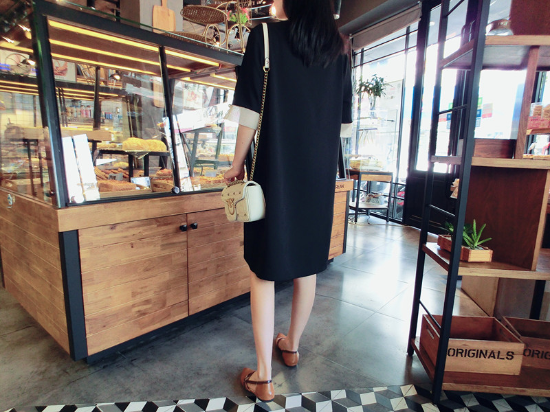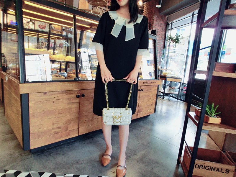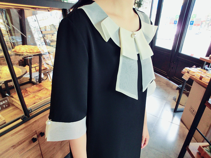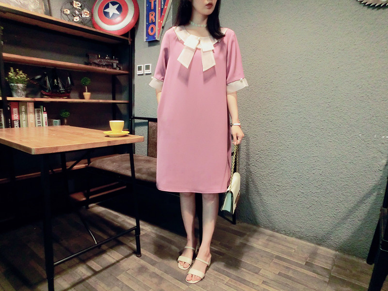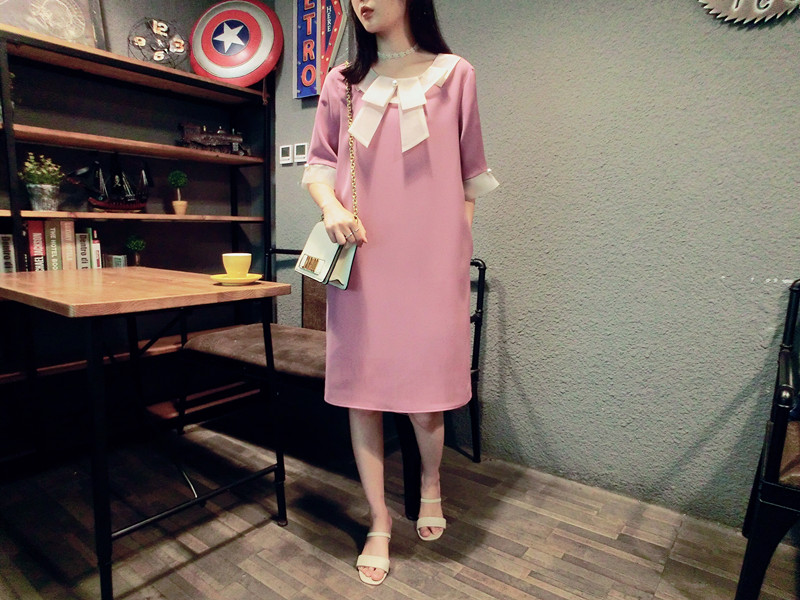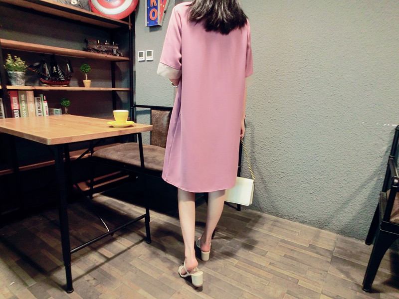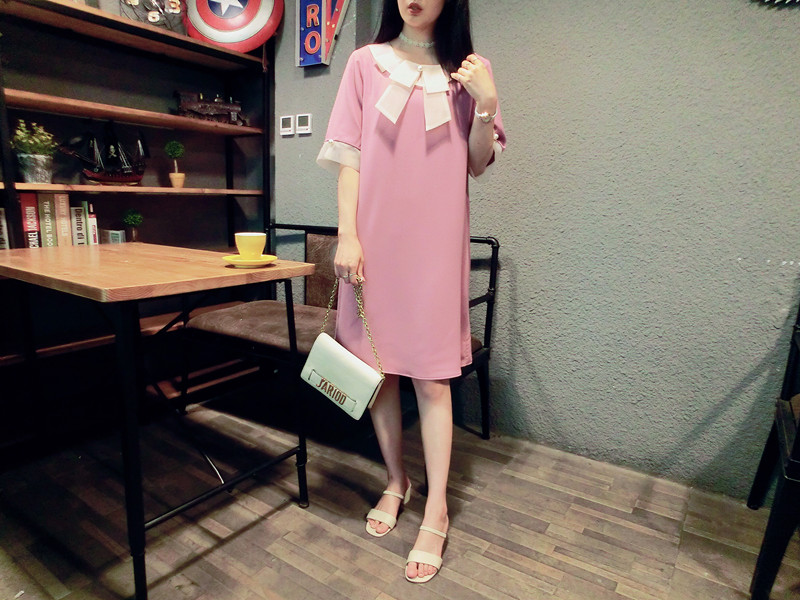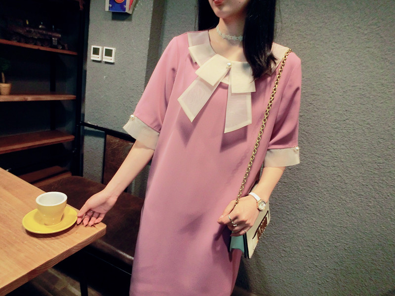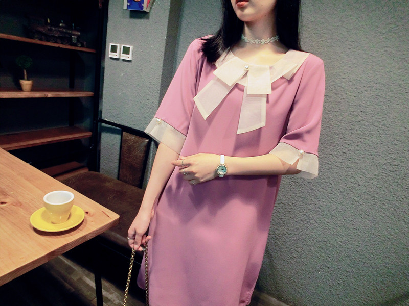 2018夏新品女寬松歐根紗拼接蝴蝶結短袖中長款雪紡韓版大碼連衣裙1入