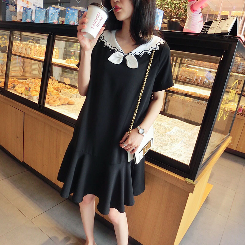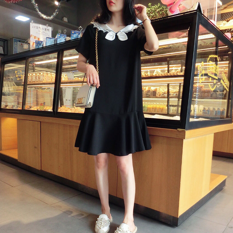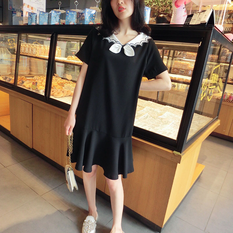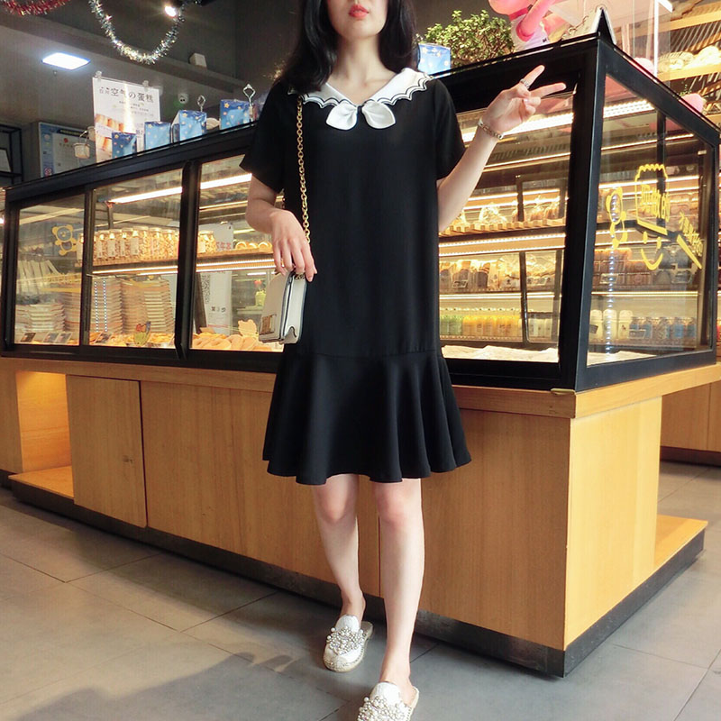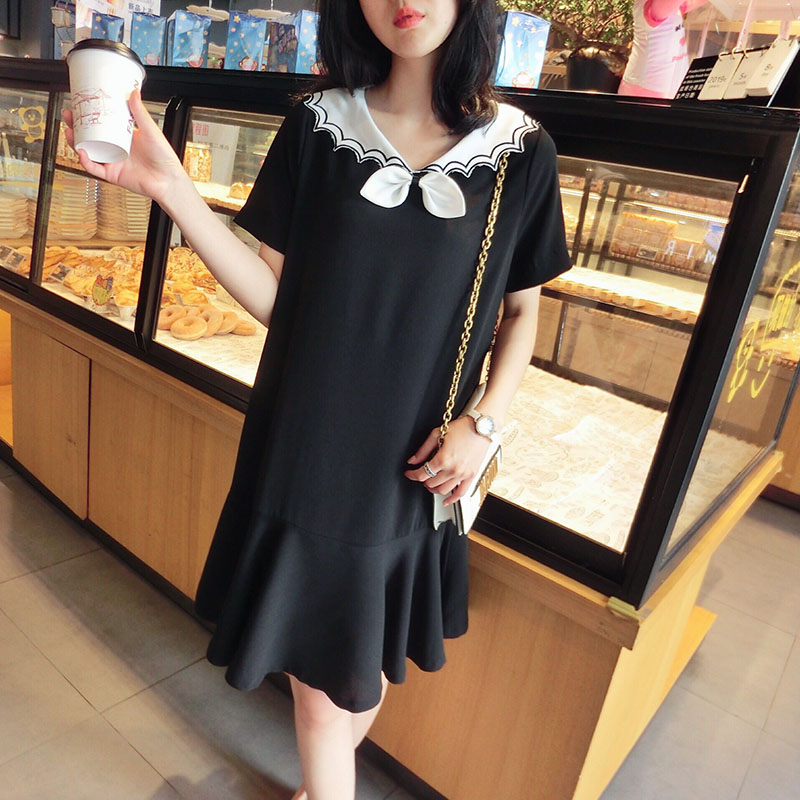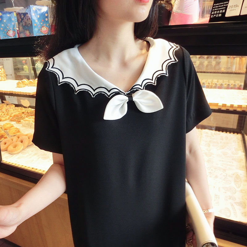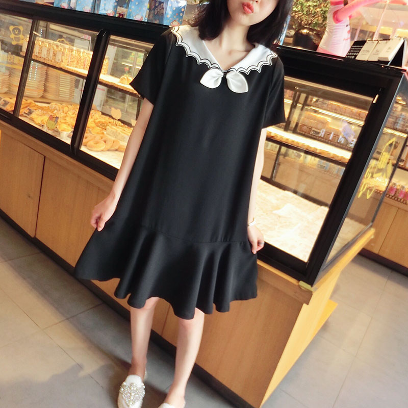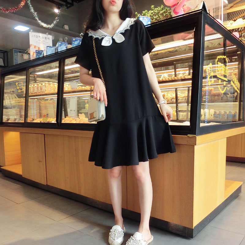 2019韓版翻領蝴蝶結連衣裙女寬松中長款寬松顯瘦荷葉邊純色學院風1入