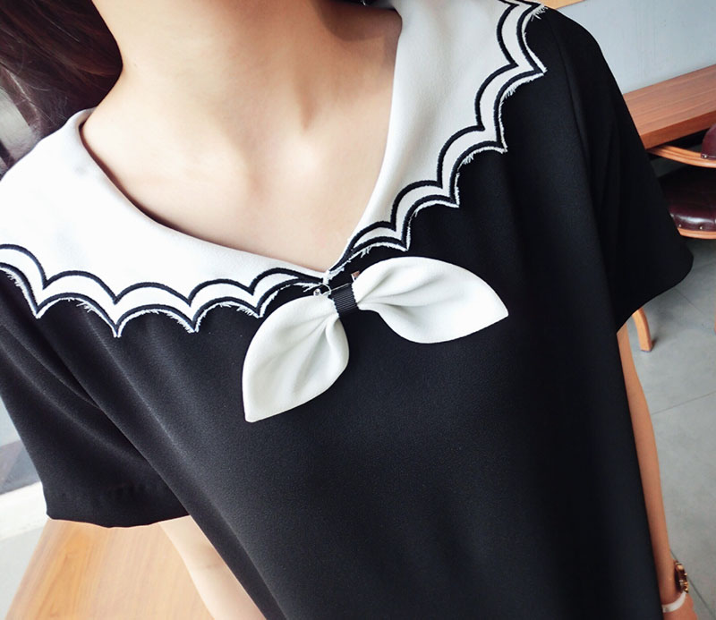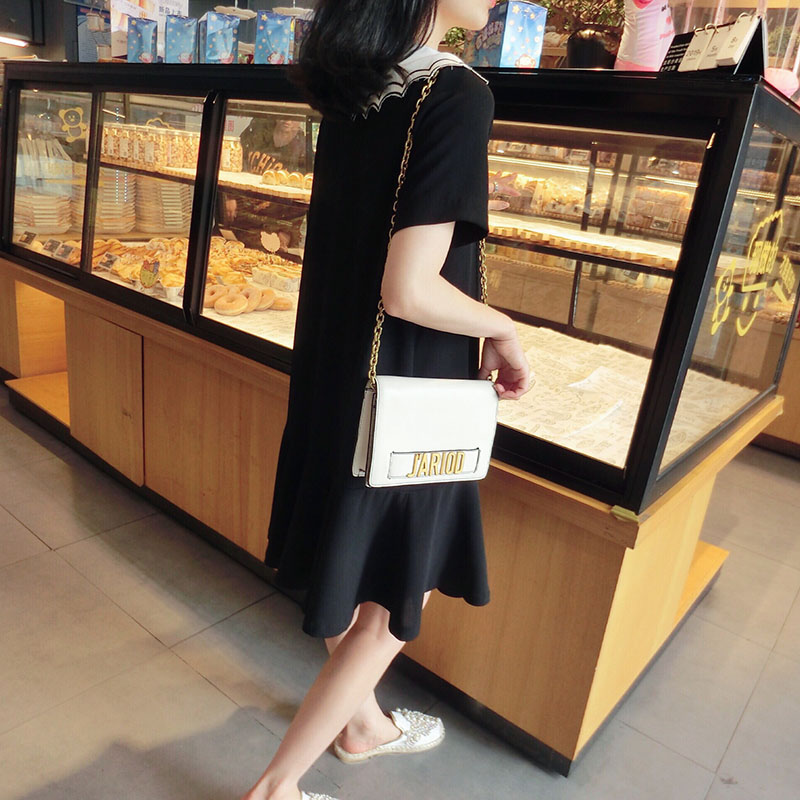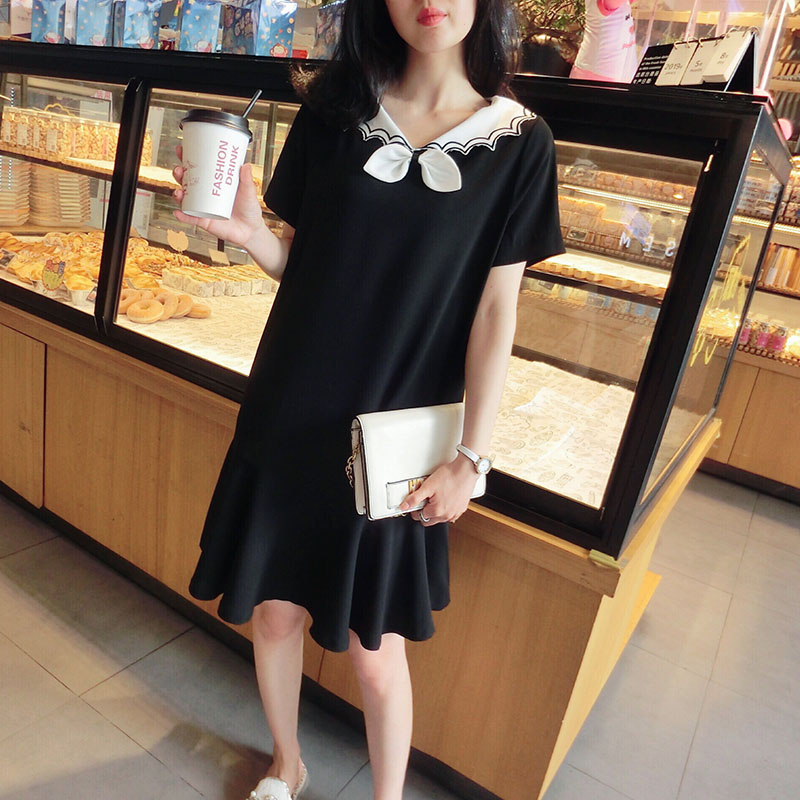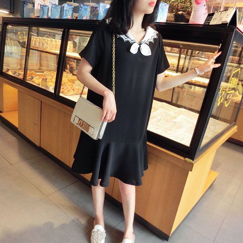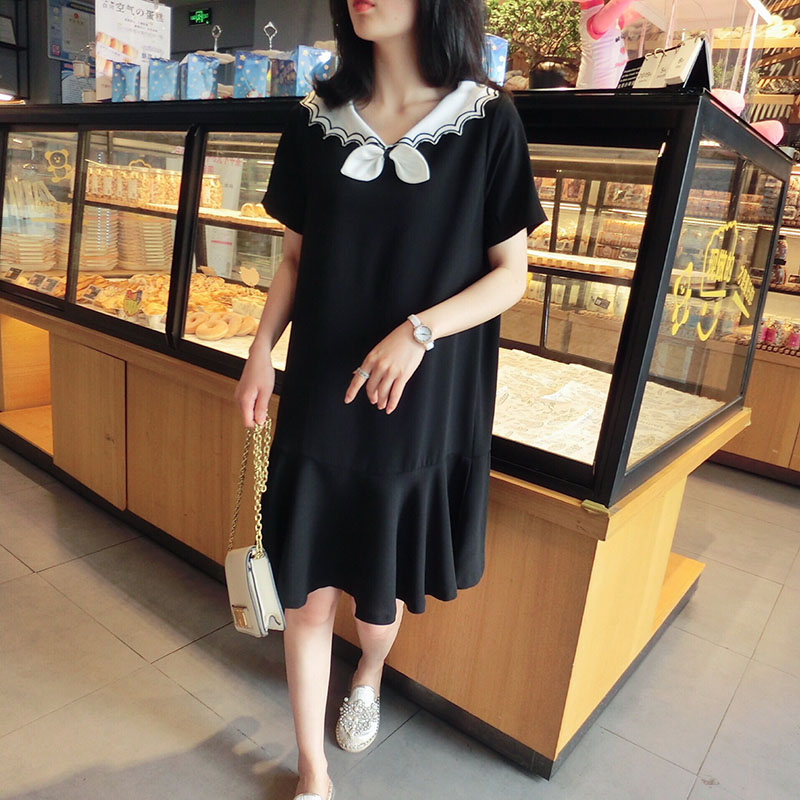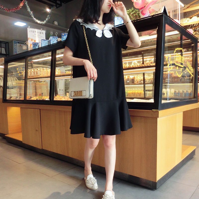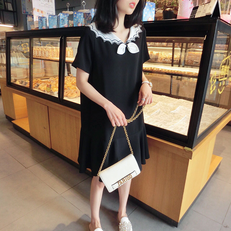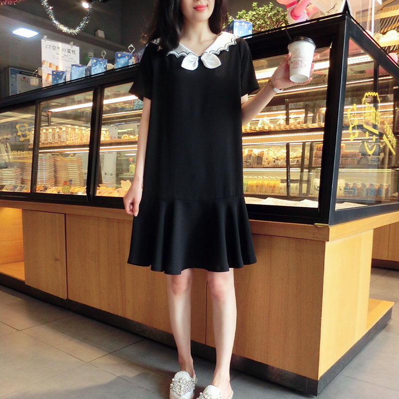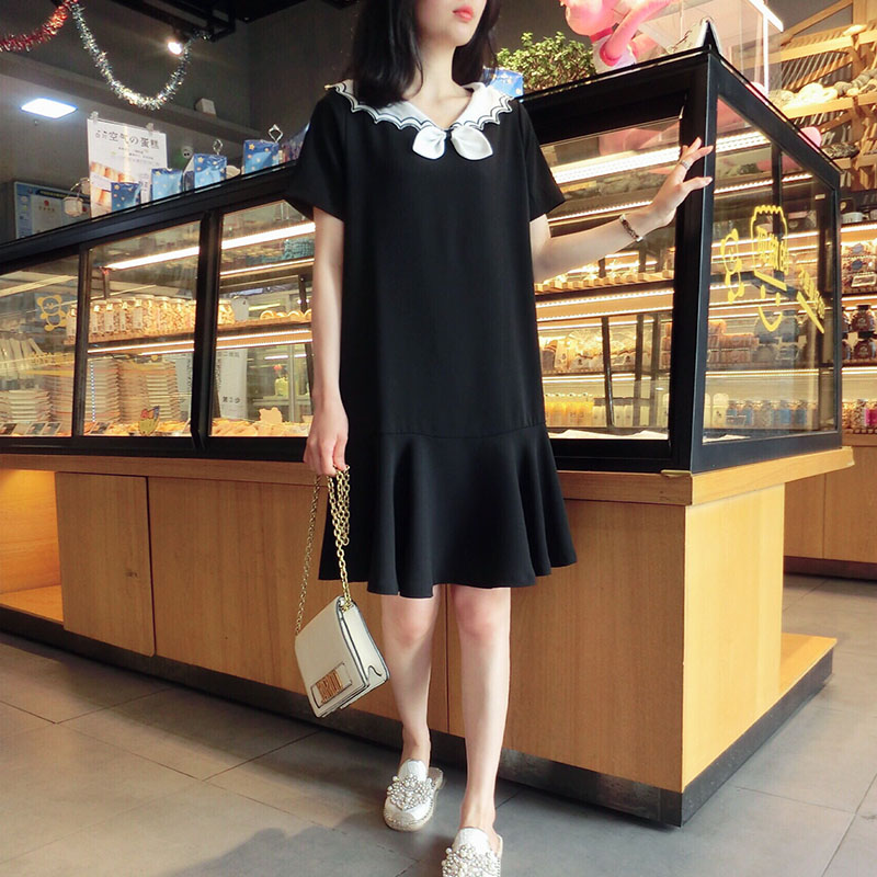 2019韓版翻領蝴蝶結連衣裙女寬松中長款寬松顯瘦荷葉邊純色學院風1入