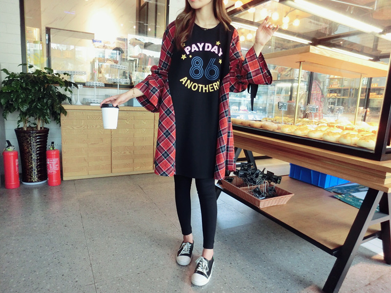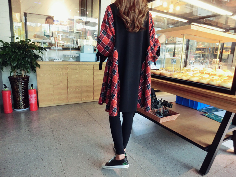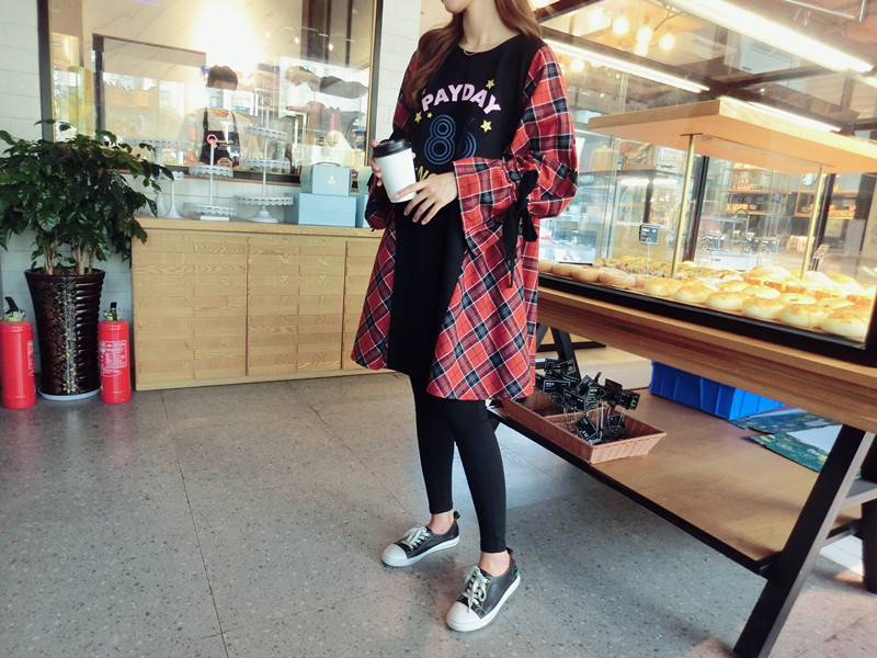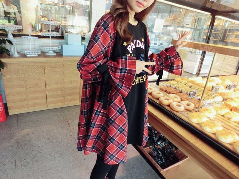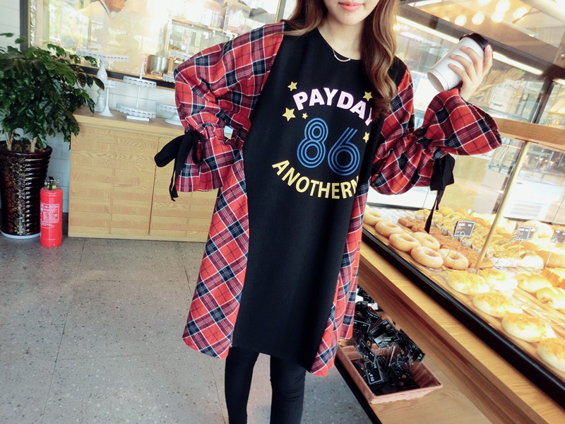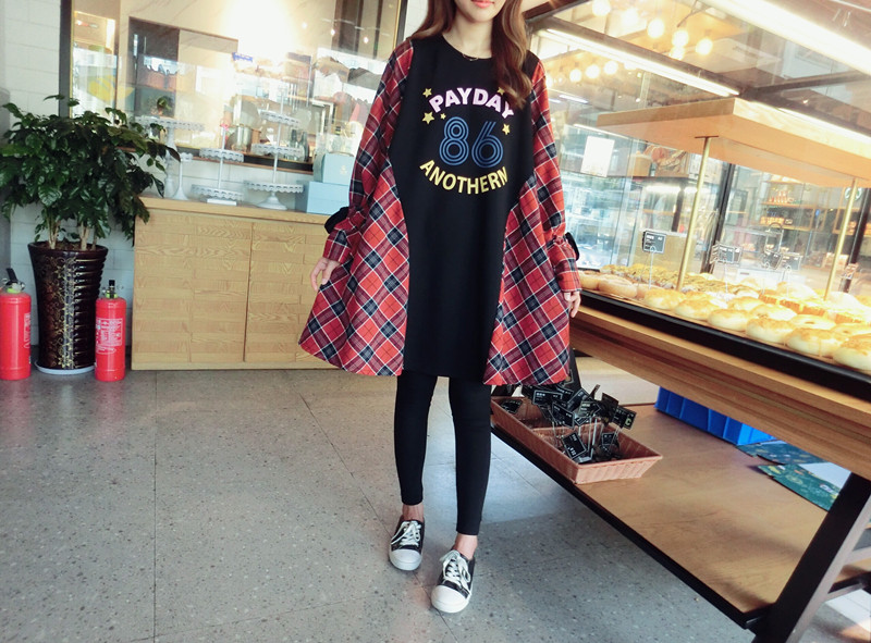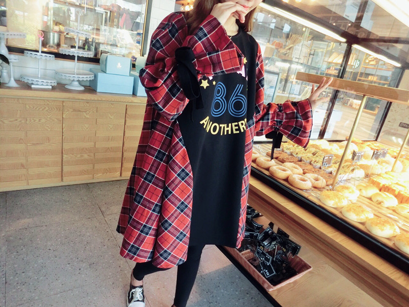 韓國東大門2019秋新款女格子拼接連衣裙喇叭袖韓版字母廓形衛衣裙1入