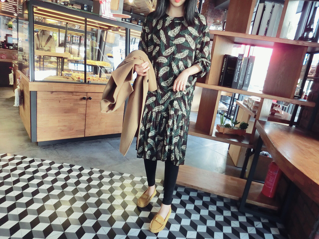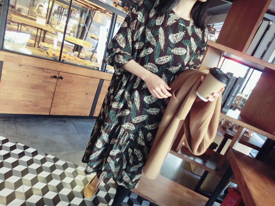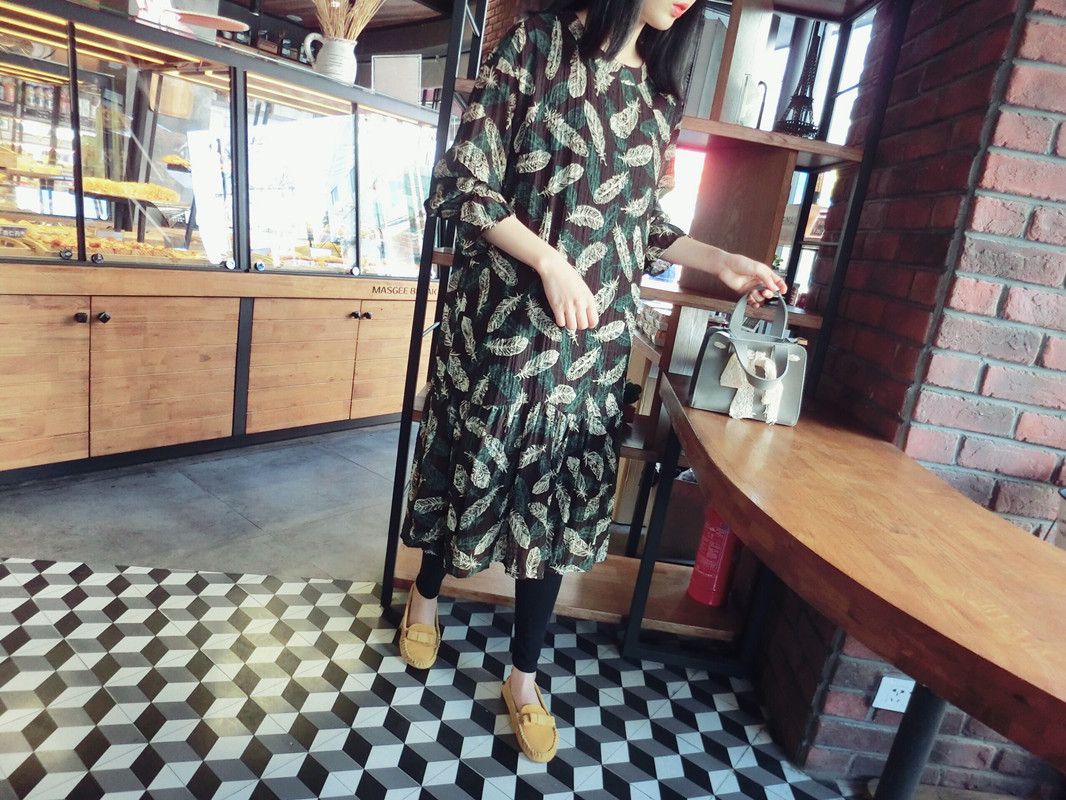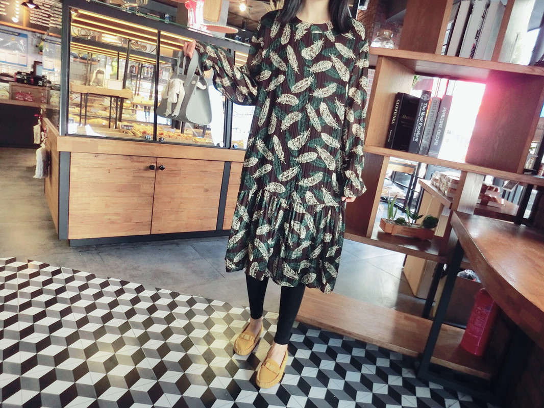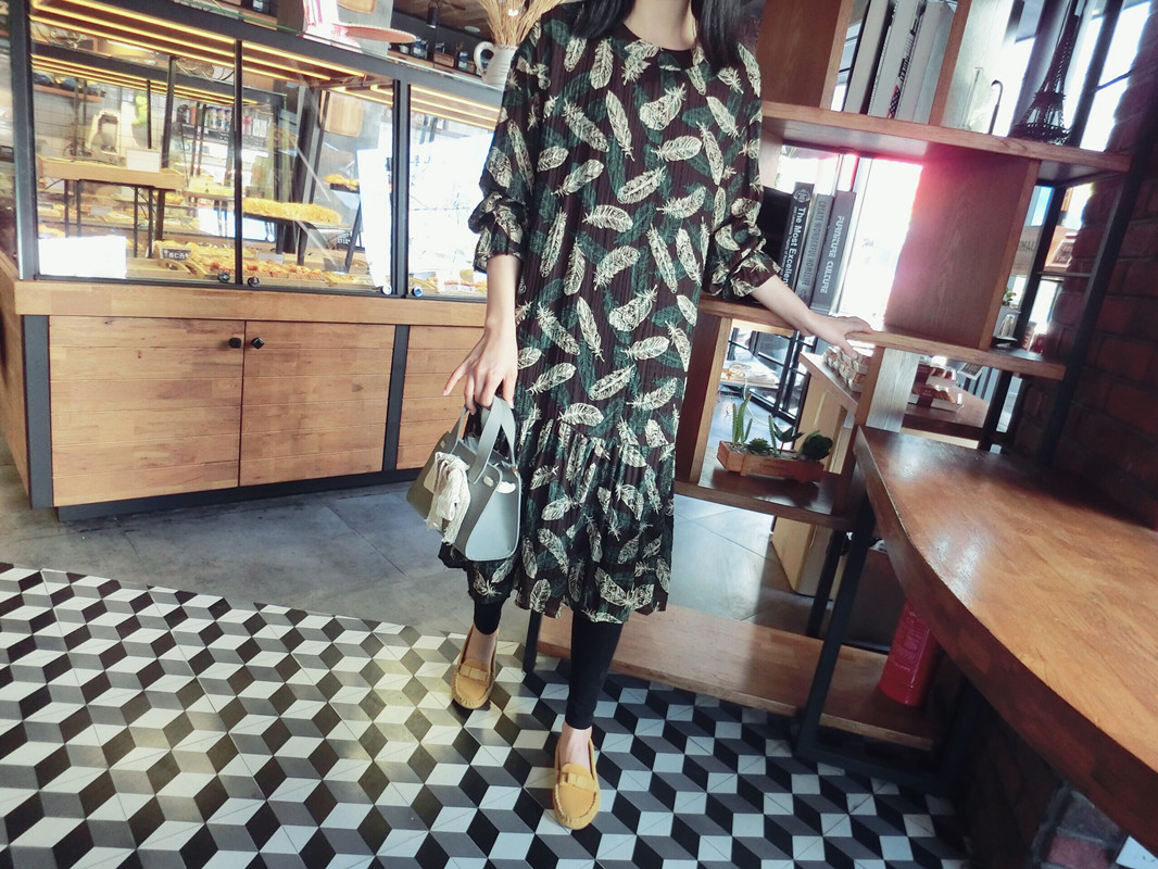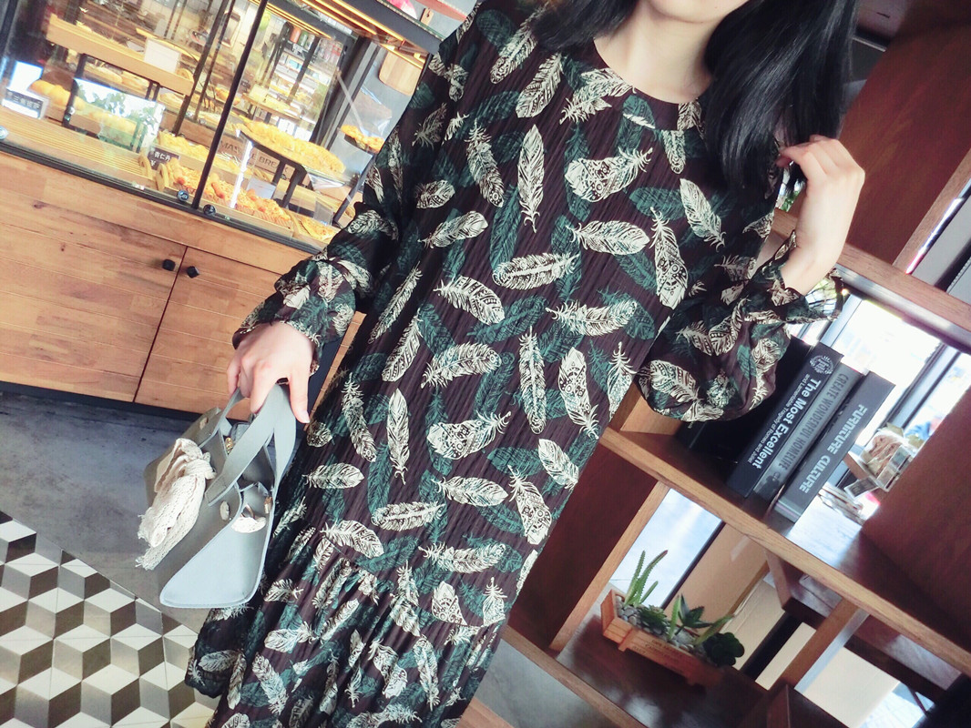 2018春季打底裙中長款韓版寬松荷葉邊裙復古羽毛花色連衣裙1入