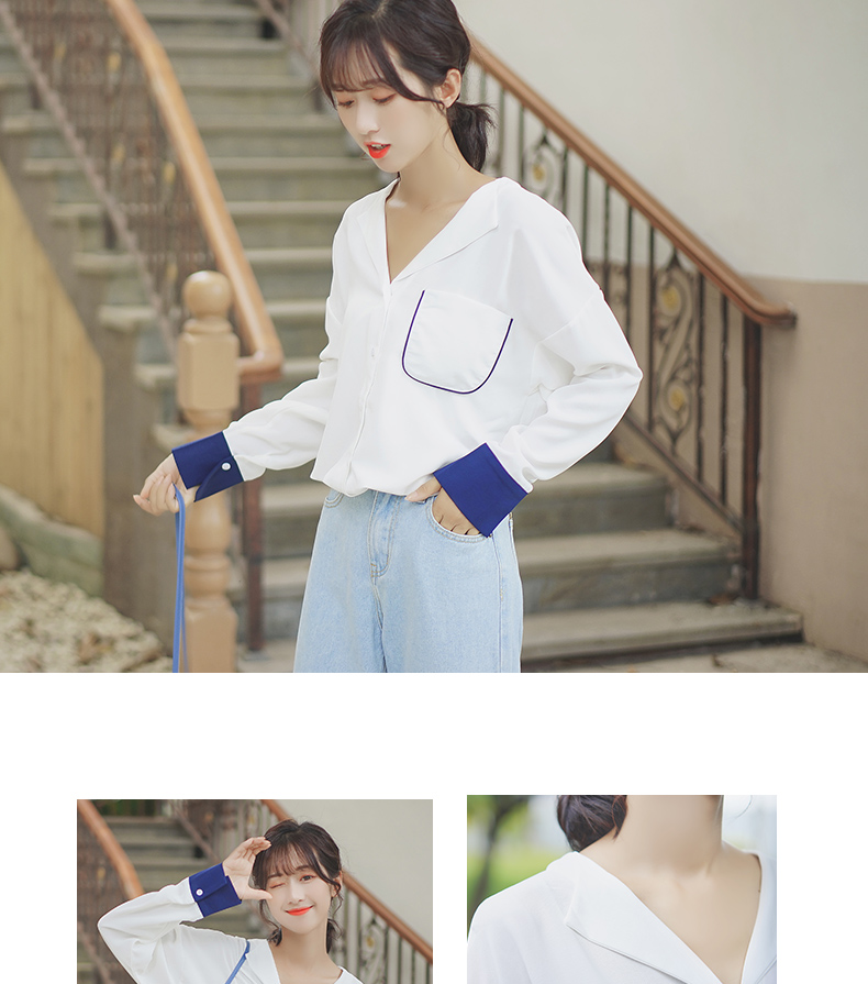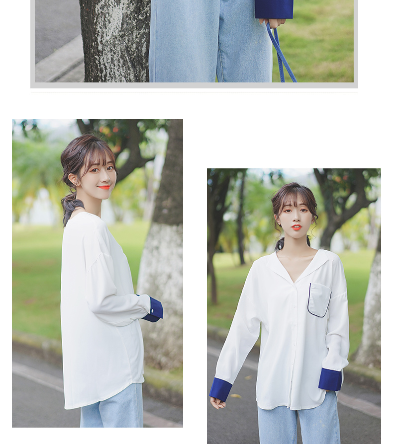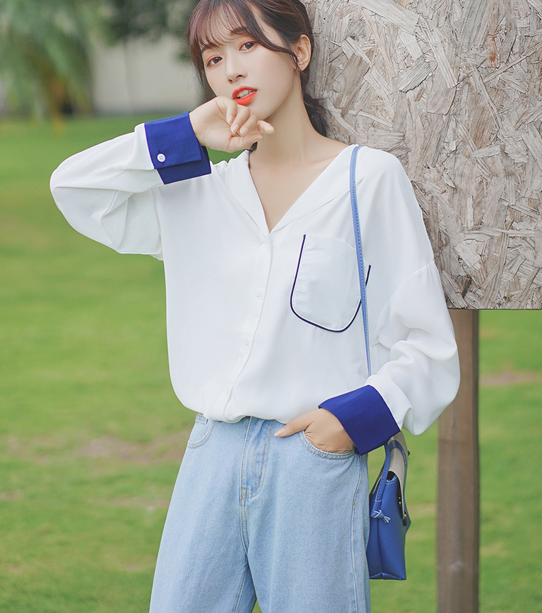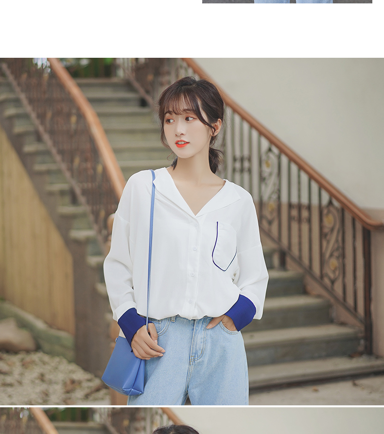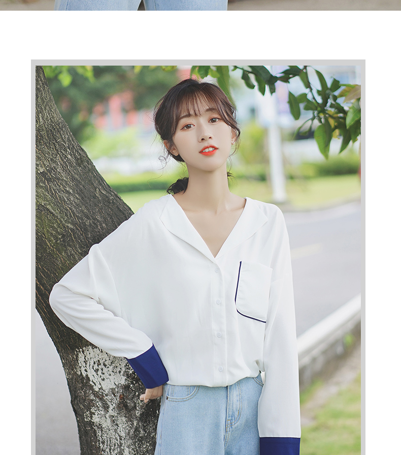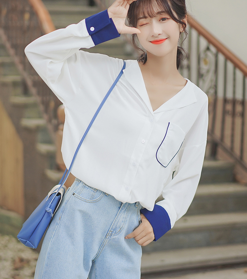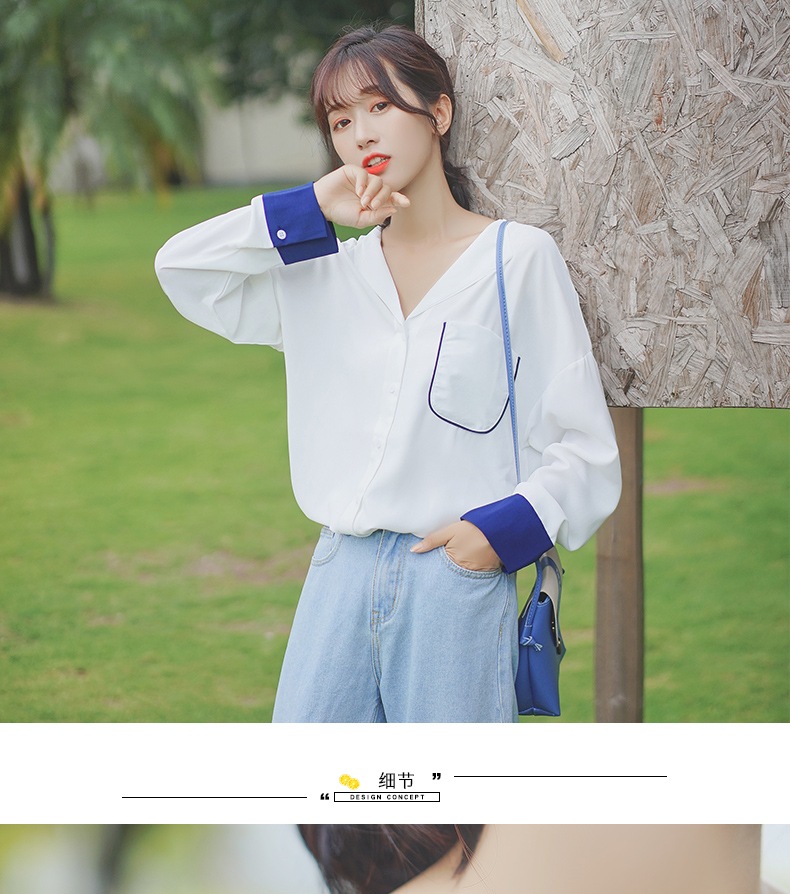 2019新款春秋韓范長袖上衣寬松百搭學生打底襯衣設計感拼色襯衫女1入