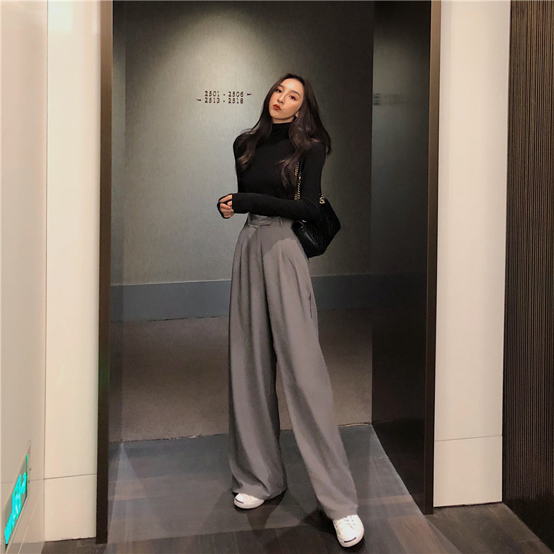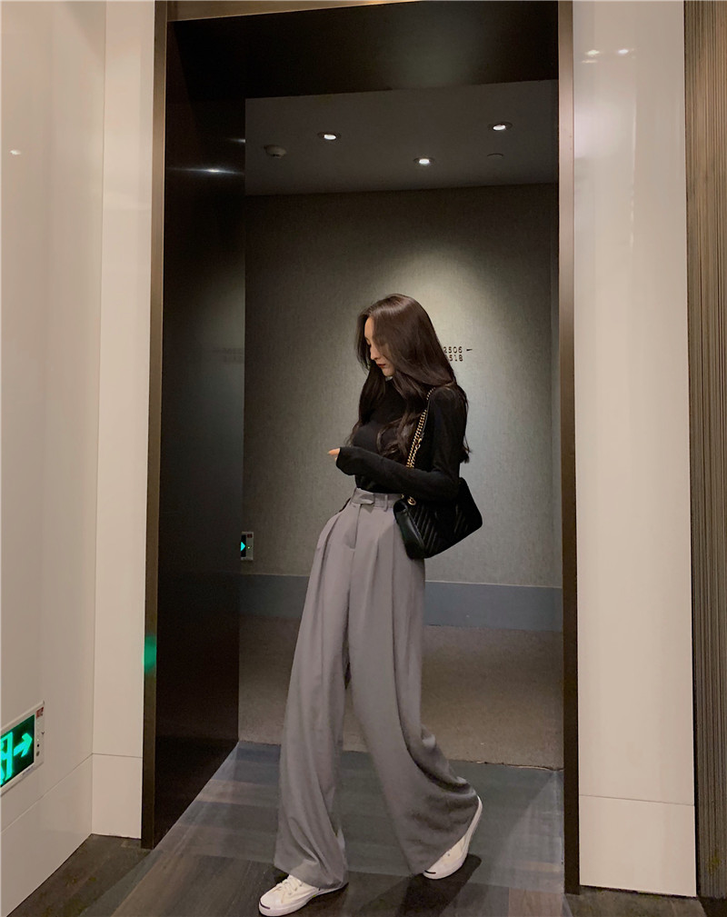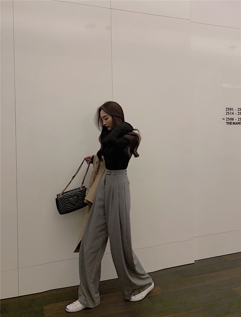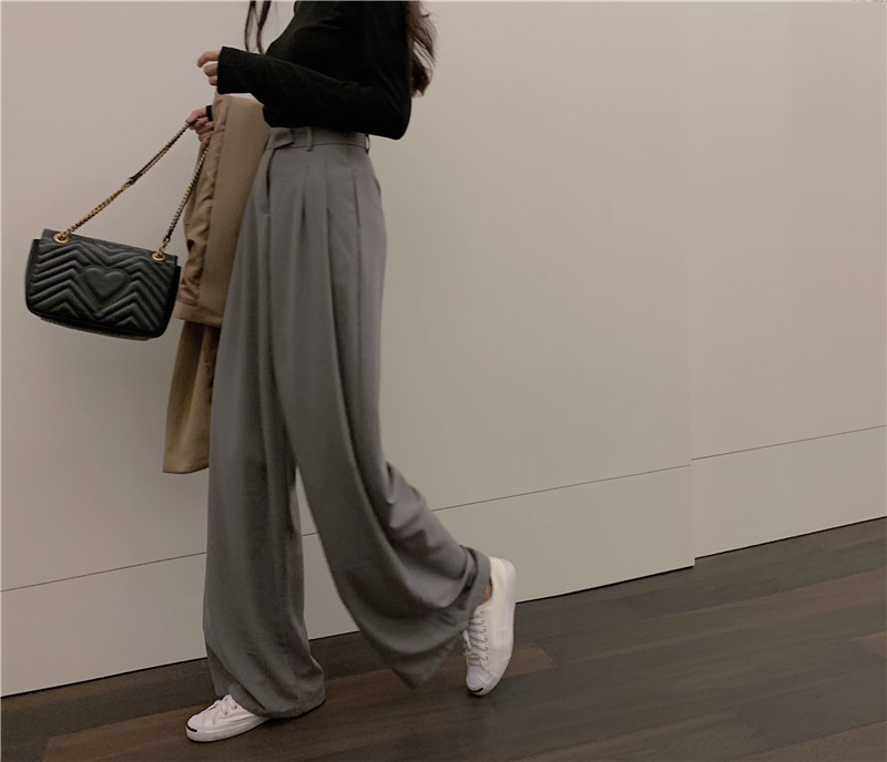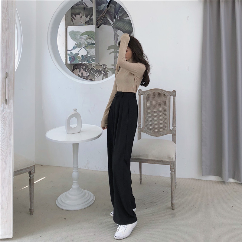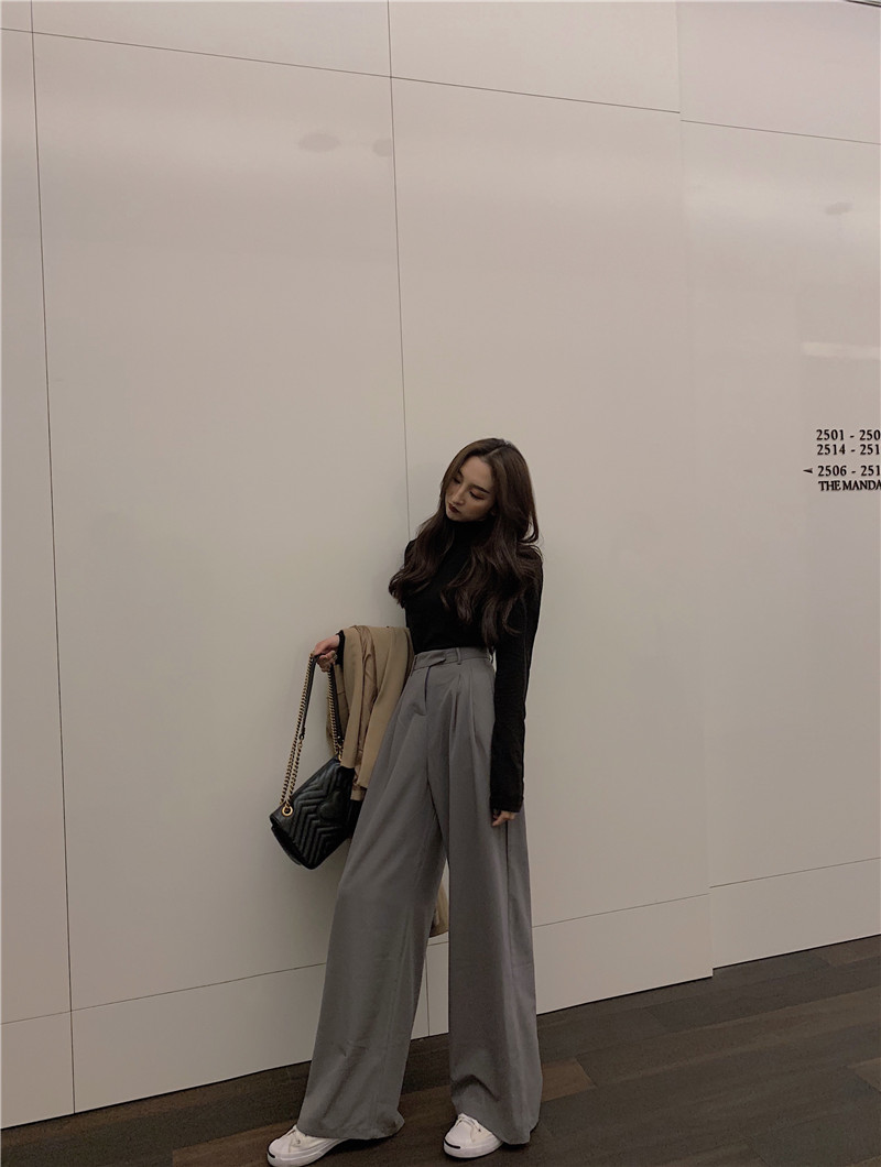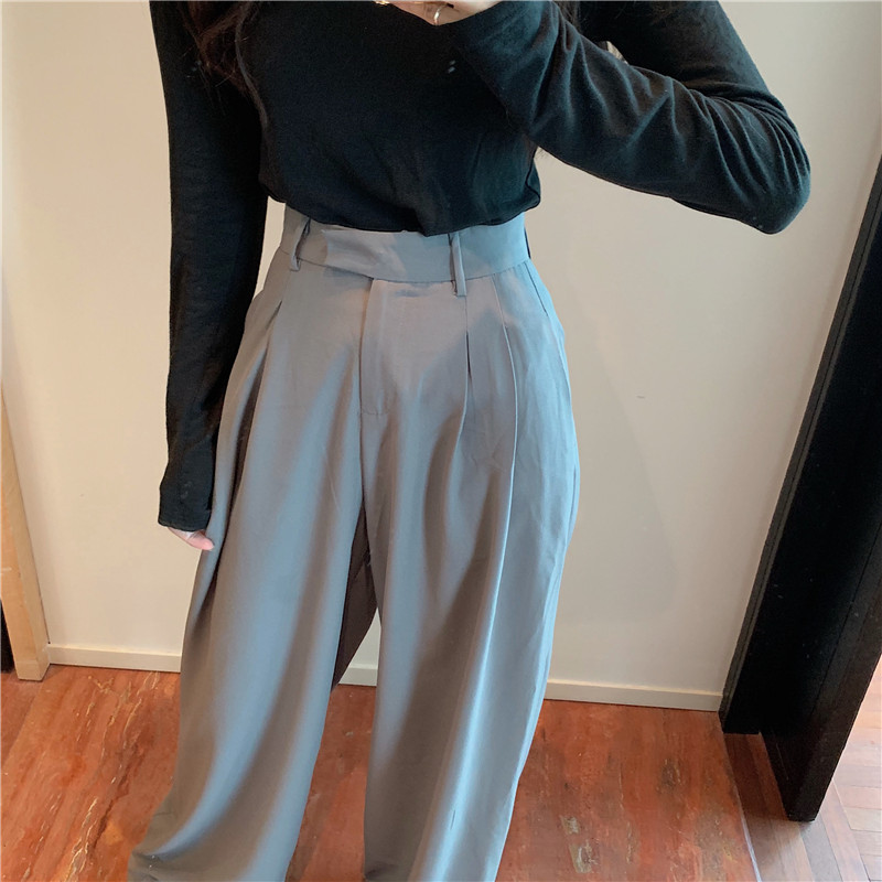 風休閑褲子女高腰寬松直筒褲百搭闊腿褲女西裝長褲1入