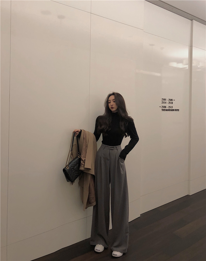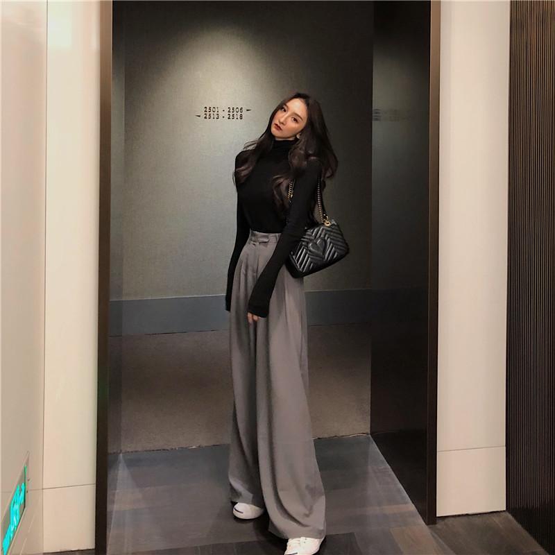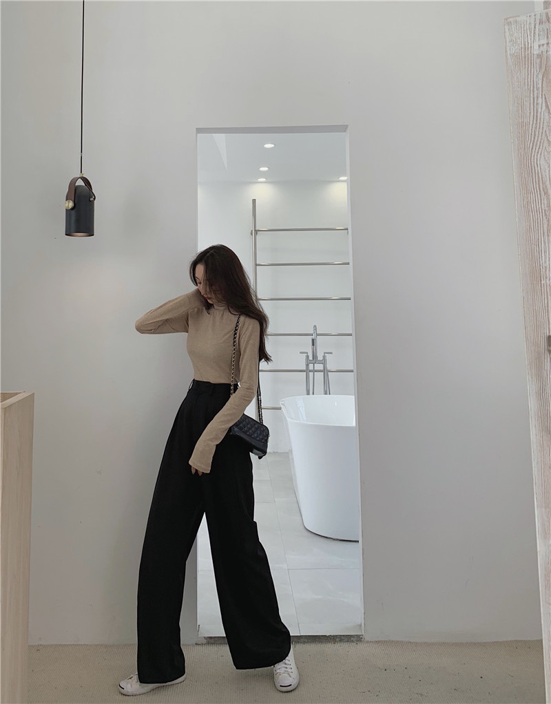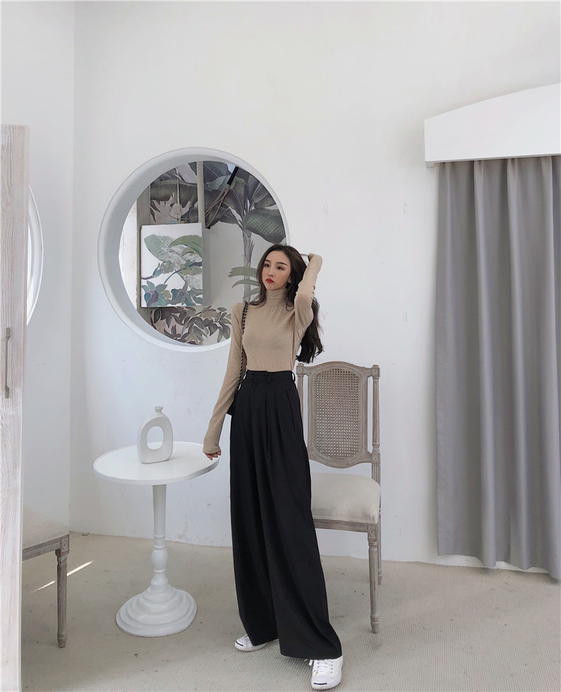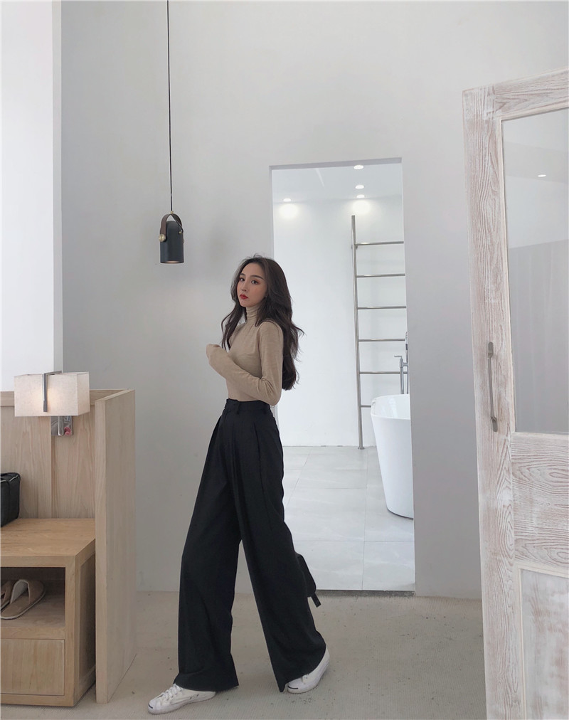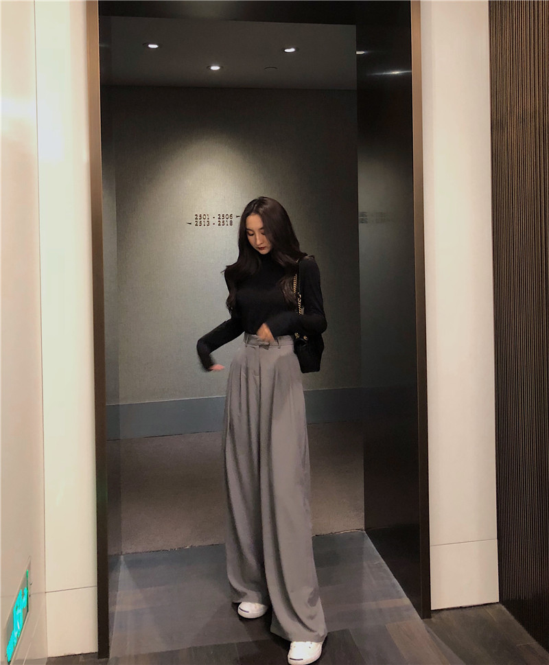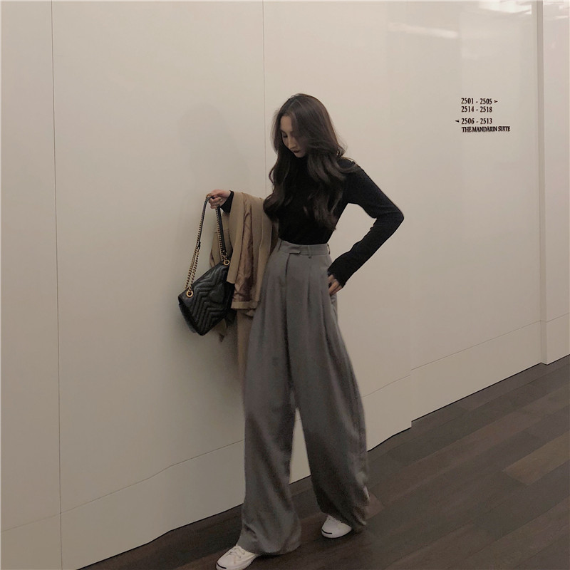 風休閑褲子女高腰寬松直筒褲百搭闊腿褲女西裝長褲1入