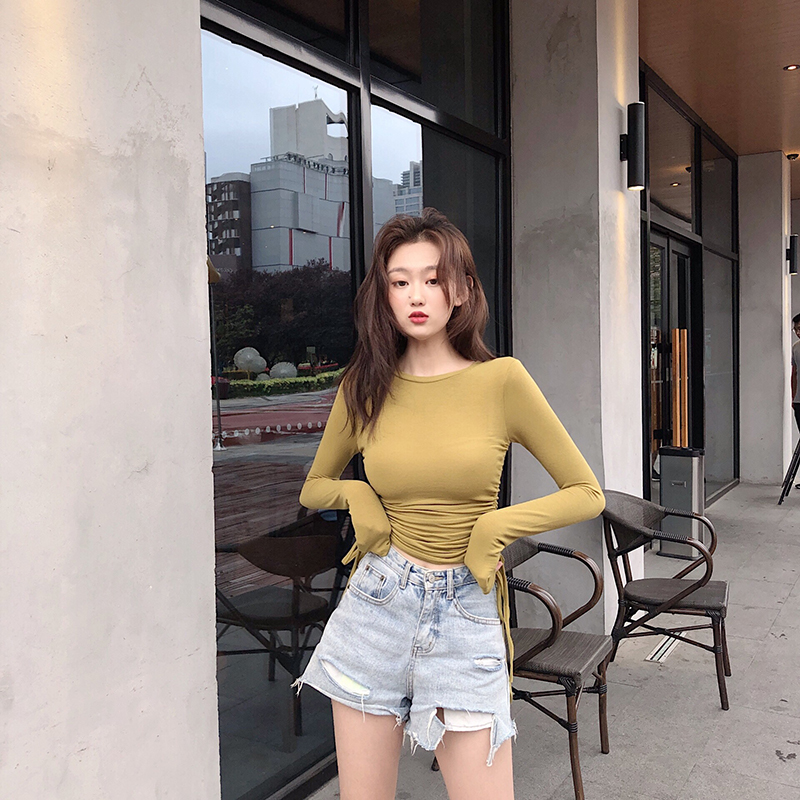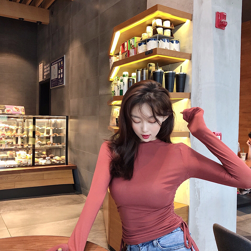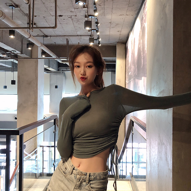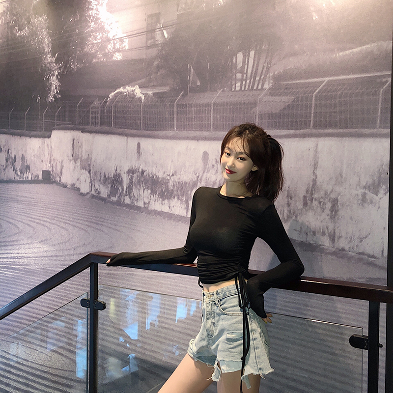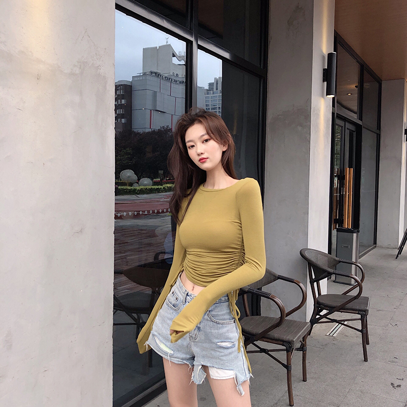 風2019秋季新款圓領修身打底衫上衣女抽繩長袖T恤1入