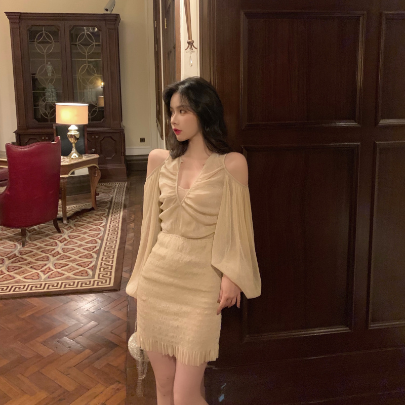 風水滴鏤空銀絲挖剪漏肩V領性感包臀短款氣質連衣裙1入