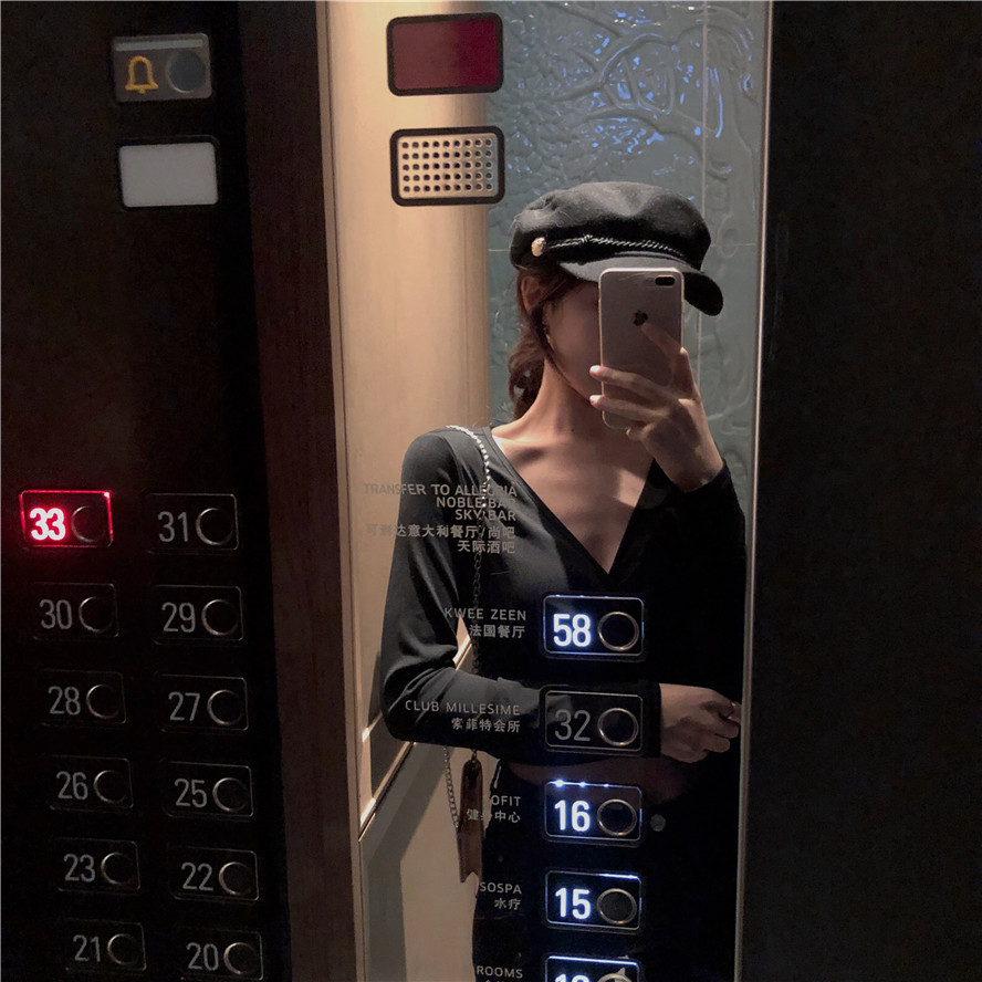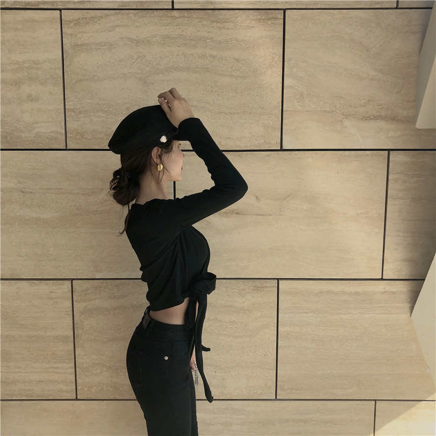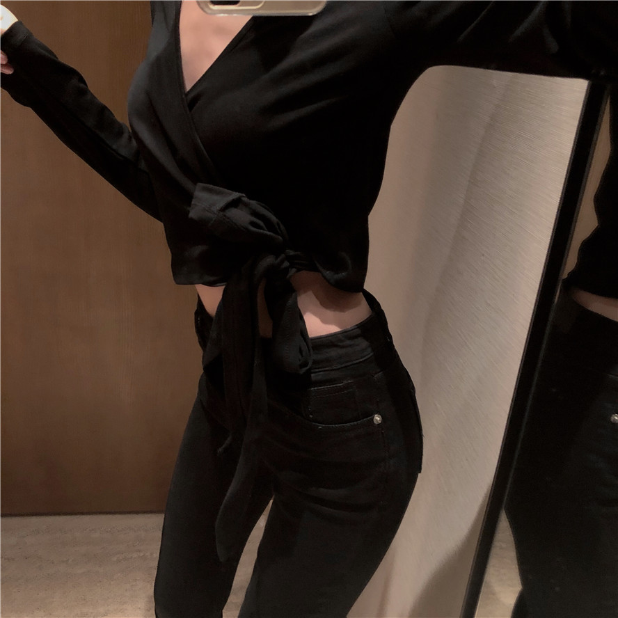 風心機上衣女修身短款V領綁帶長袖T恤2019秋季新款1入
