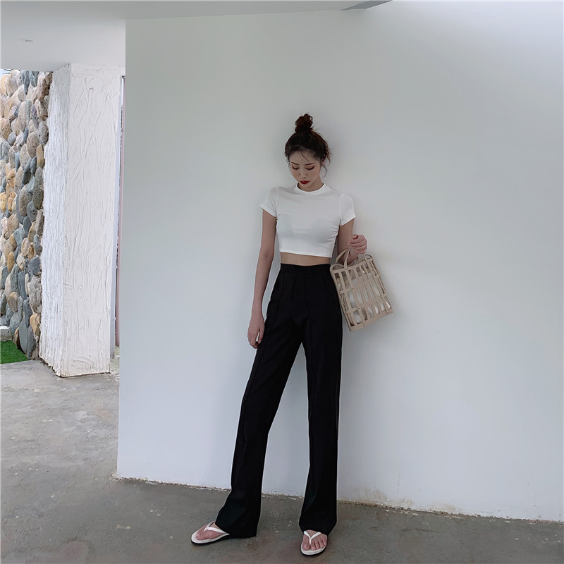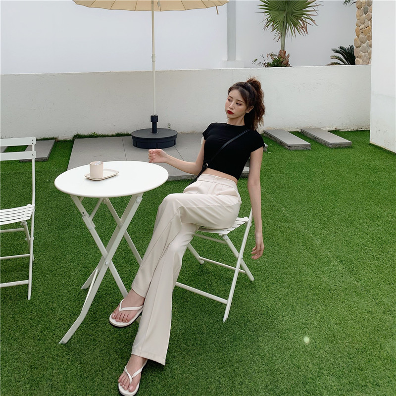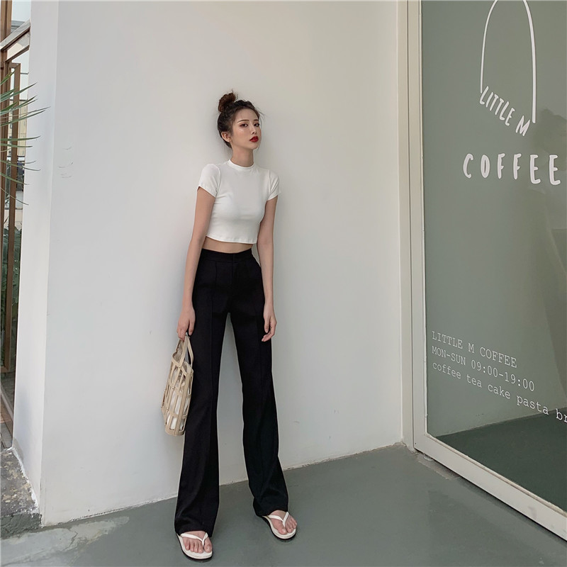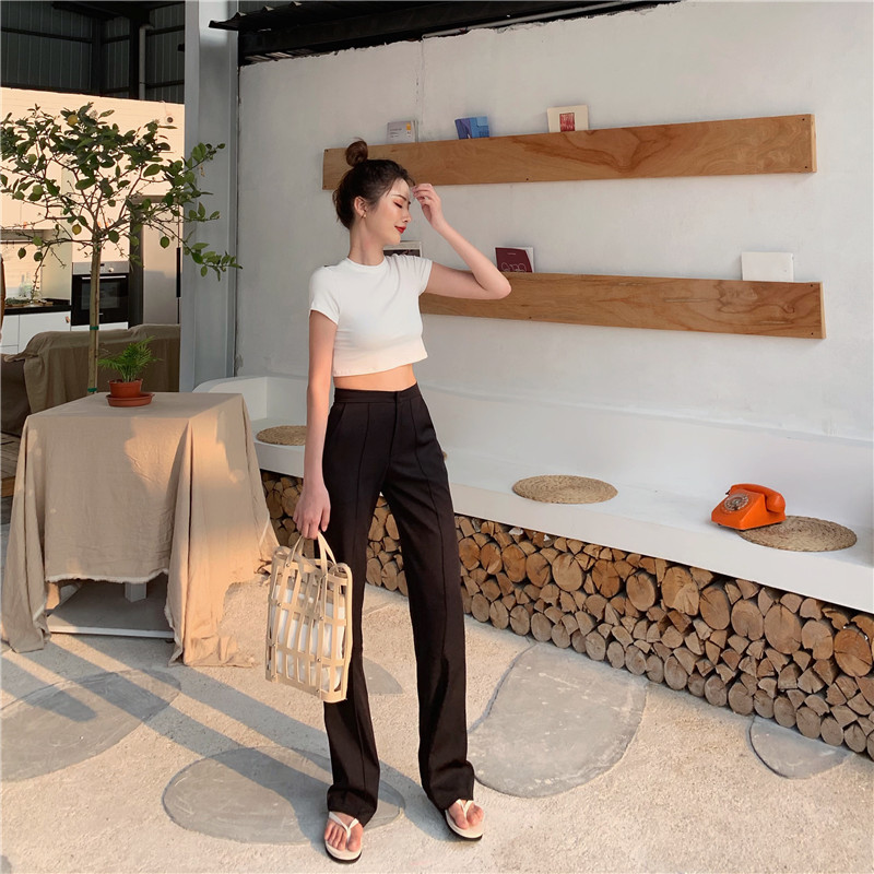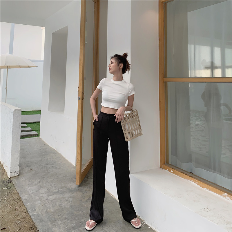 風休閑褲女夏季新款韓版高腰拖地褲直筒微喇叭長褲1入