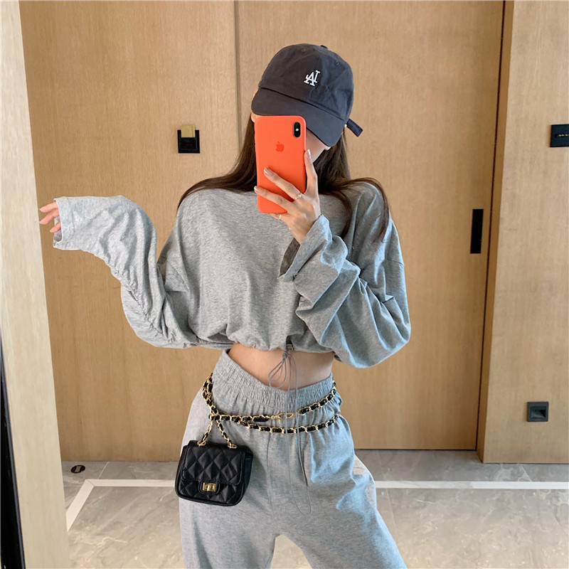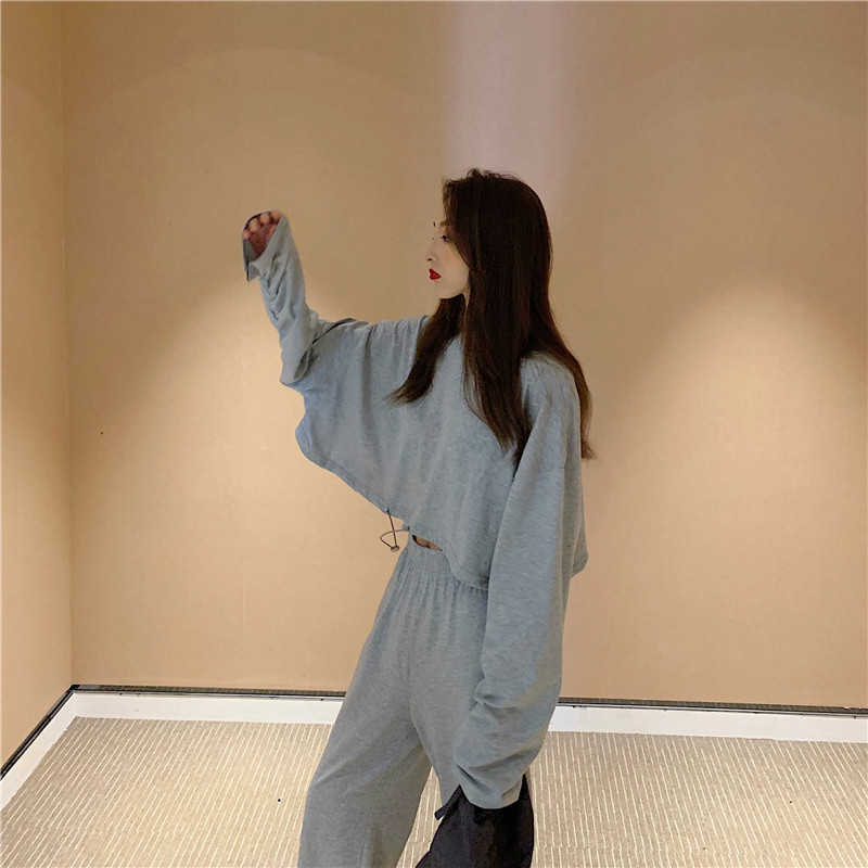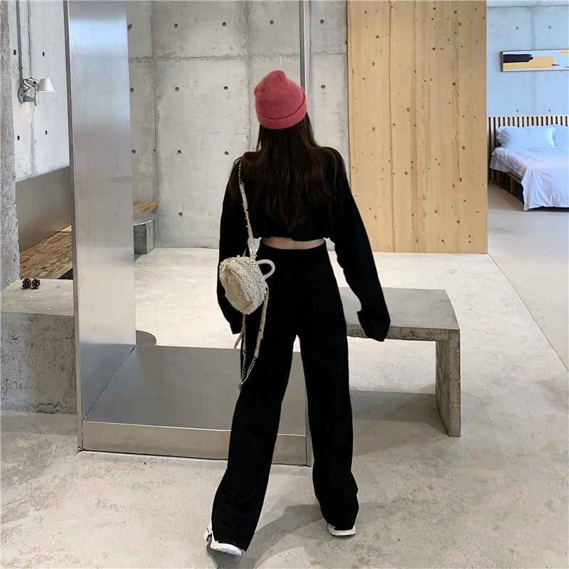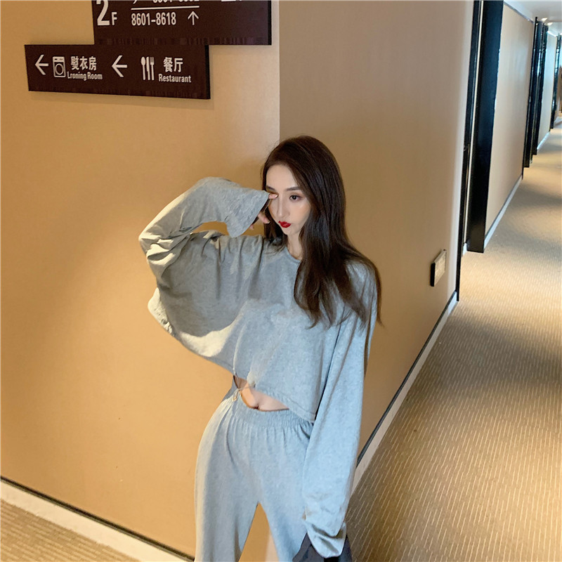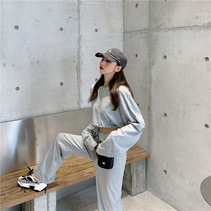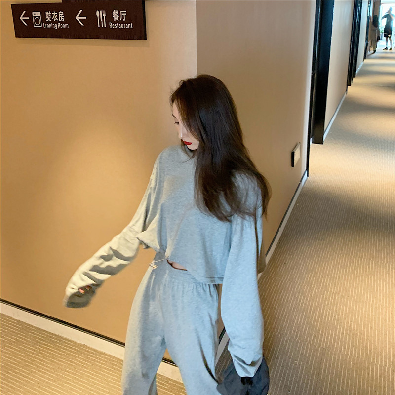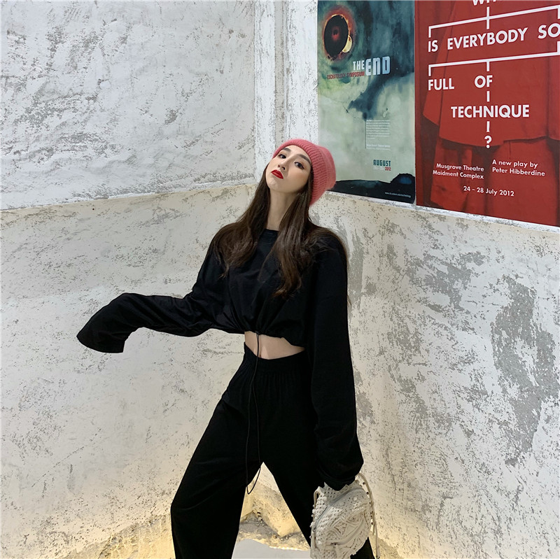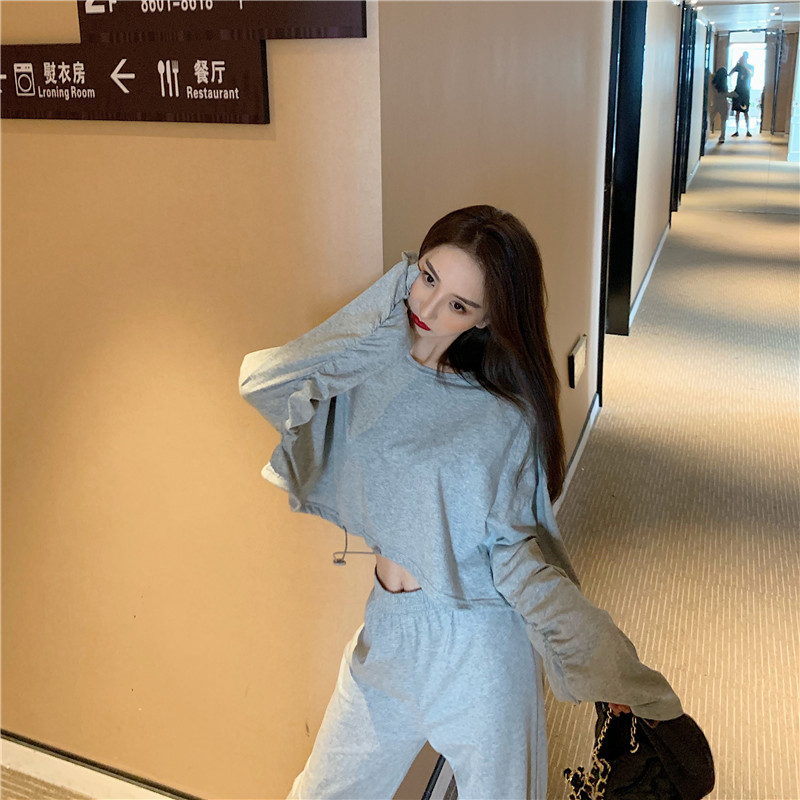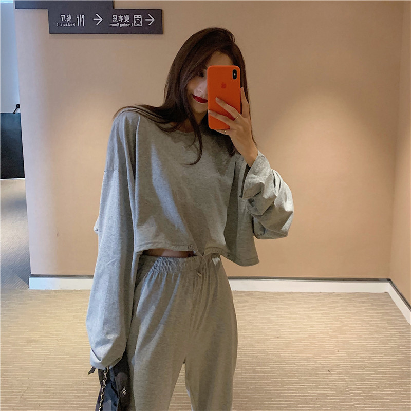 2019秋季套裝女短款長袖寬松T恤+高腰顯瘦休閑運動褲子1入