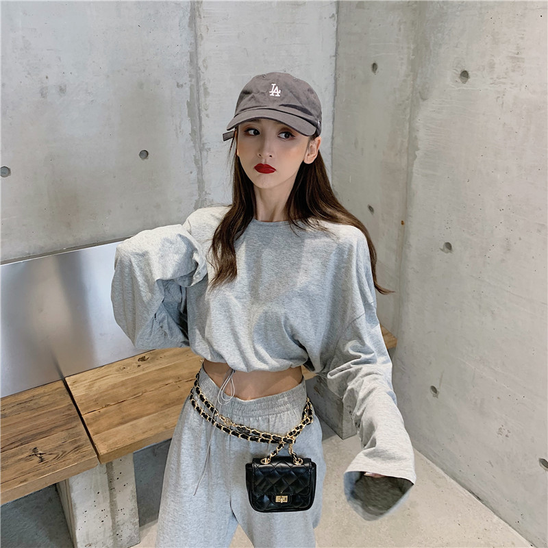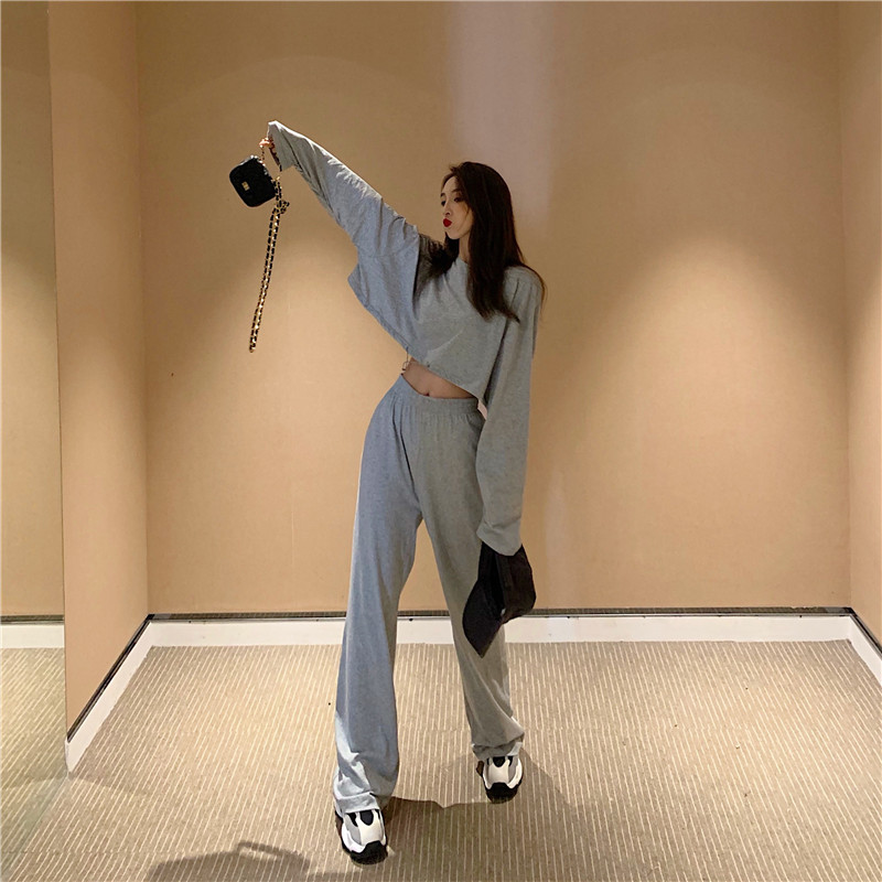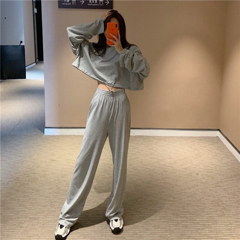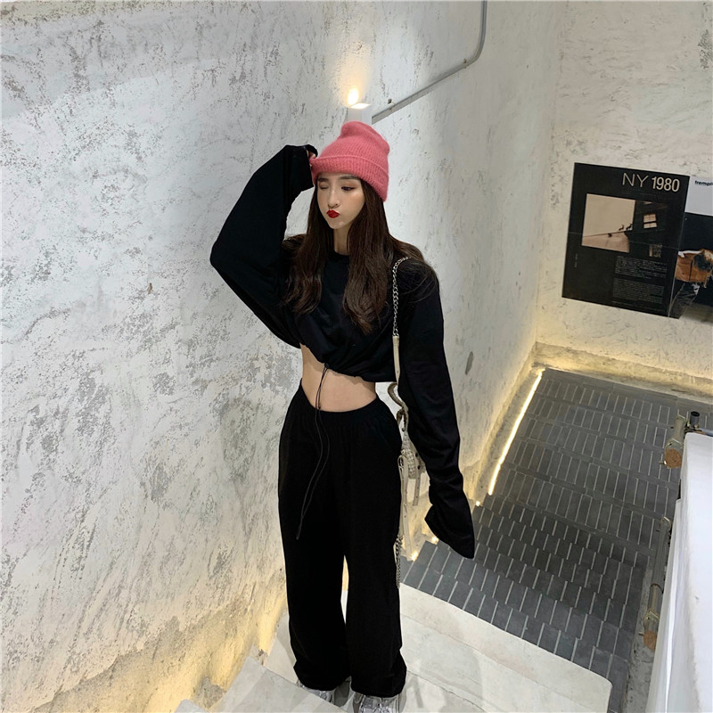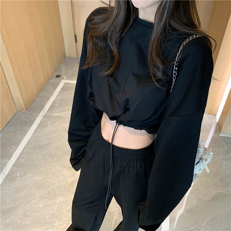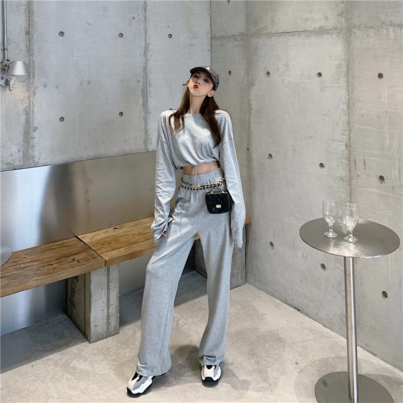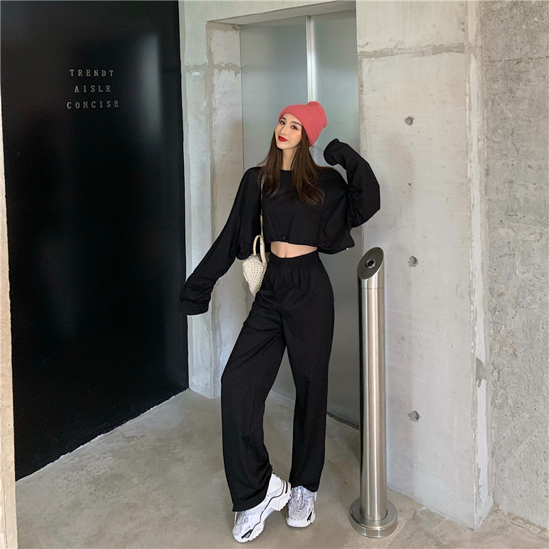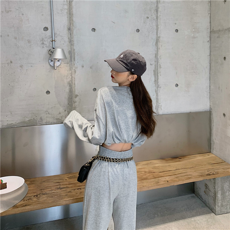 2019秋季套裝女短款長袖寬松T恤+高腰顯瘦休閑運動褲子1入