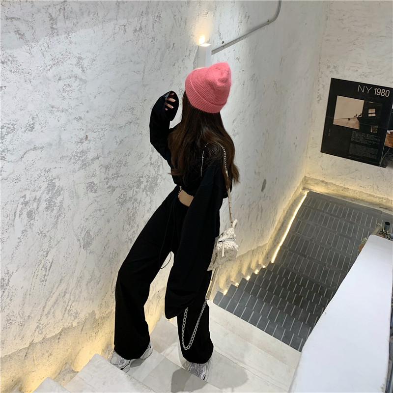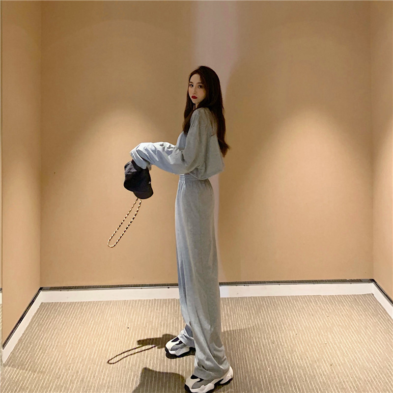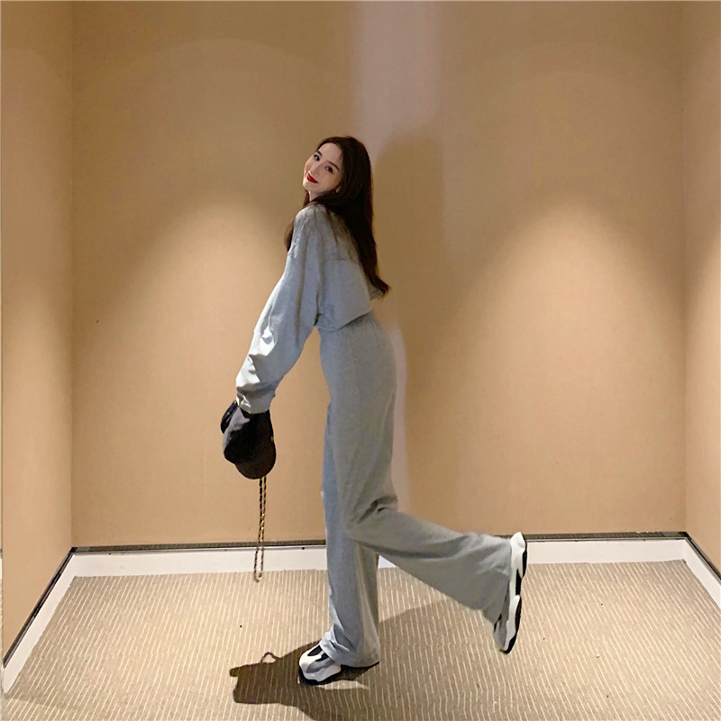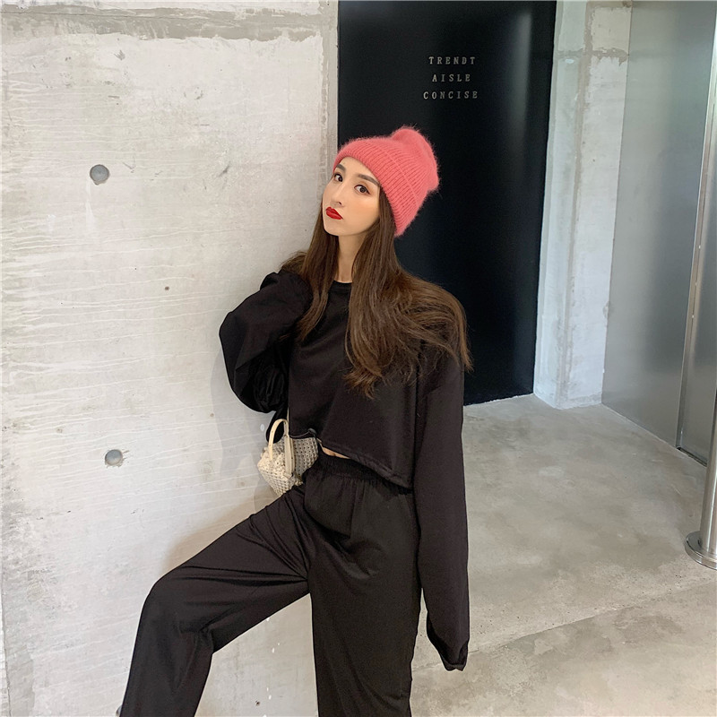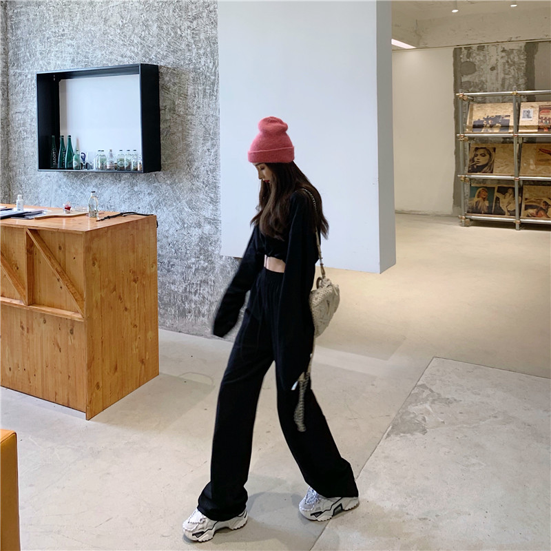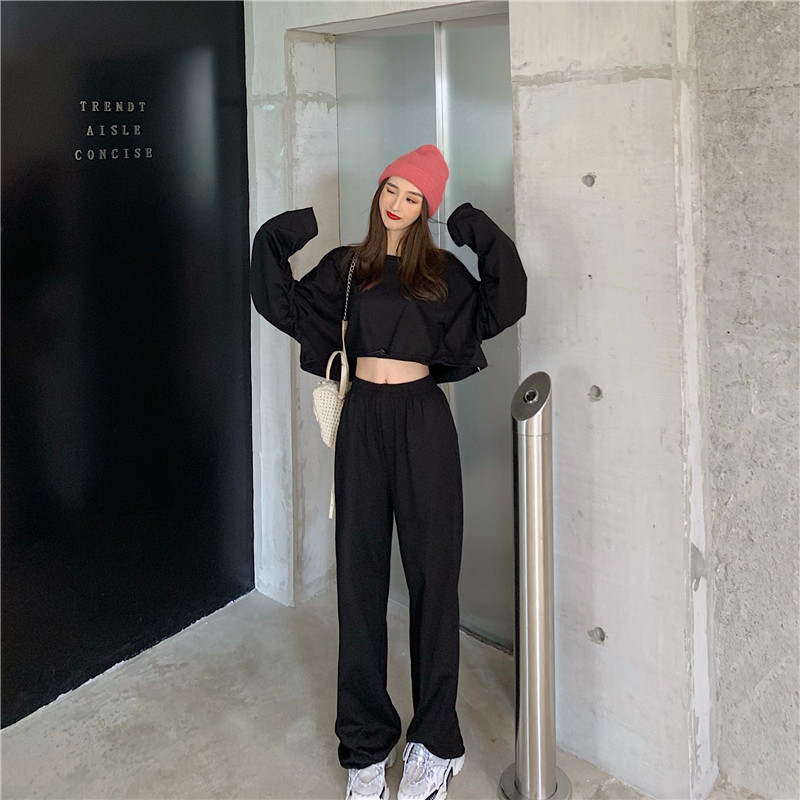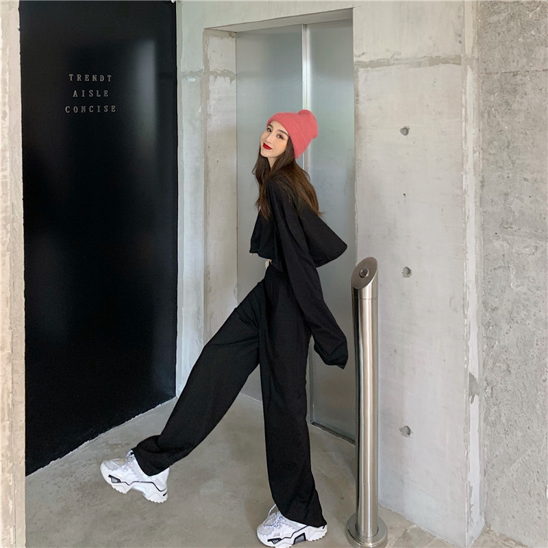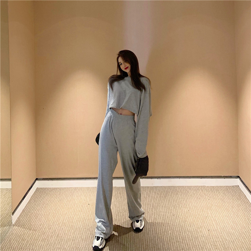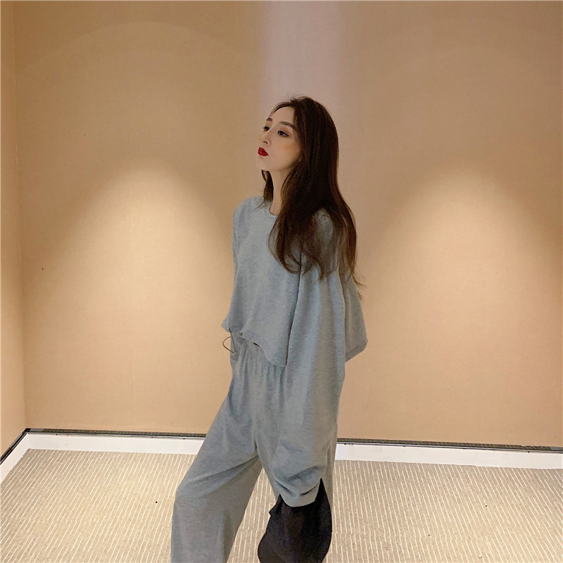 2019秋季套裝女短款長袖寬松T恤+高腰顯瘦休閑運動褲子1入