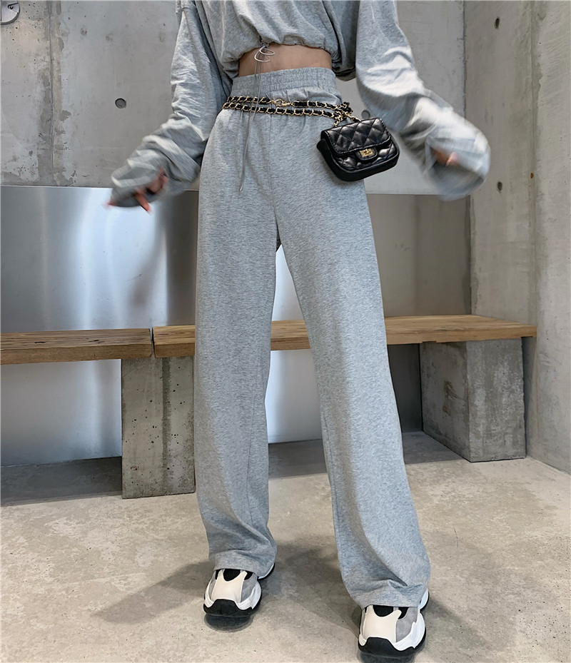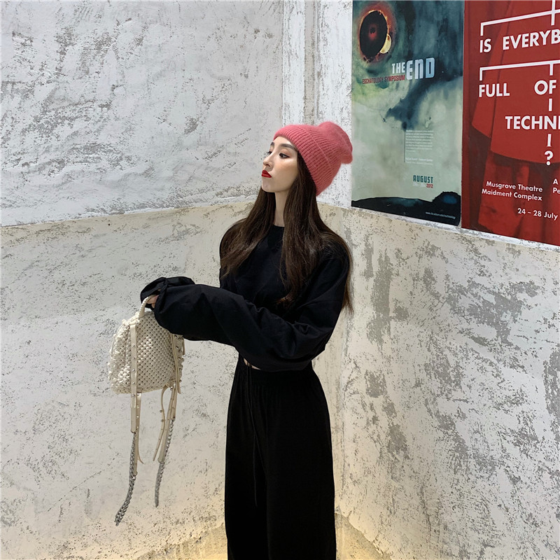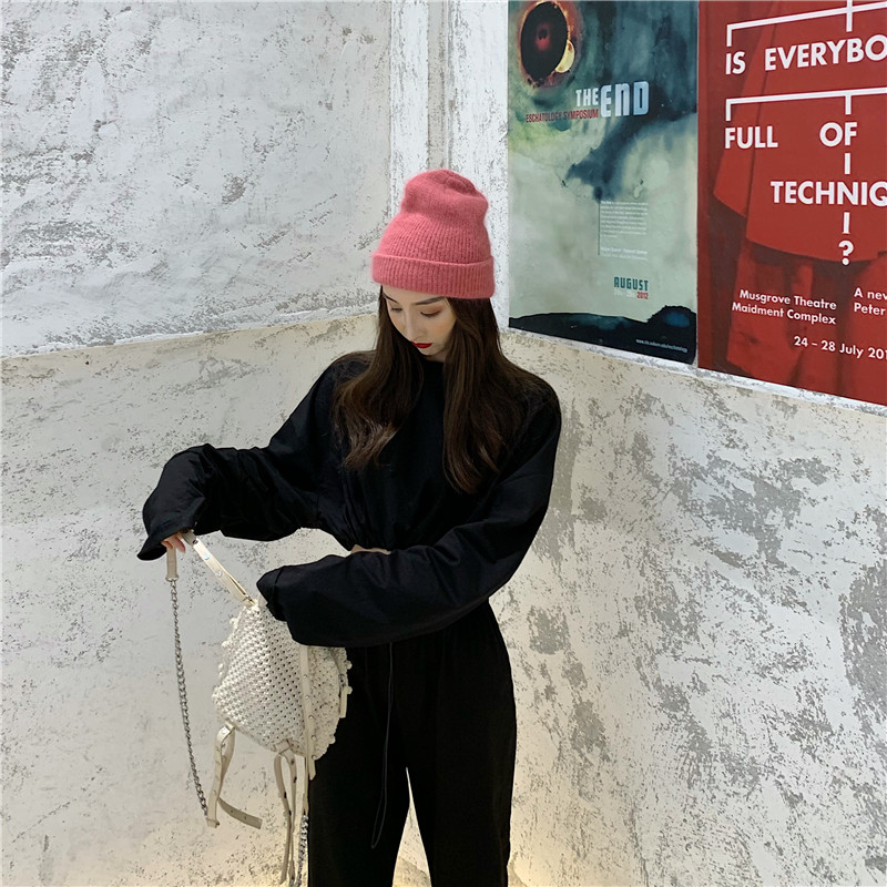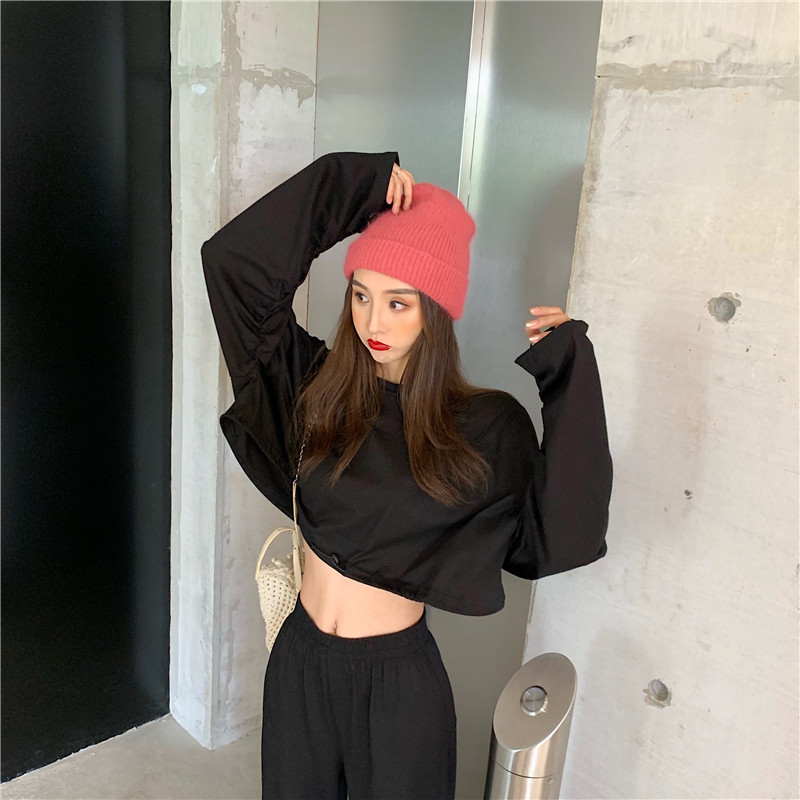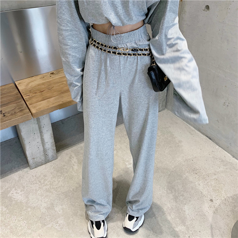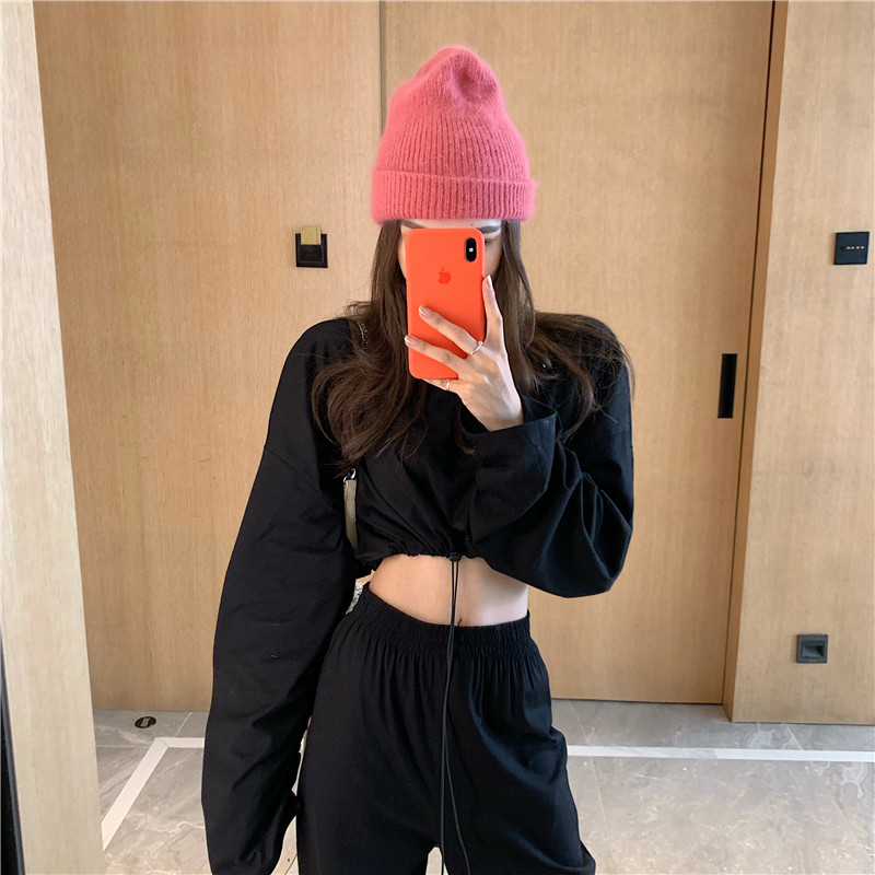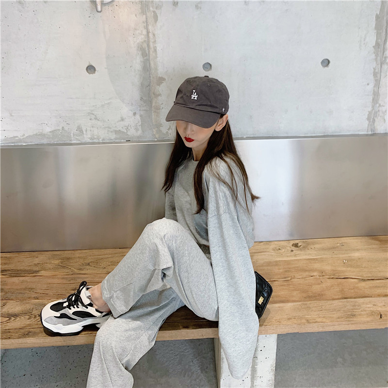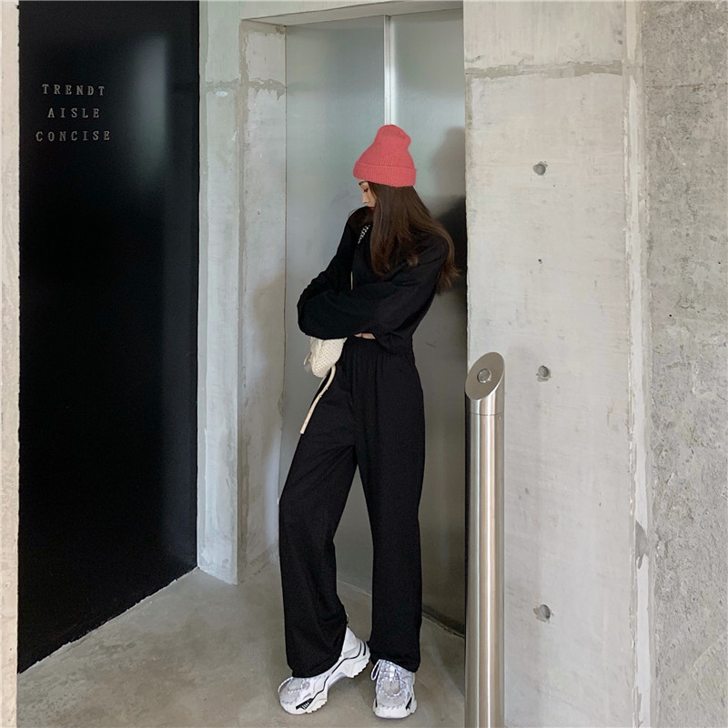 2019秋季套裝女短款長袖寬松T恤+高腰顯瘦休閑運動褲子1入