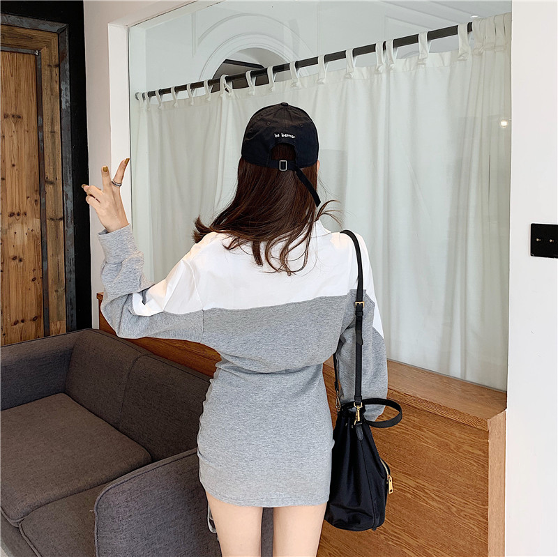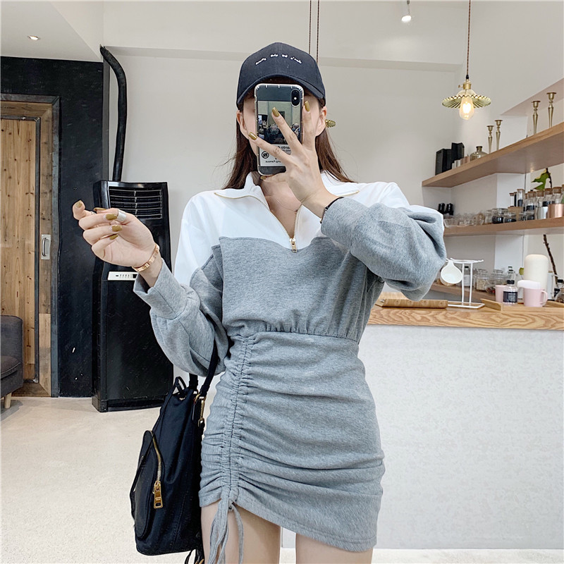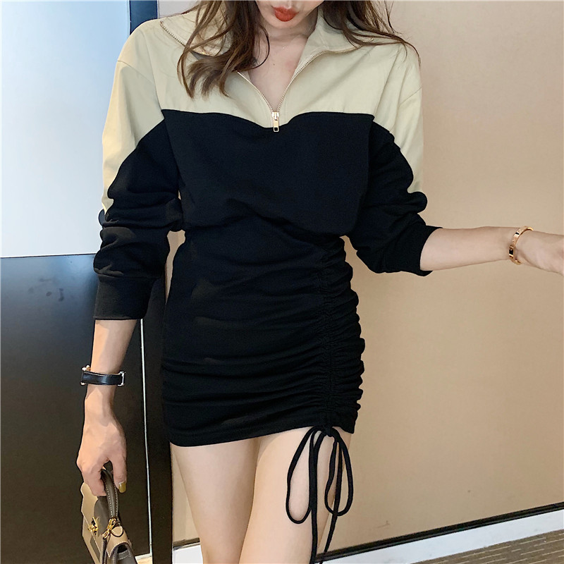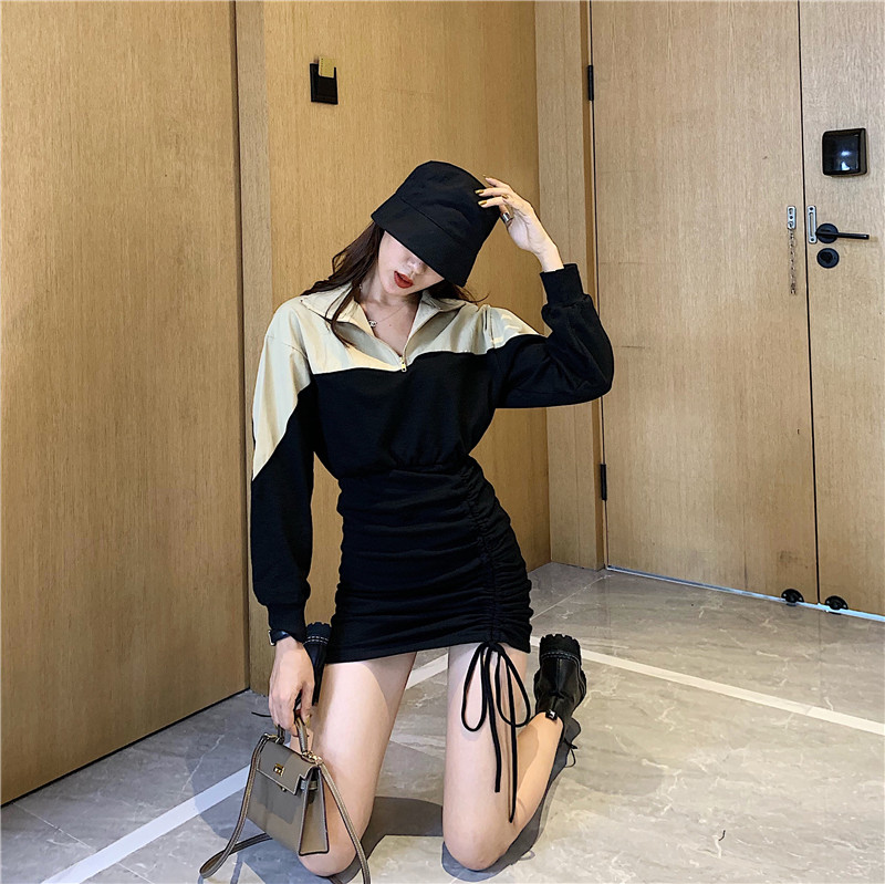2019年港風拼接翻領氣質修身性感抽繩連衣裙1入