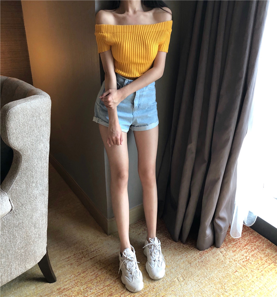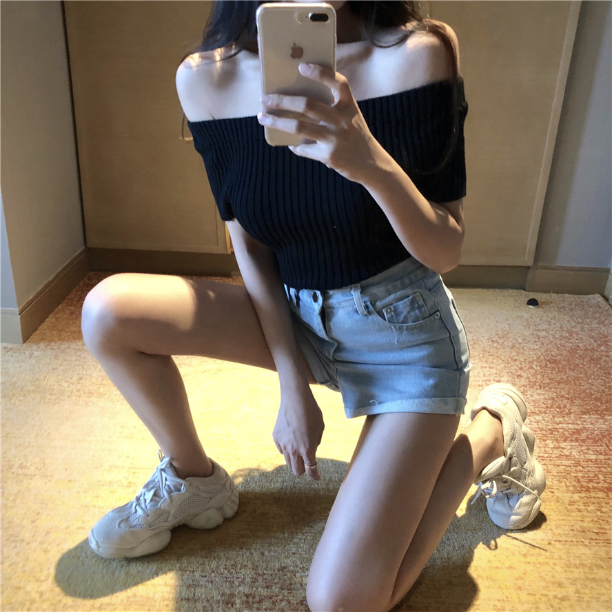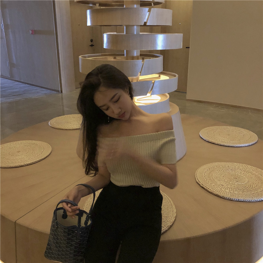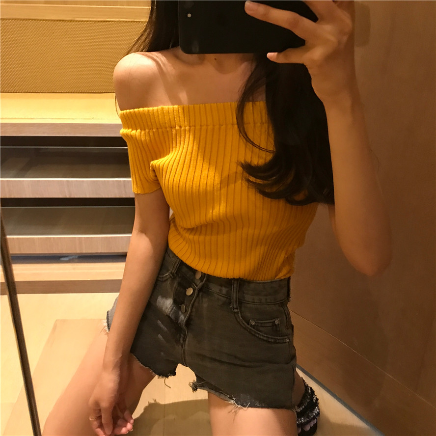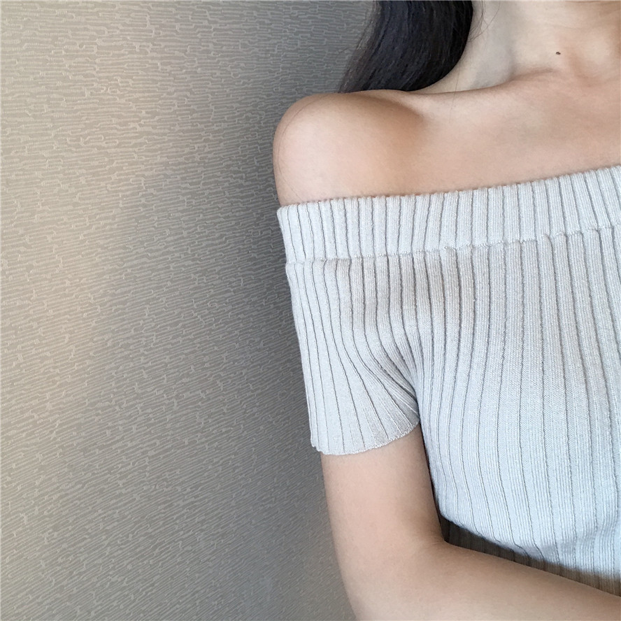 風一字肩短袖修身針織衫女夏季百搭漏鎖骨顯瘦上衣1入