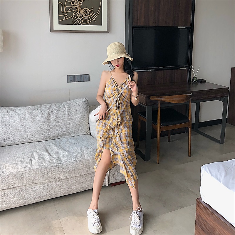 風格子抽帶格紋褶皺不規則吊帶連衣裙女夏季新款1入