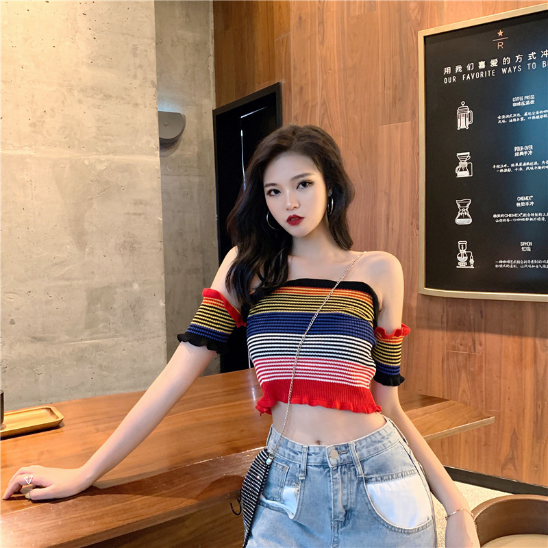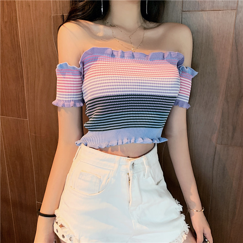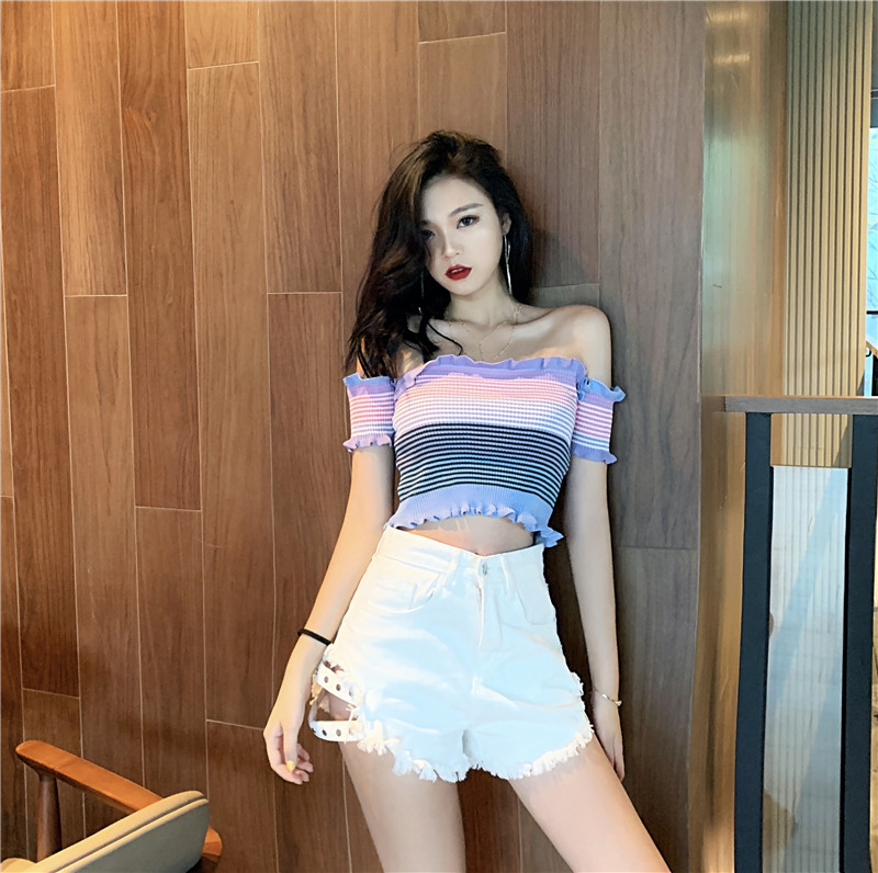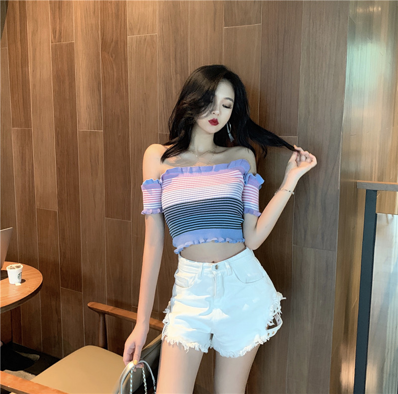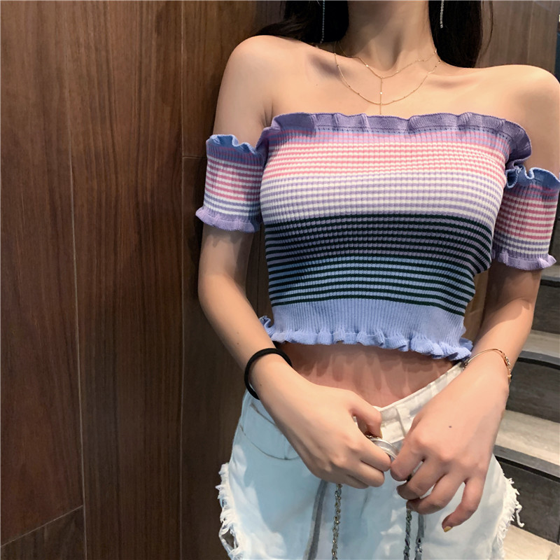 風一字肩木耳邊百搭短款條紋修身短袖針織衫上衣女1入
