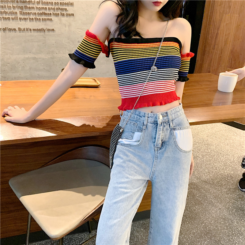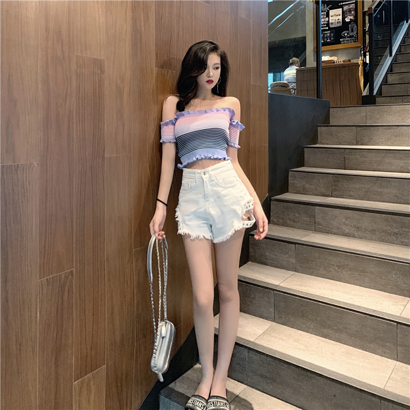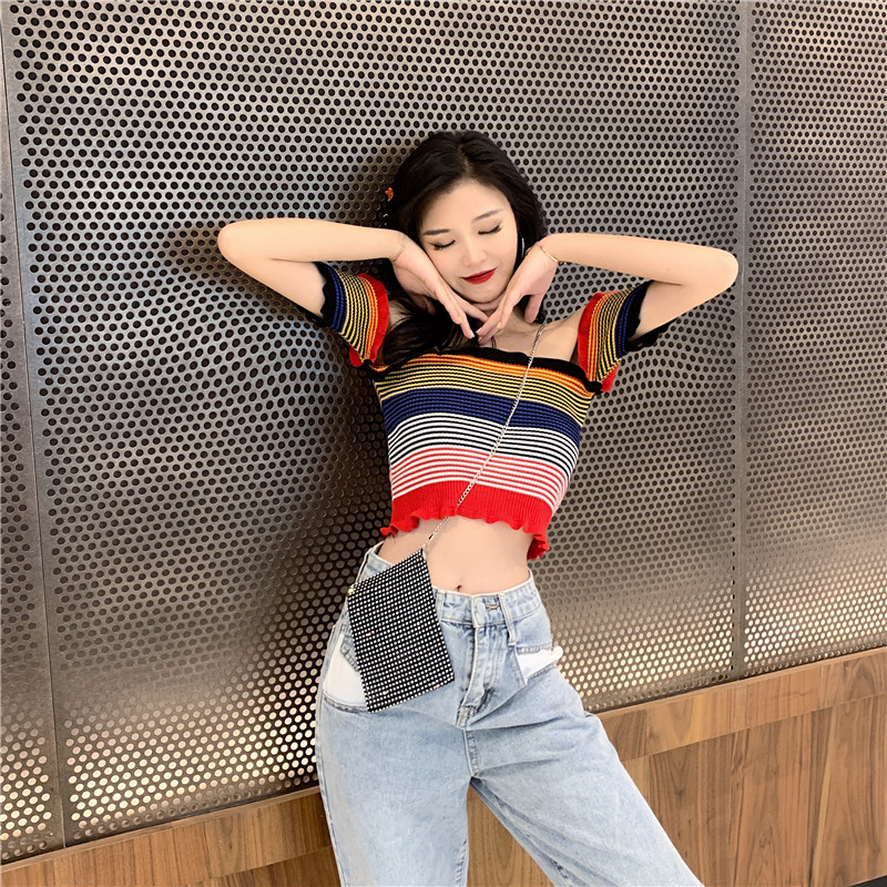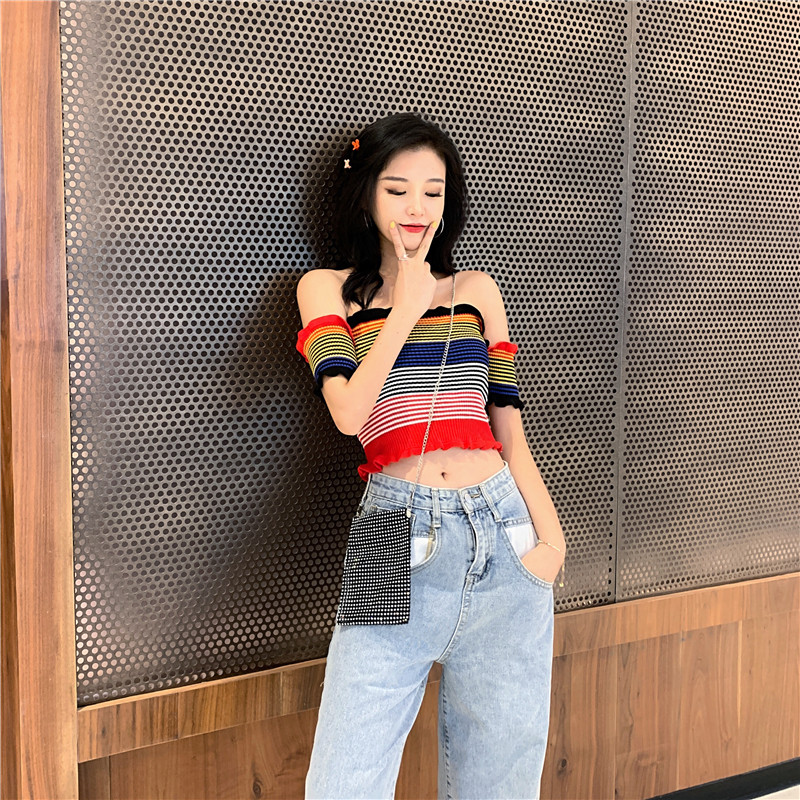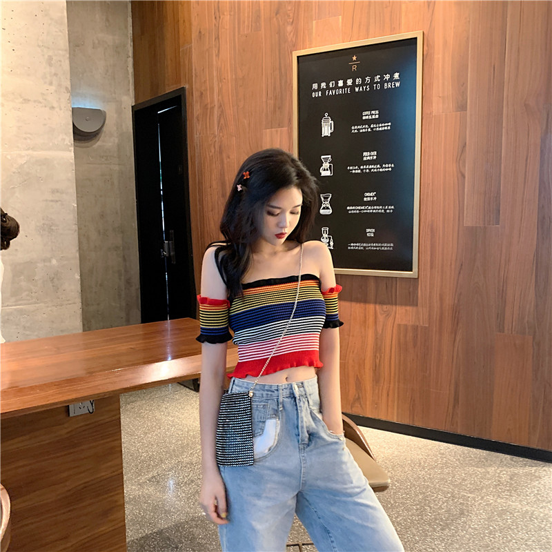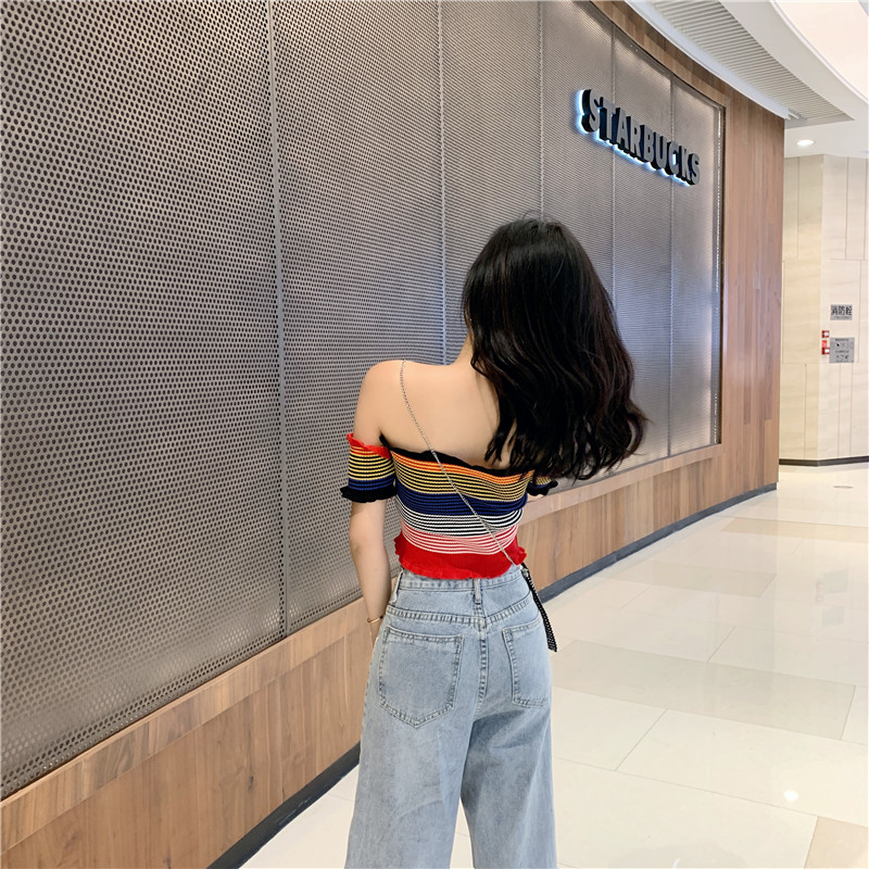 風一字肩木耳邊百搭短款條紋修身短袖針織衫上衣女1入