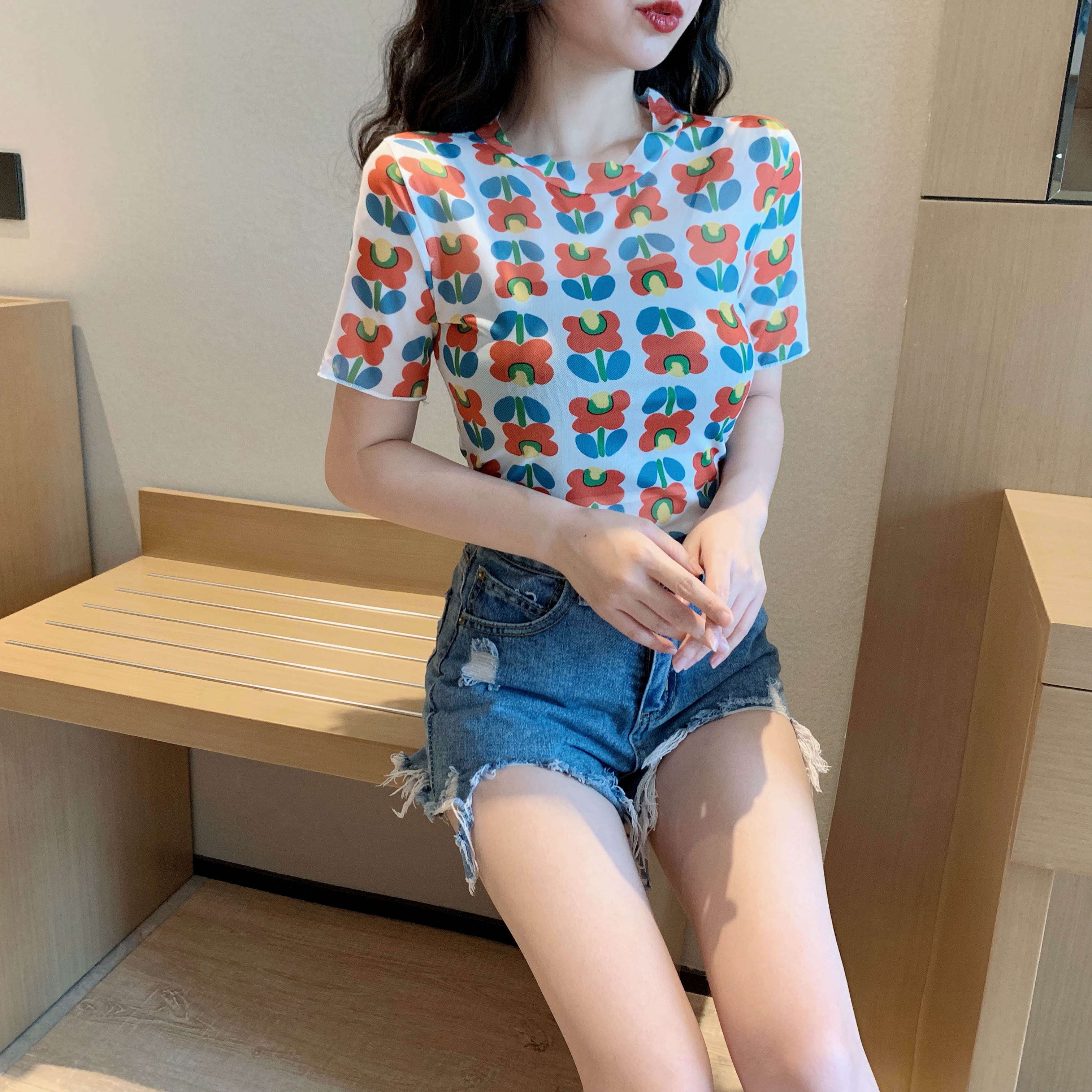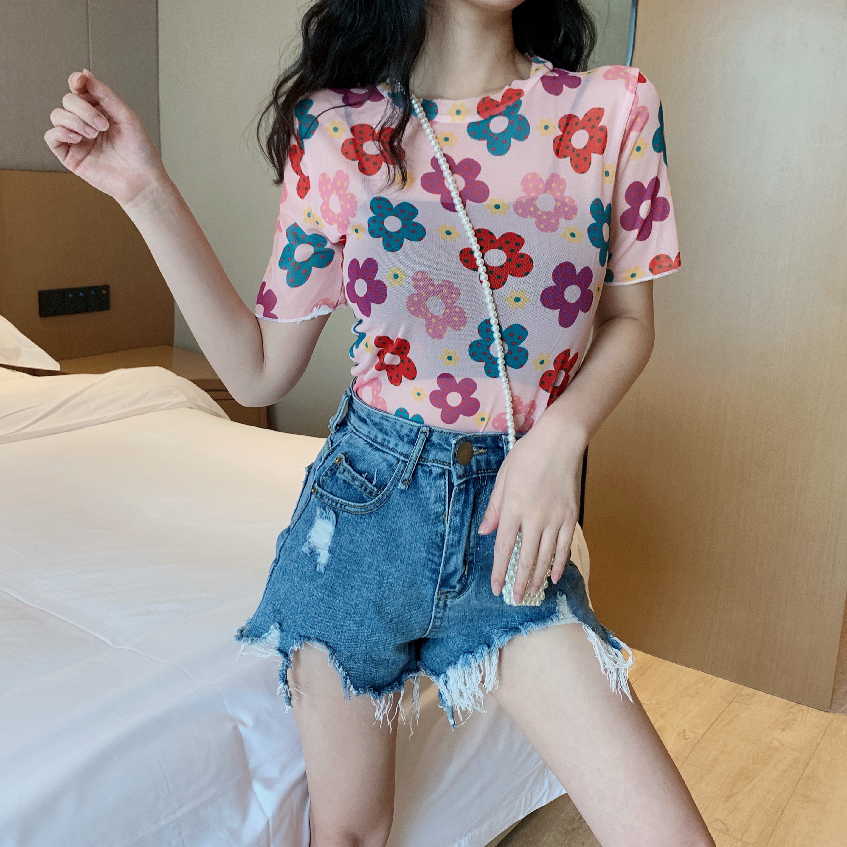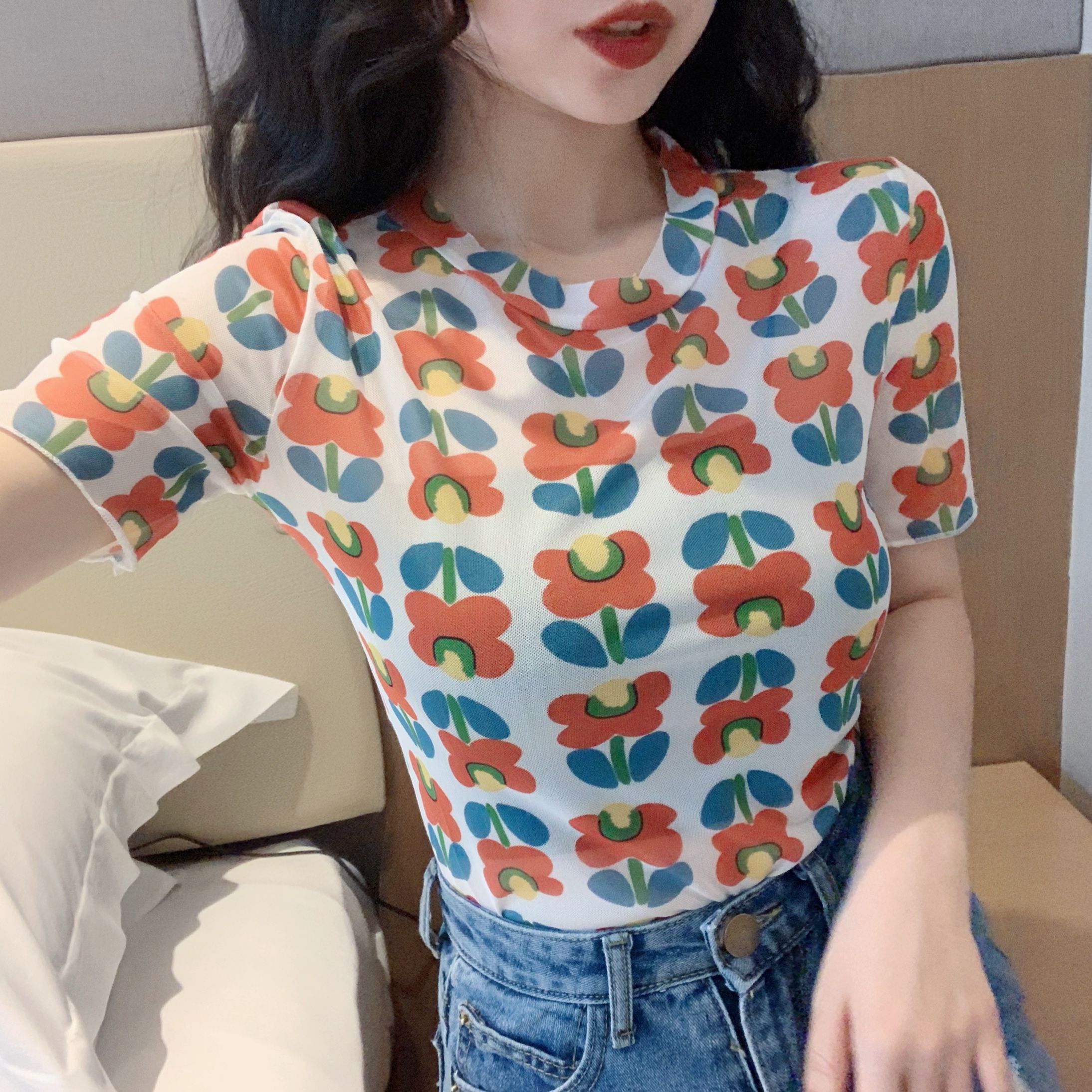 風t恤女夏裝網紅花朵修身打底衫薄款防曬網紗上衣女1入