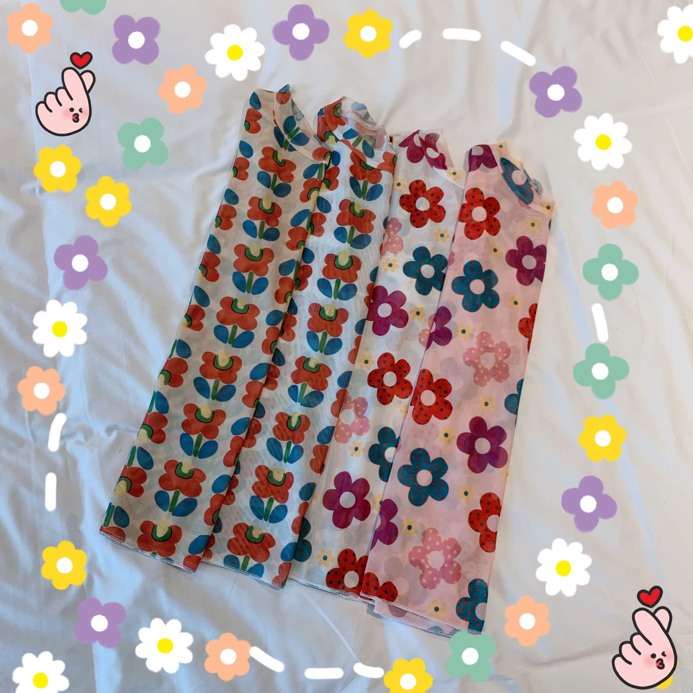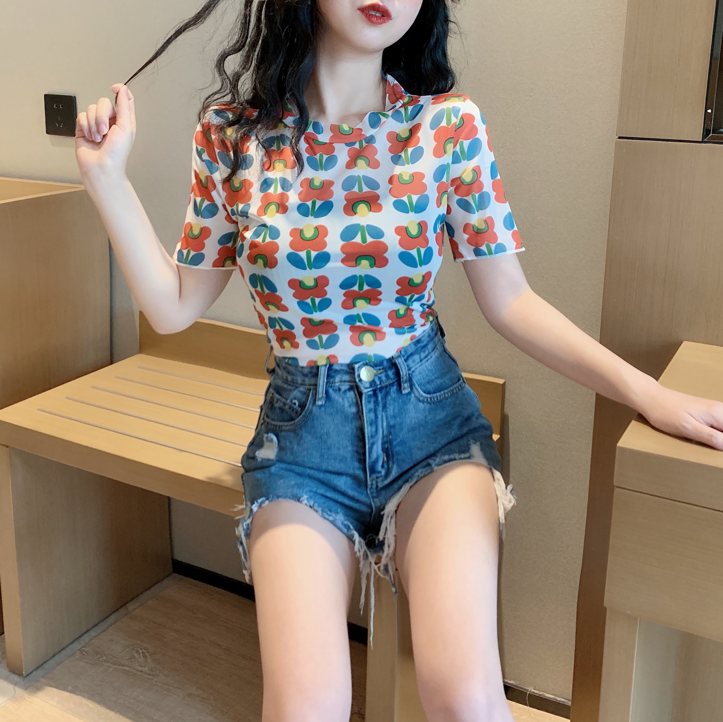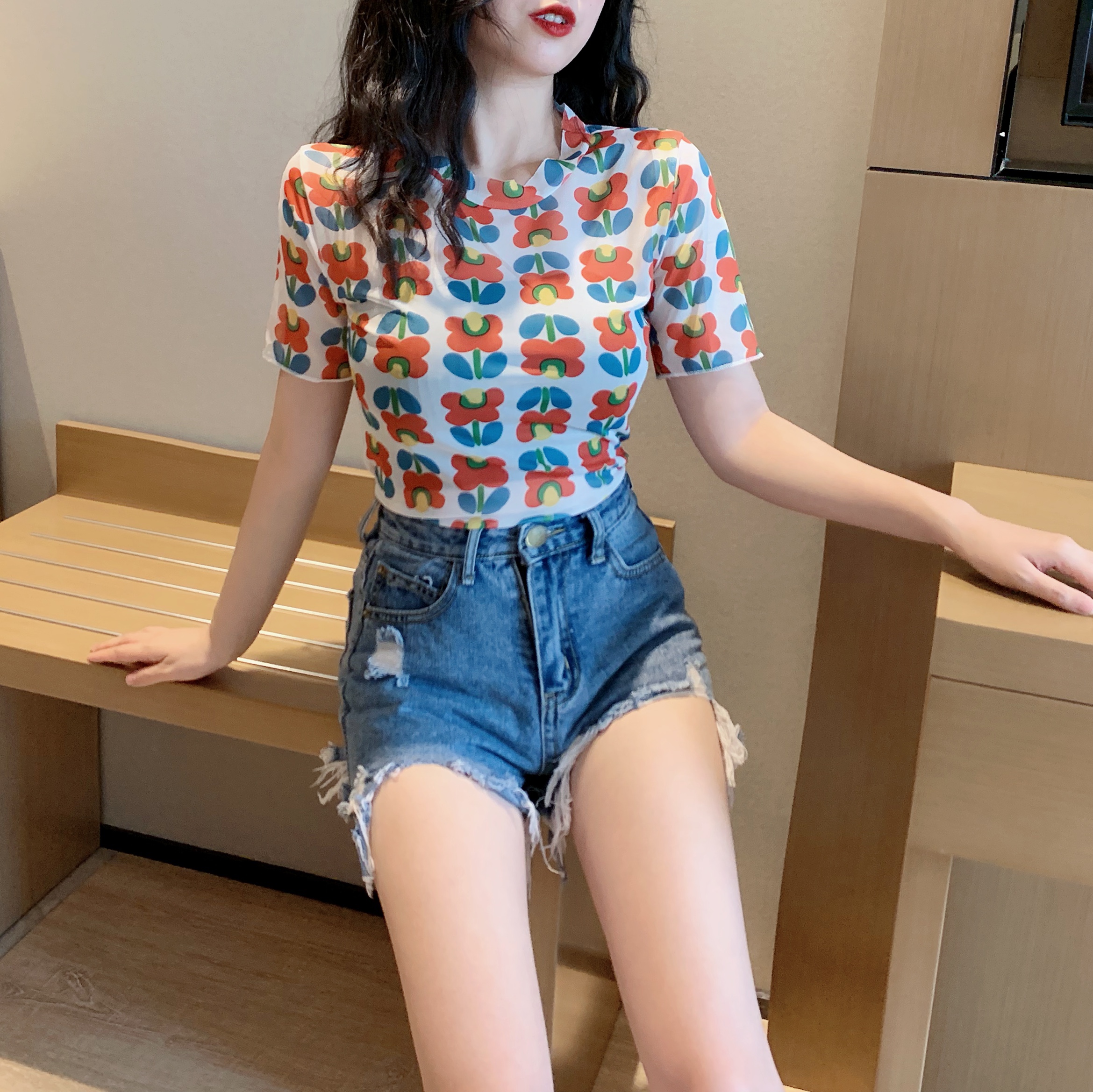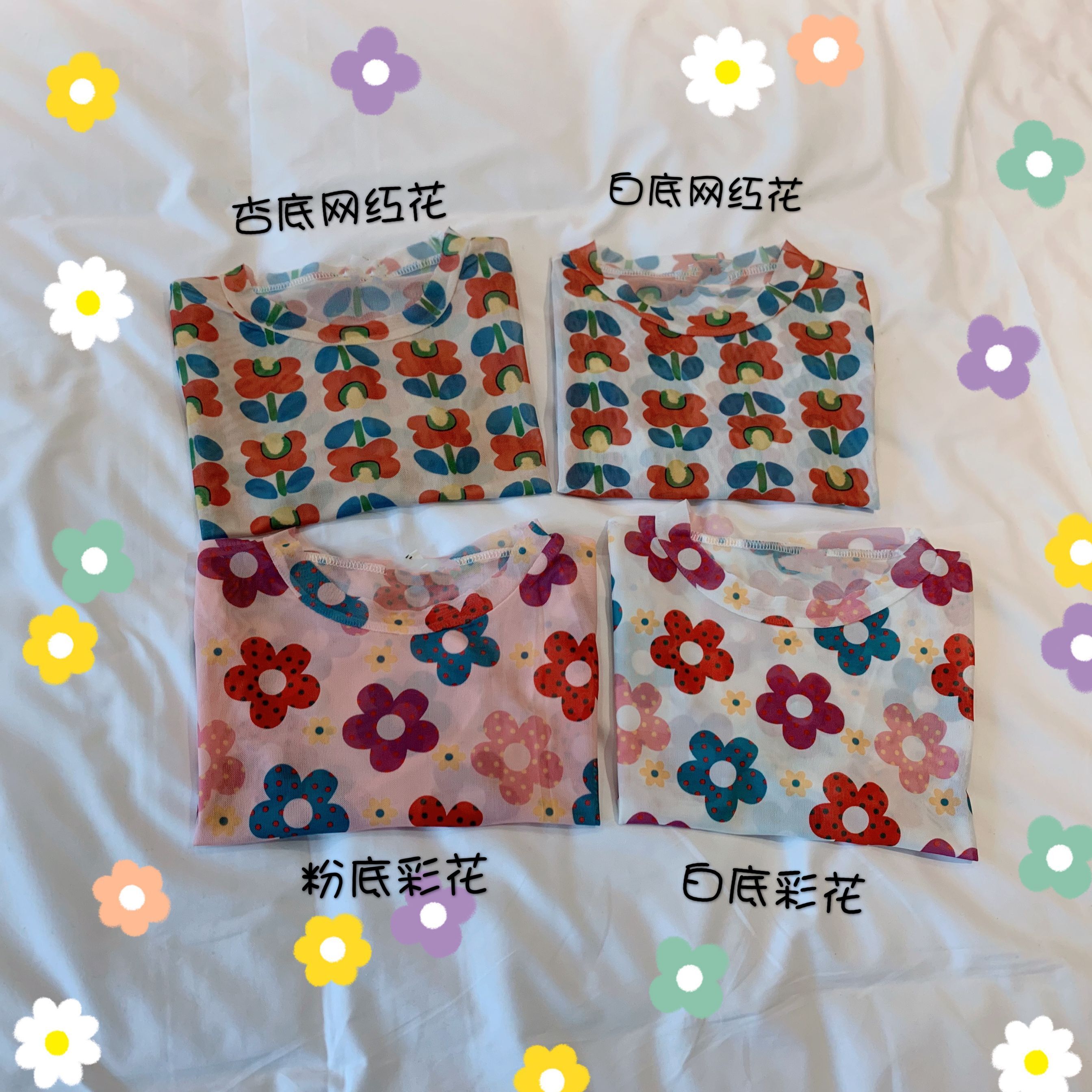 風t恤女夏裝網紅花朵修身打底衫薄款防曬網紗上衣女1入