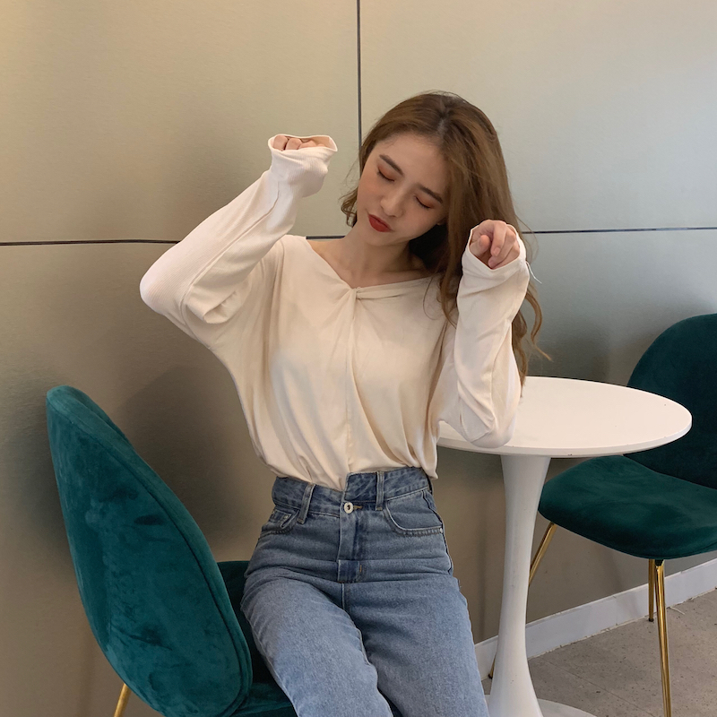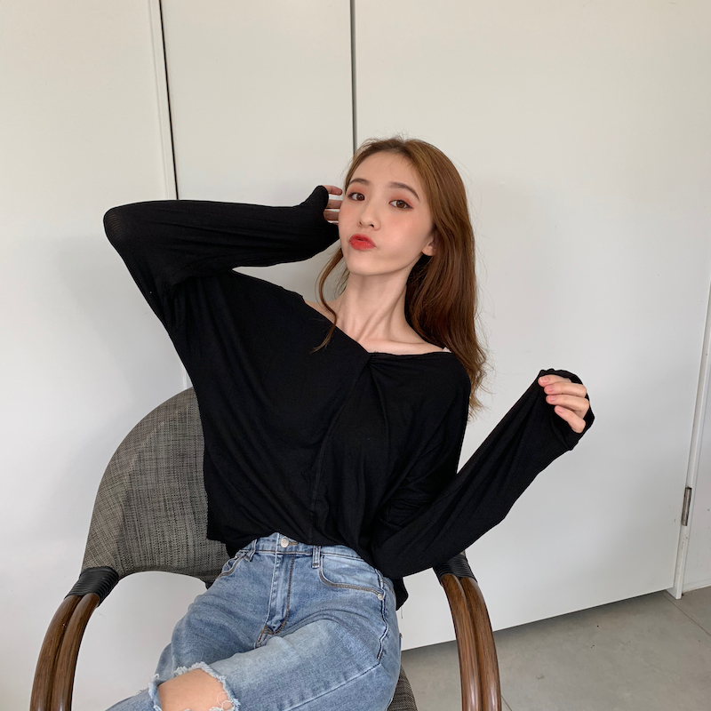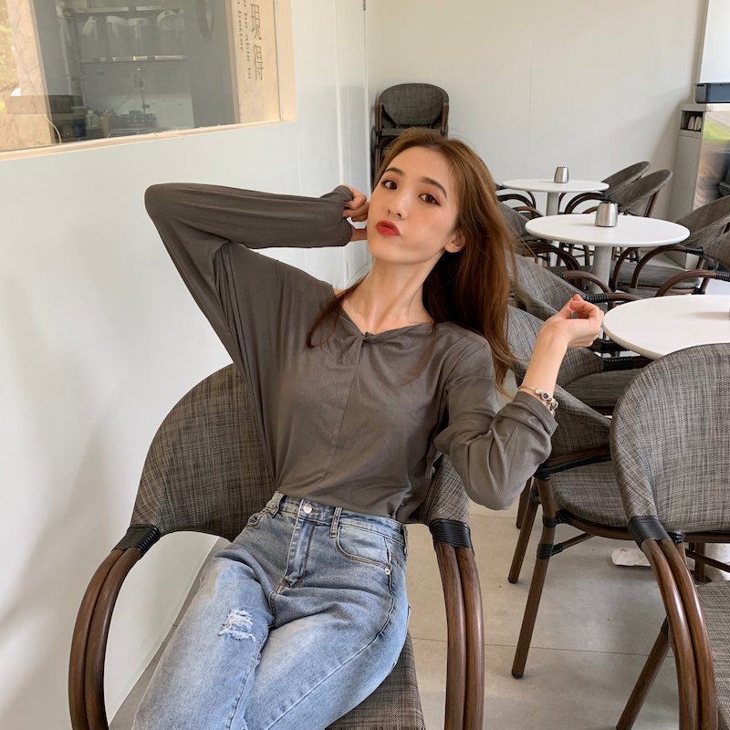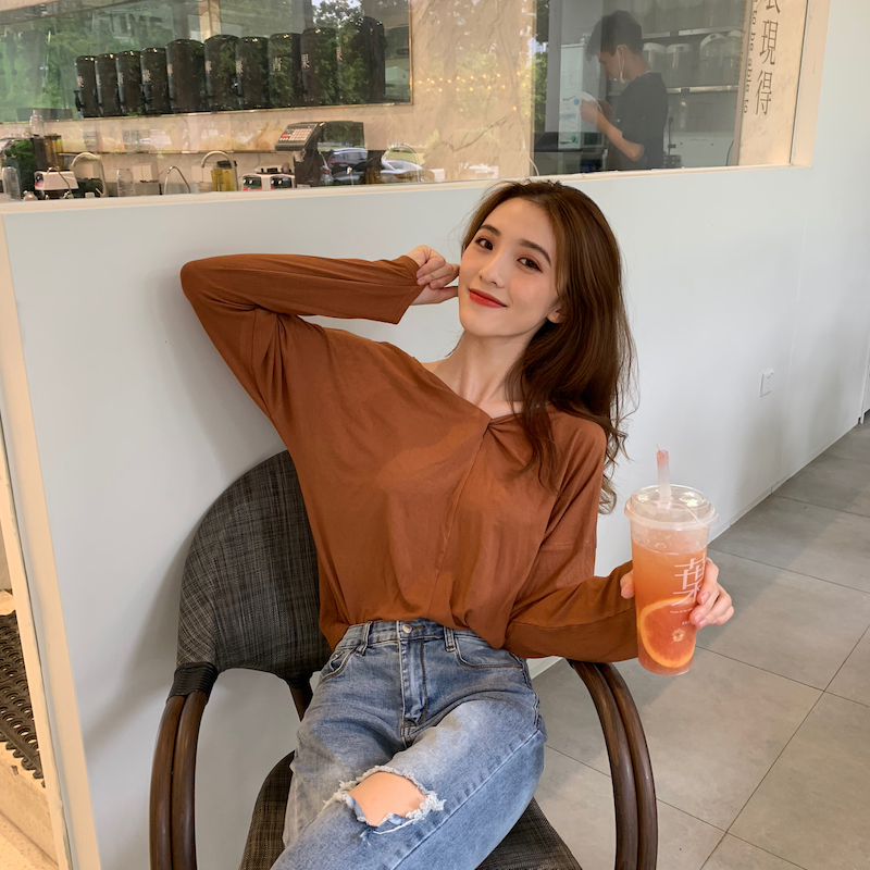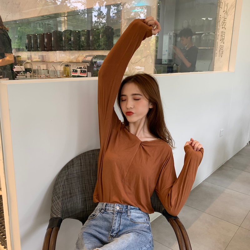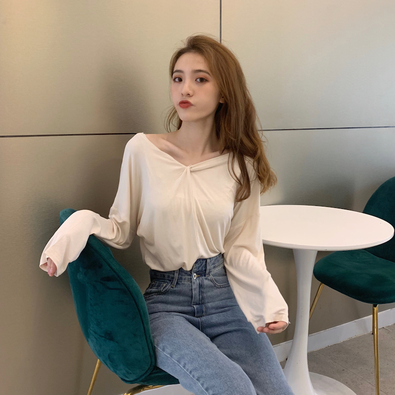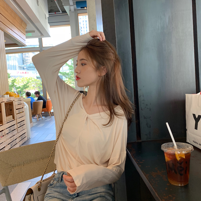 韓版寬松套頭打底長袖T恤chic慵懶女設計感上衣1入