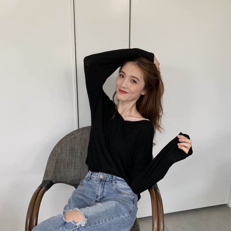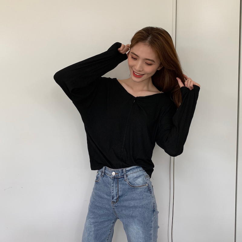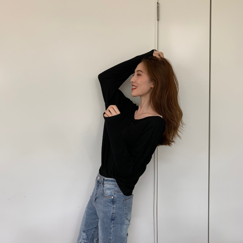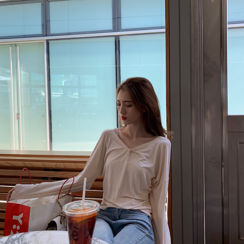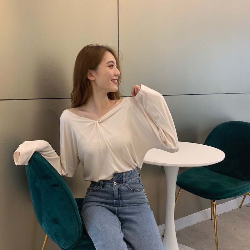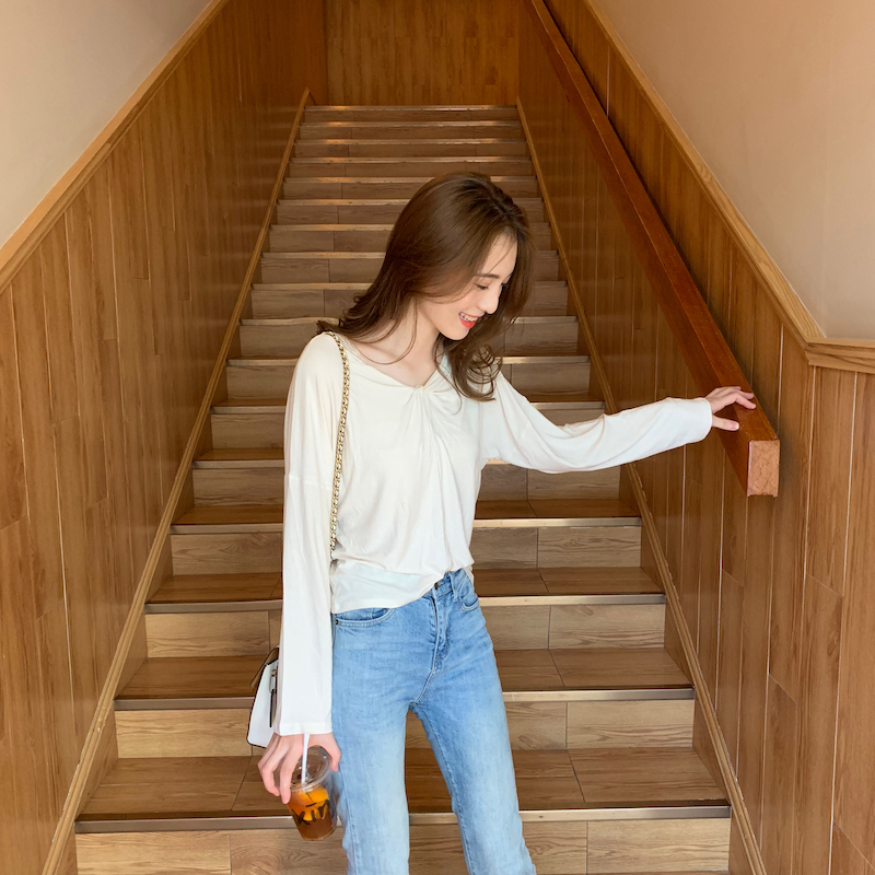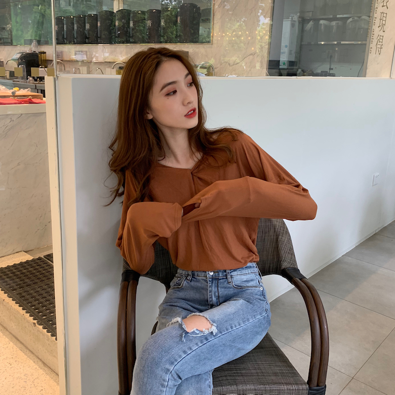 韓版寬松套頭打底長袖T恤chic慵懶女設計感上衣1入