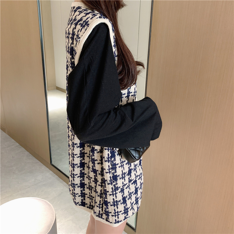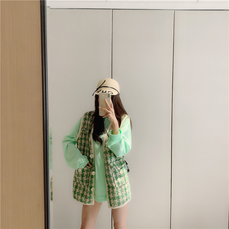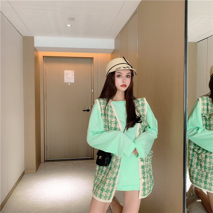 韓版小香風馬甲外套馬夾女倆件套網紅百搭寬松長袖T恤衛衣套裝女1入