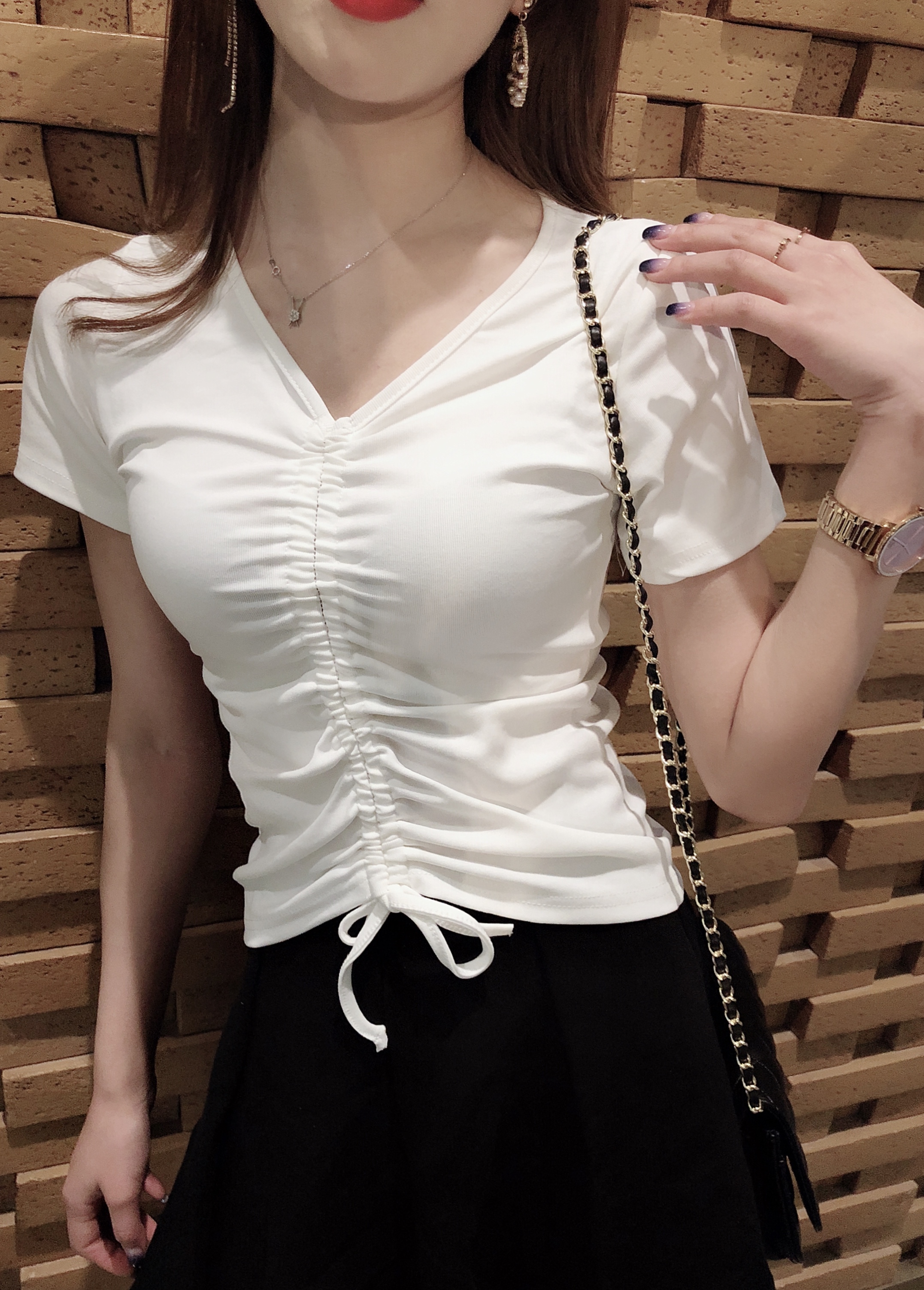 韓版時尚潮流直簡高腰修身抽繩褶皺V領短袖T恤女夏季2019新款上衣1入